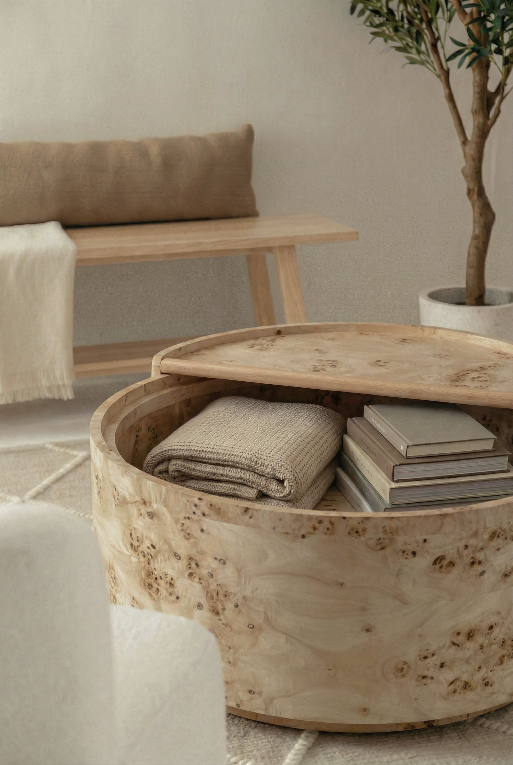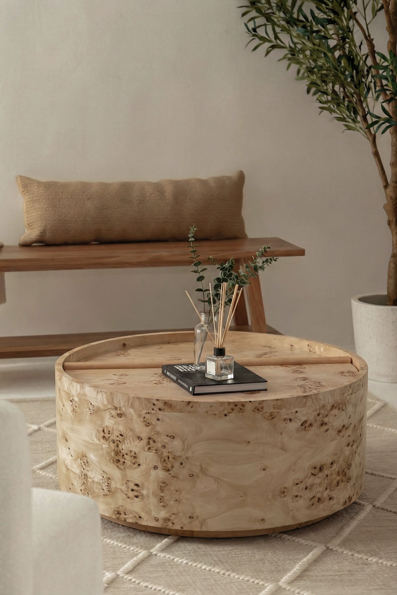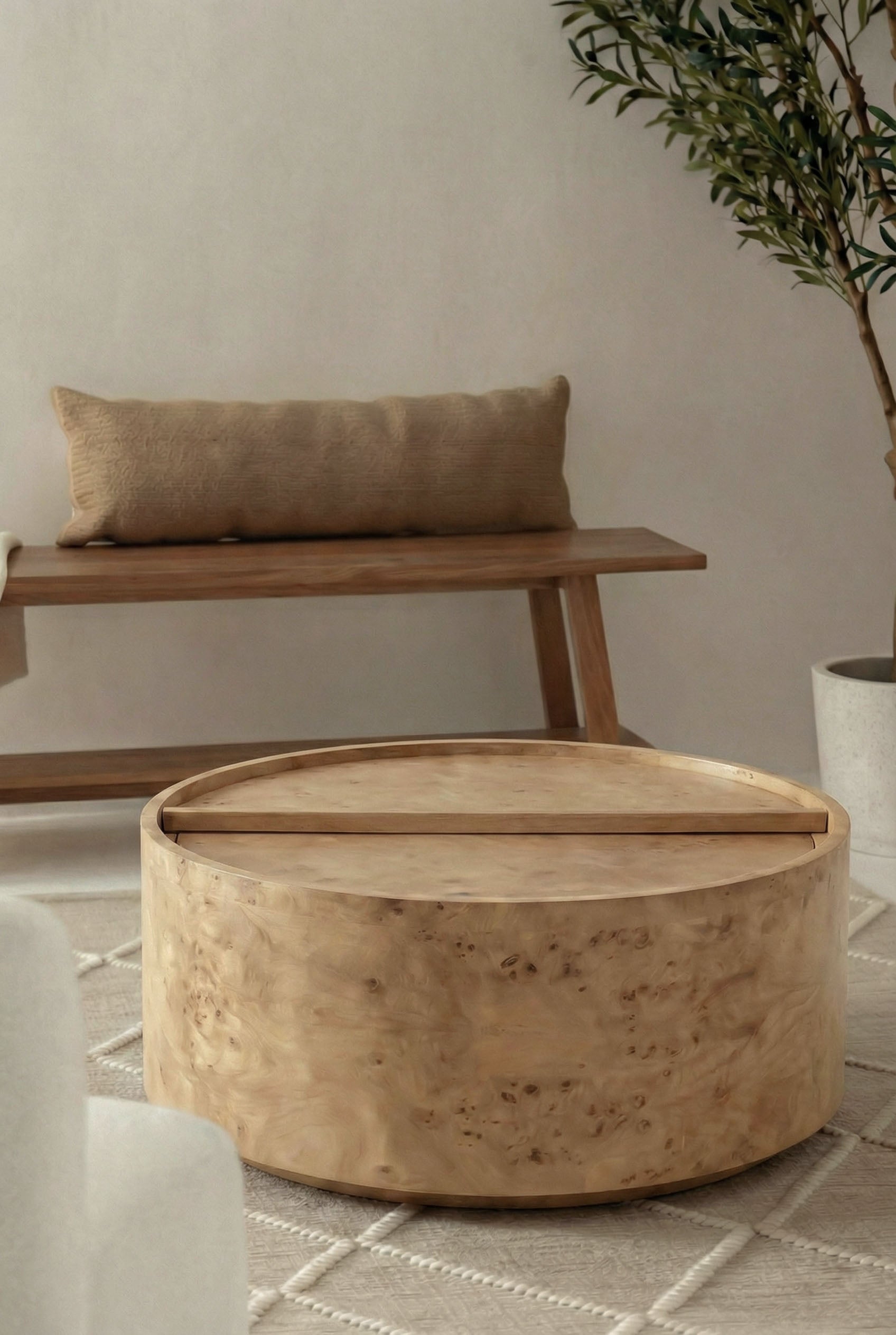 Make your living room feel instantly more curated with this lightwood coffee table, crafted in a sculptural round silhouette that brings softness and quiet luxury to your space. The beautifully figured wood look adds natural character, while the clever lift top design opens to reveal hidden storage, perfect for keeping remotes, coasters, books, and everyday clutter neatly out of sight. With a smooth surface for styling trays and décor, it creates a calm centerpiece that looks refined from every angle and keeps your home feeling effortlessly tidy.