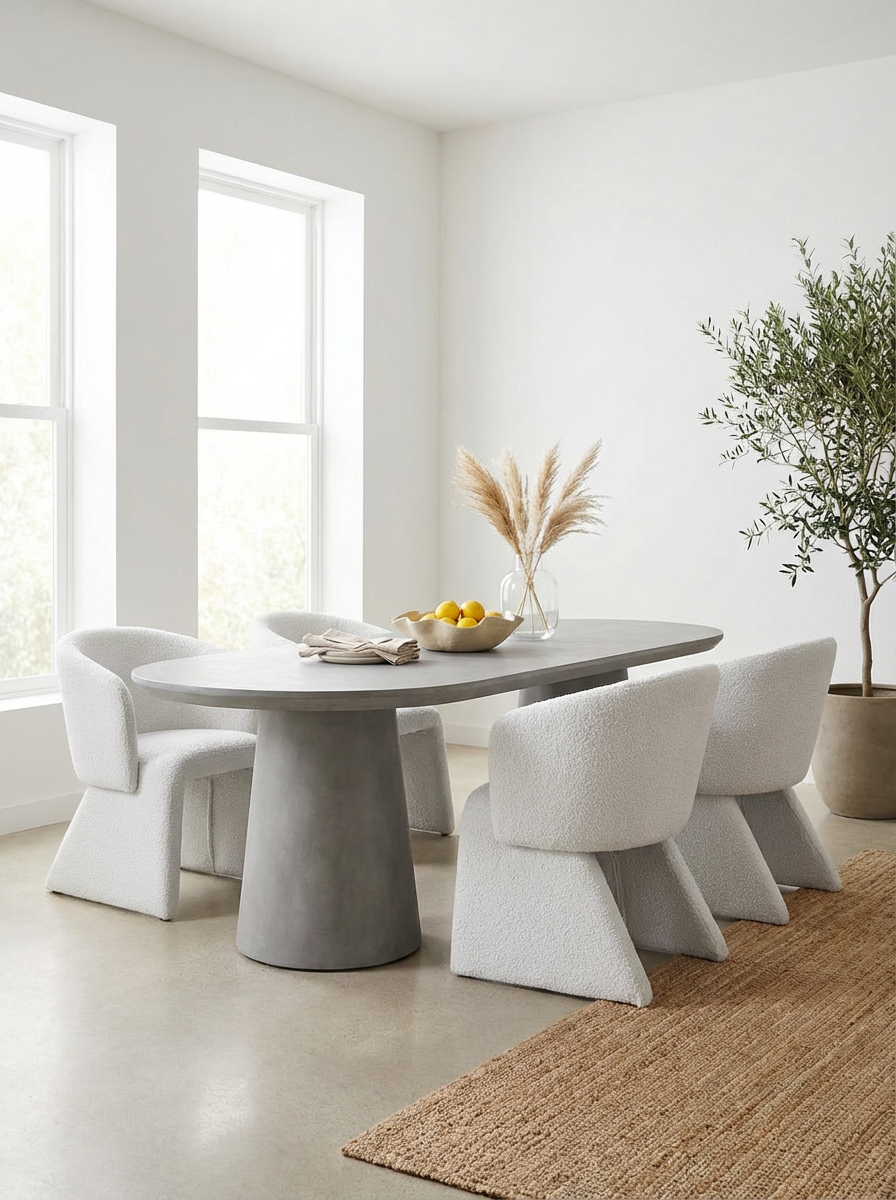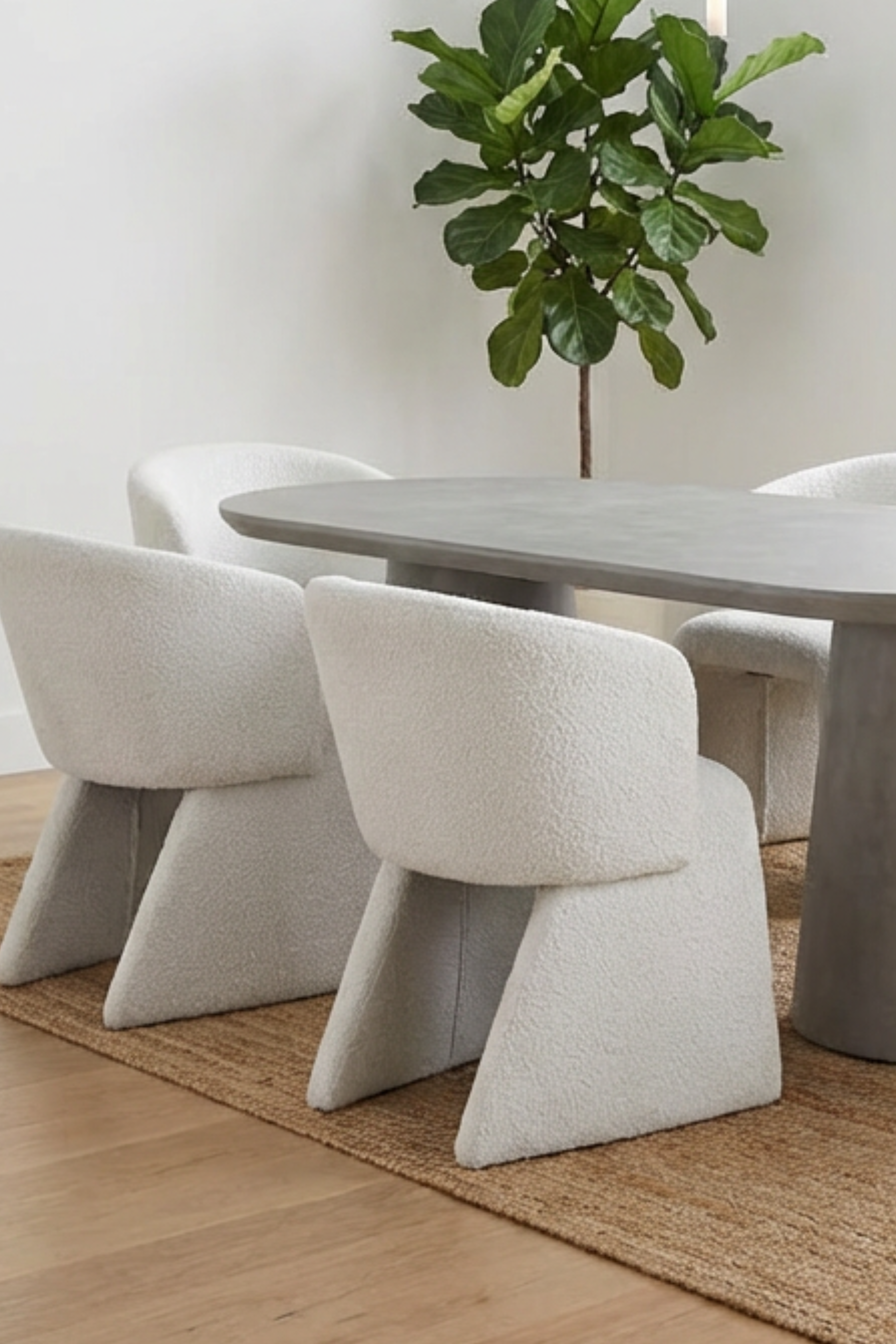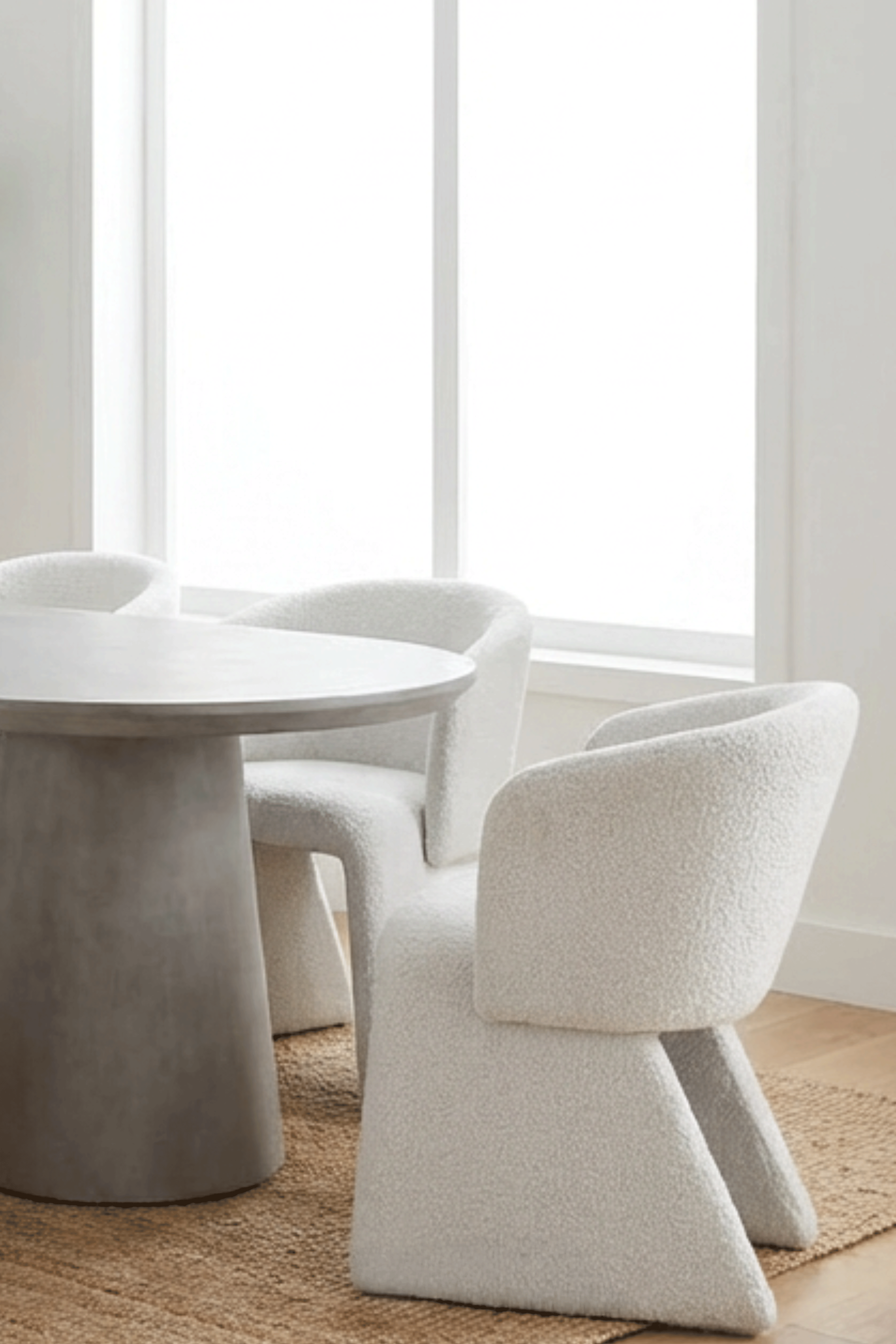 Make every dining moment feel elevated with a chair that doubles as a design statement. Upholstered in soft off-white boucle, its fully wrapped silhouette flows in sculptural curves, offering both comfort and modern artistry. The bold arched legs and enveloping backrest create a striking balance of shape and texture, while the cozy boucle fabric adds warmth and tactile appeal. Perfect for contemporary, minimalist, or designer-inspired interiors, this chair brings sophistication and style to your dining space.
