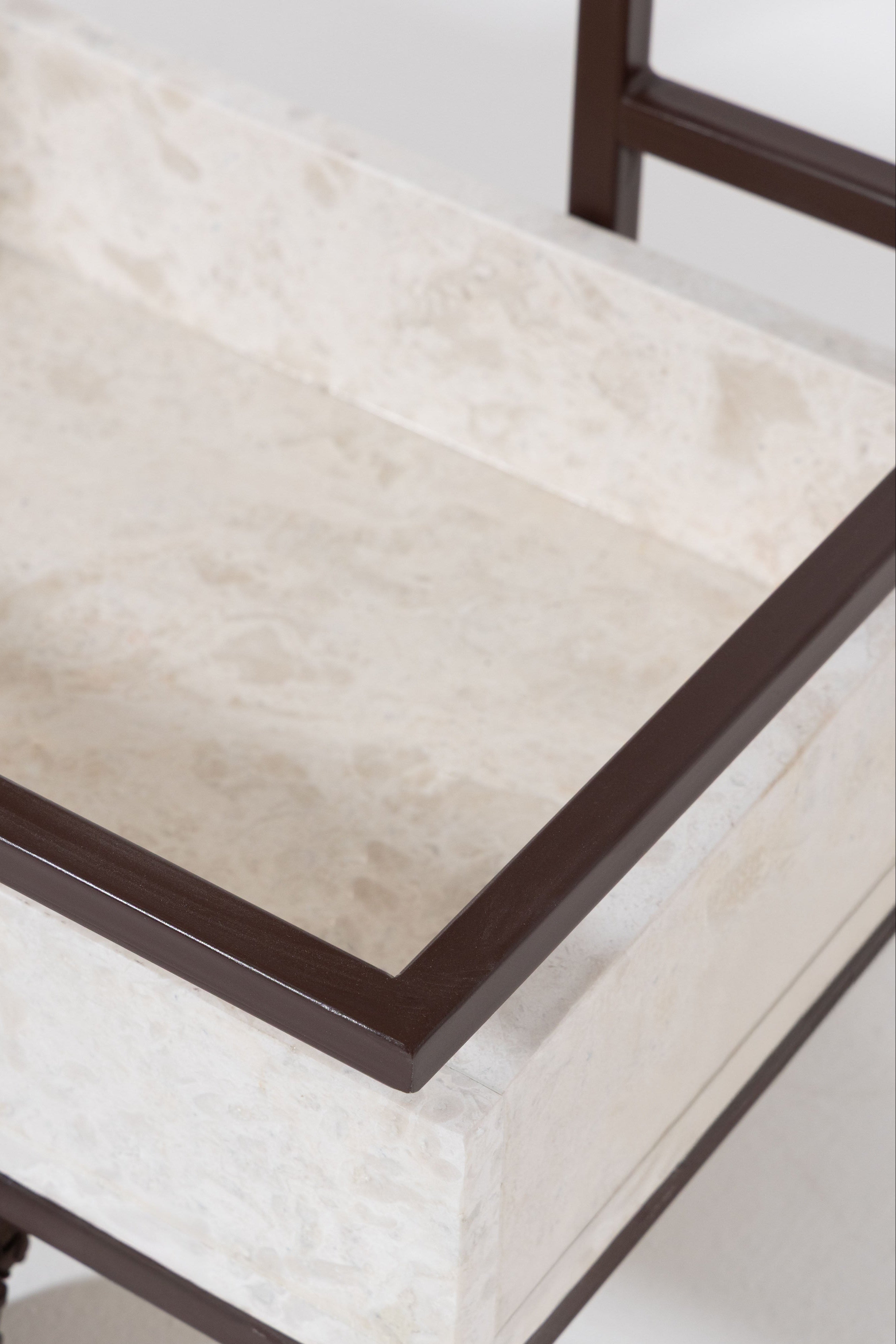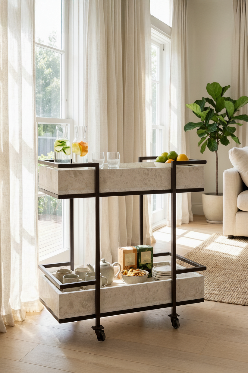 This two-tier trolley combines warm stone shelves with a slim metal frame in a clean, geometric design. Rolling smoothly on fitted wheels, it moves easily for serving, storage, or display. The stone surfaces provide strength and natural variation, while the open framework keeps the look light and versatile. Its proportions suit both compact corners and entertaining spaces, making it a functional accent that blends practicality with understated character. A durable piece designed for daily use.