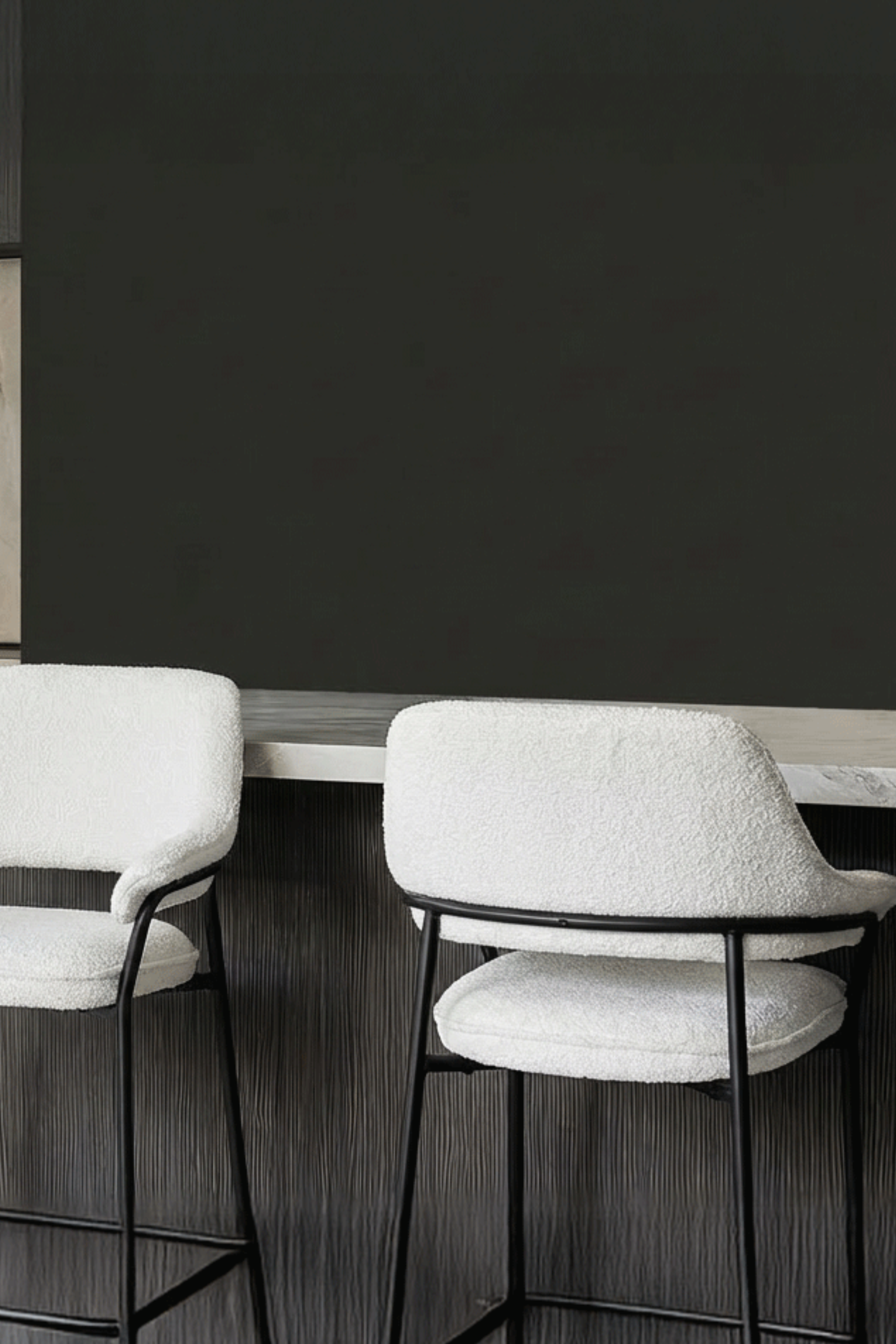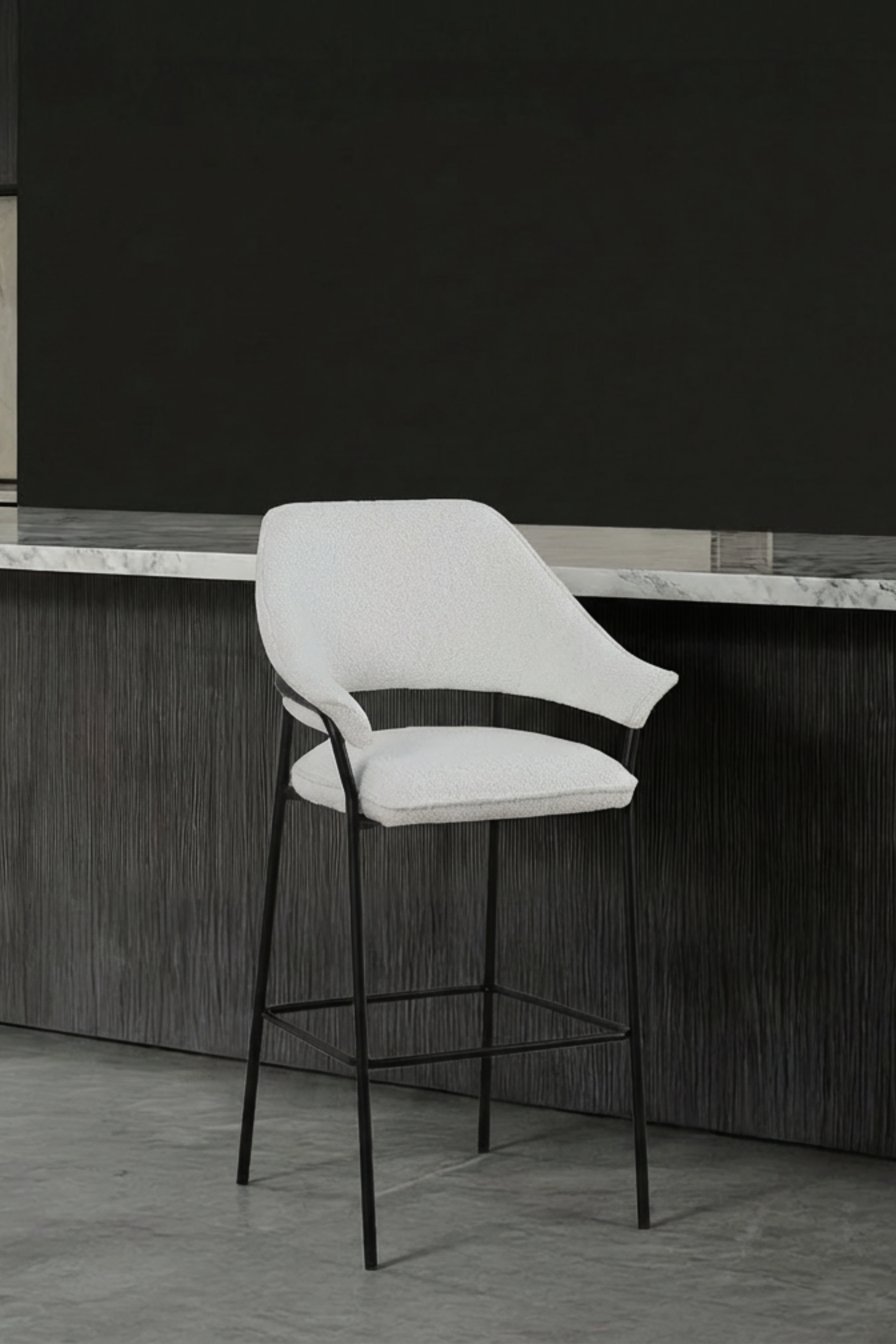 This boucle bar stool pairs a curved wraparound back and cushioned seat with a sturdy black powder-coated metal frame. Soft white boucle adds tactile comfort, while slim arms and a supportive footrest keep you relaxed at kitchen islands or home bars. Durable tubing and neat tailoring suit modern and contemporary spaces. Padded seat adds comfort; floor glides shield floors. Built for stability, it tucks beneath counters well.