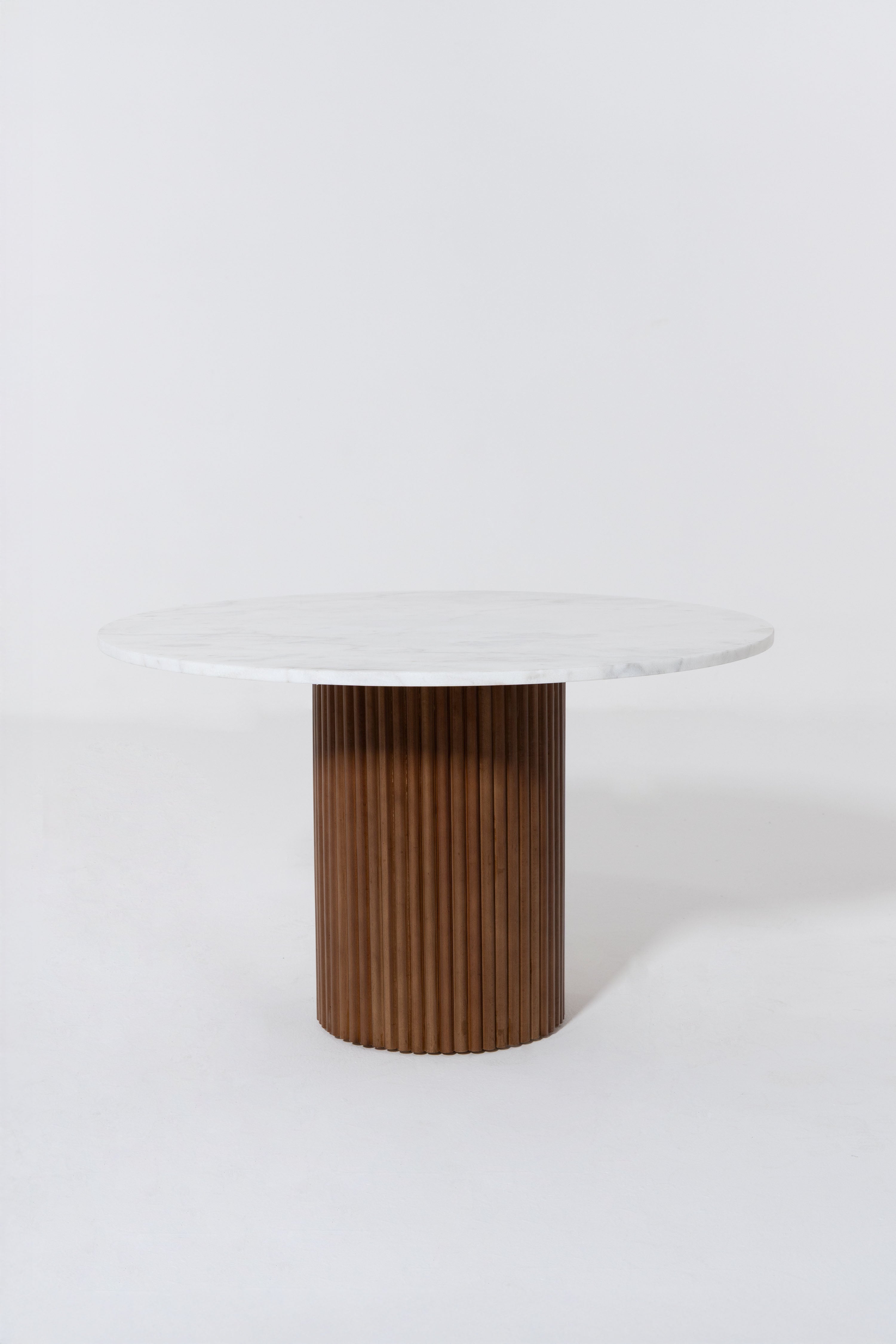A round Corian White Marble top with soft grey veining sits over a solid wood base, pairing cool stone with warm grain and strong support. Edges are smoothly finished for comfort, and the open base keeps knee space clear. The compact footprint seats four in modern interiors, from breakfast nooks to small dining rooms. Its easy-clean surface handles daily meals and quick hosting, and the natural timber tone makes styling with upholstered or metal chairs simple. A calm focal point for daily meals.