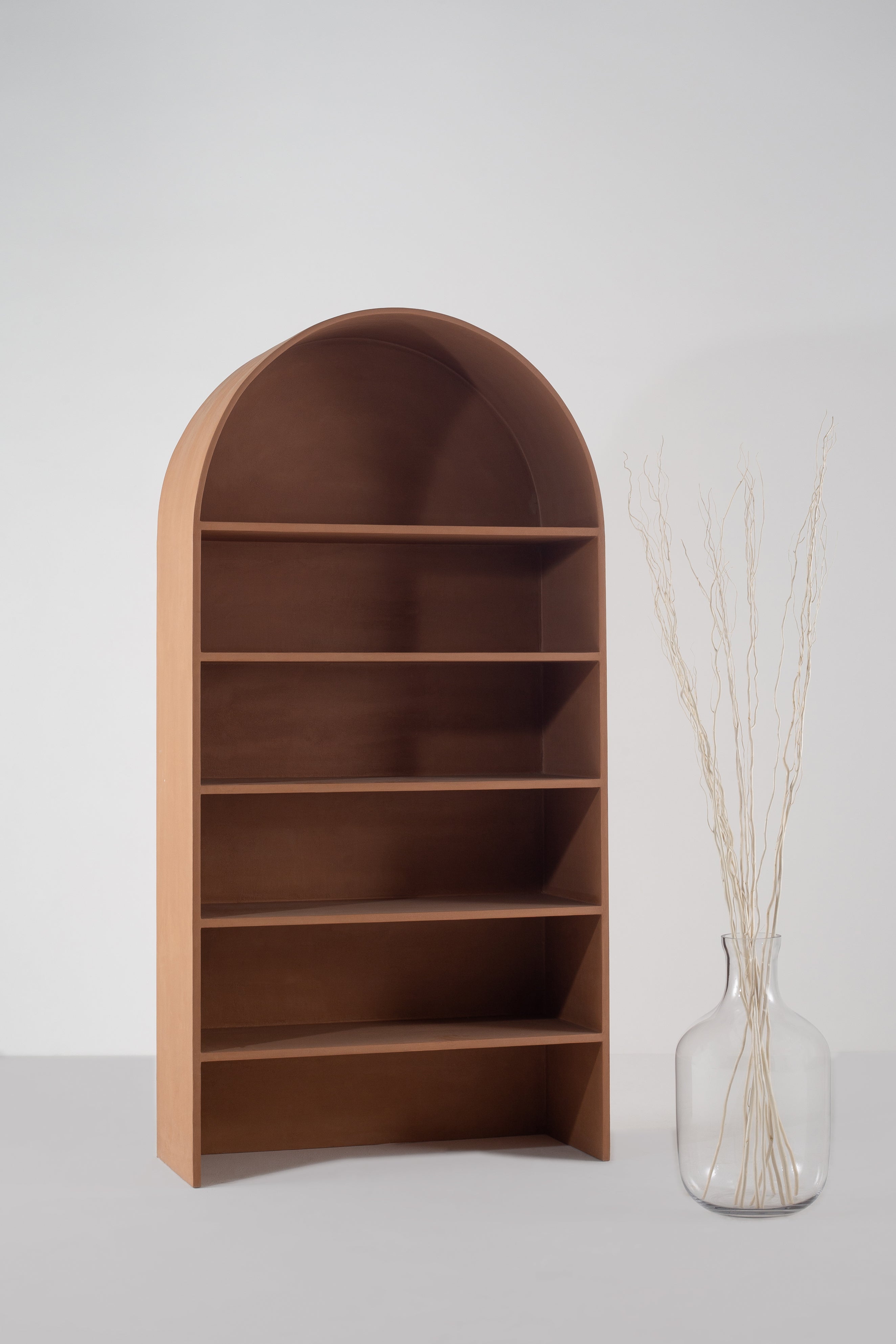 Designed to elevate your interior with sculptural elegance, this display shelf combines refined form with everyday function. Crafted from durable microconcrete, the arched silhouette introduces architectural depth while the warm mocha tone adds richness and modern character to your space.