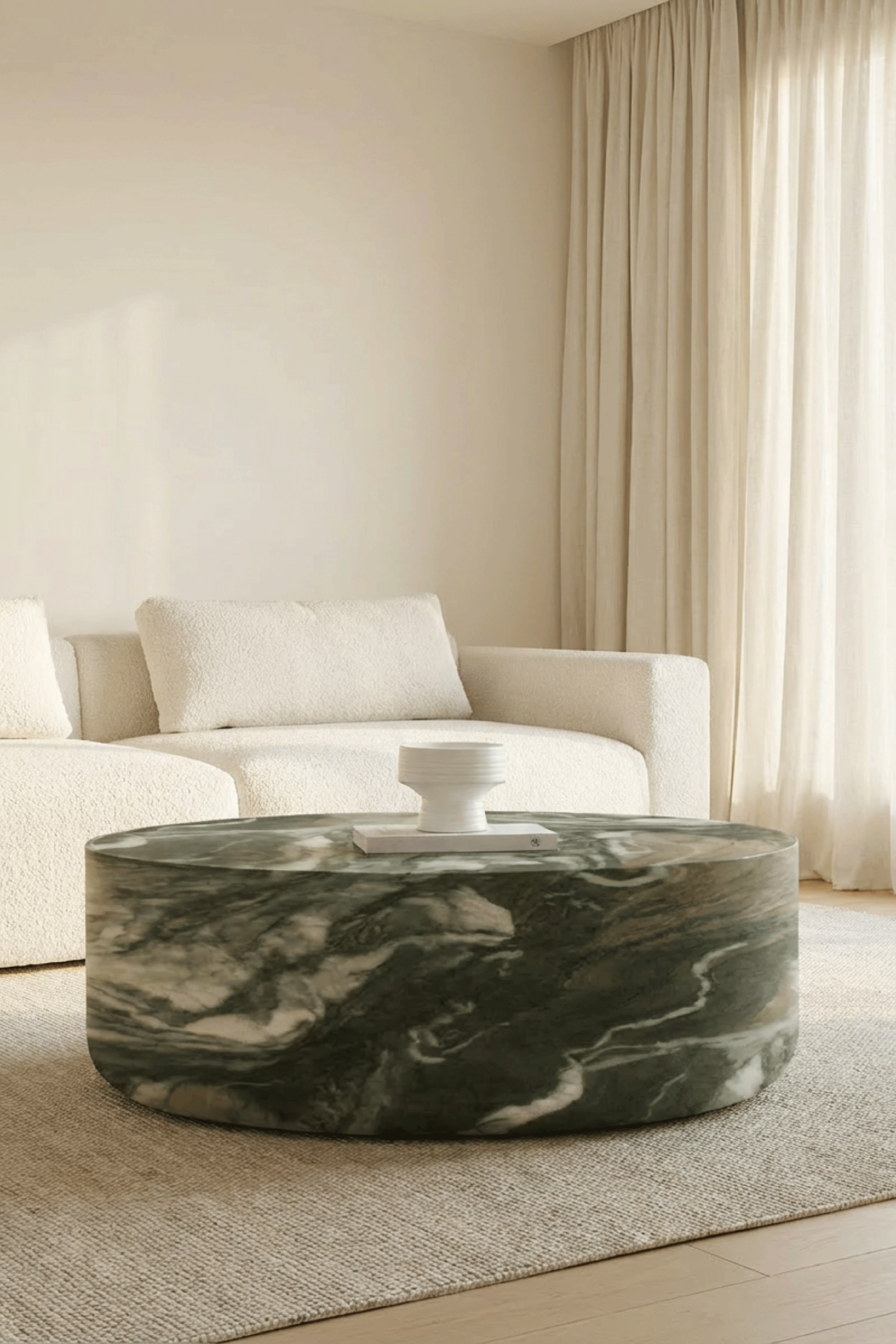 Striking and sculptural, this coffee table brings bold sophistication to modern interiors with its perfectly rounded silhouette and rich green marble–inspired finish. Crafted from durable Fiber Reinforced Concrete, it features deep verdant tones accented by organic white veining that adds natural contrast and elegant visual depth. The smooth surface and minimalist form create a contemporary centerpiece that stands out while blending effortlessly with a variety of décor styles. Designed for both beauty and everyday functionality, this table offers a sturdy platform for decorative accents, books, or serving trays, making it a timeless addition to any living space.