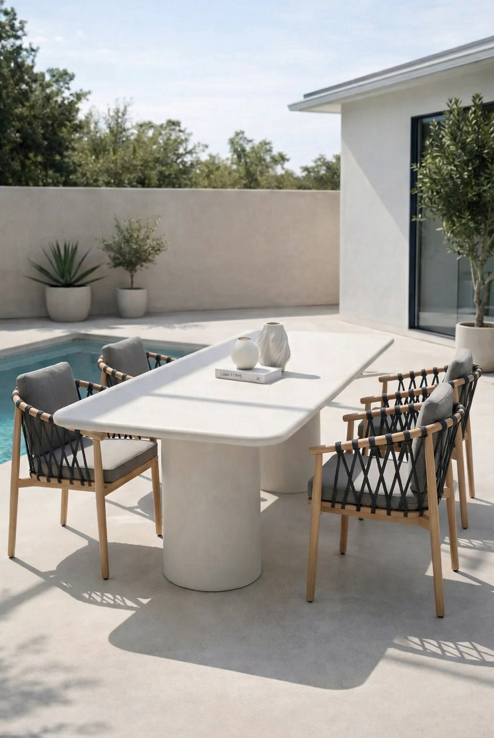Crafted with a micro concrete top layered on moisture-resistant plywood, this table is designed to withstand daily use while maintaining its pristine look. The micro concrete finish offers a chic, industrial vibe, enhancing the overall appeal of your dining area. Whether you’re hosting a dinner party or enjoying a quiet meal, this indoor Micro Concrete Dining Table adds a touch of sophistication and practicality to your setting. Transform your dining experience with this exquisite blend of style and substance.