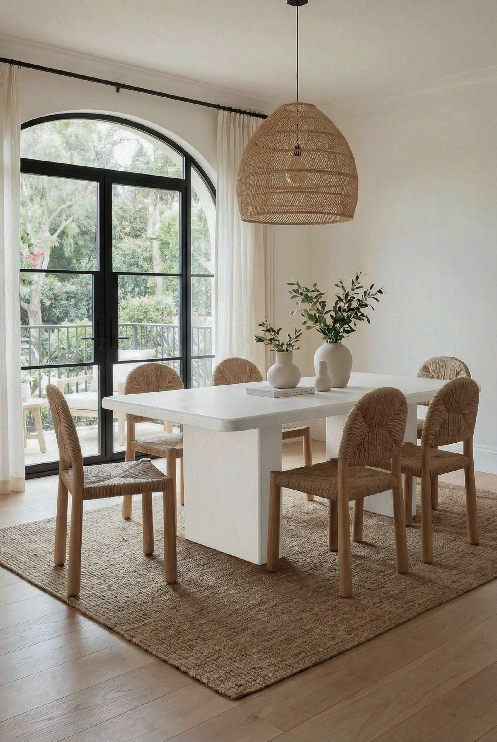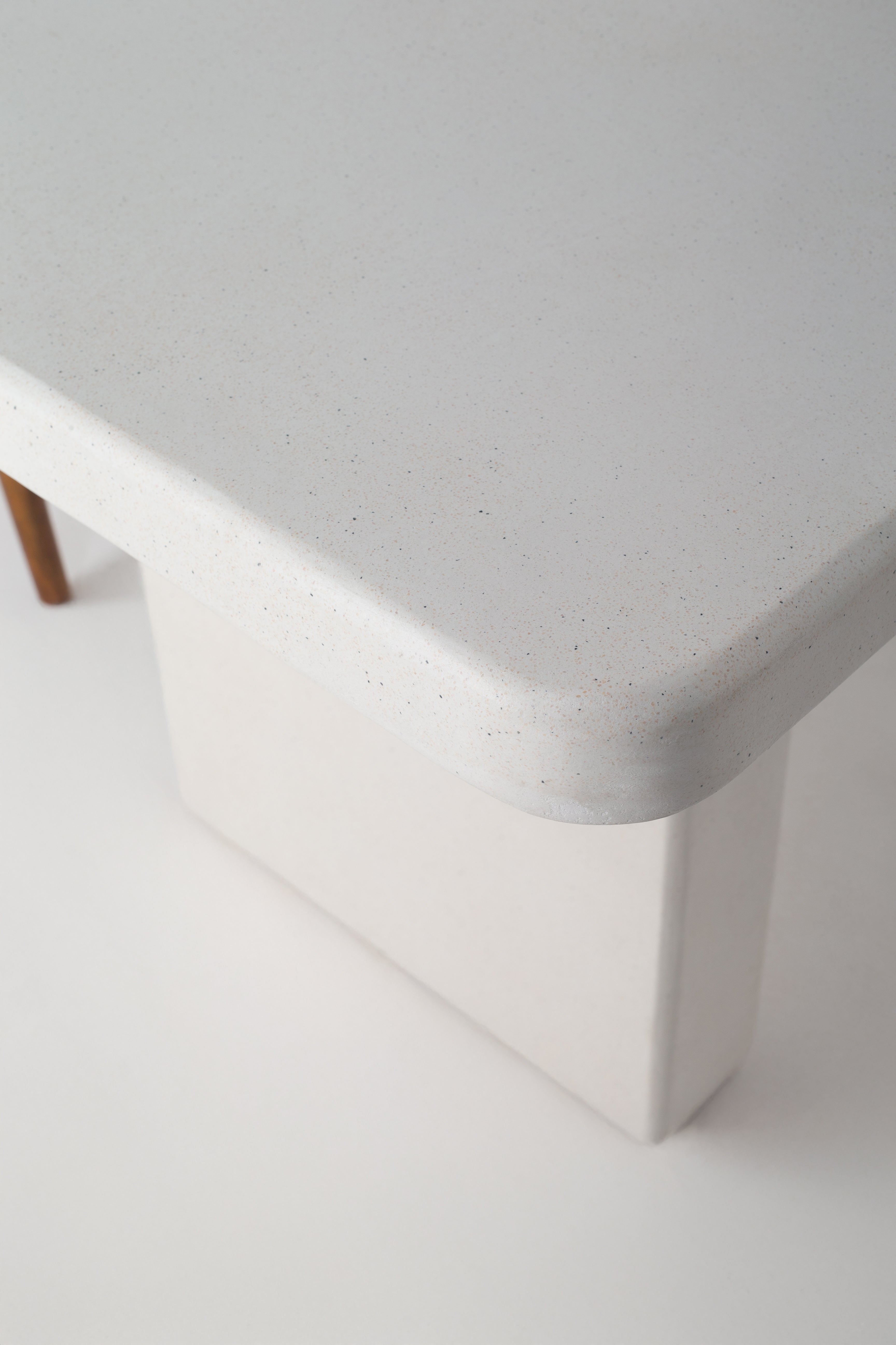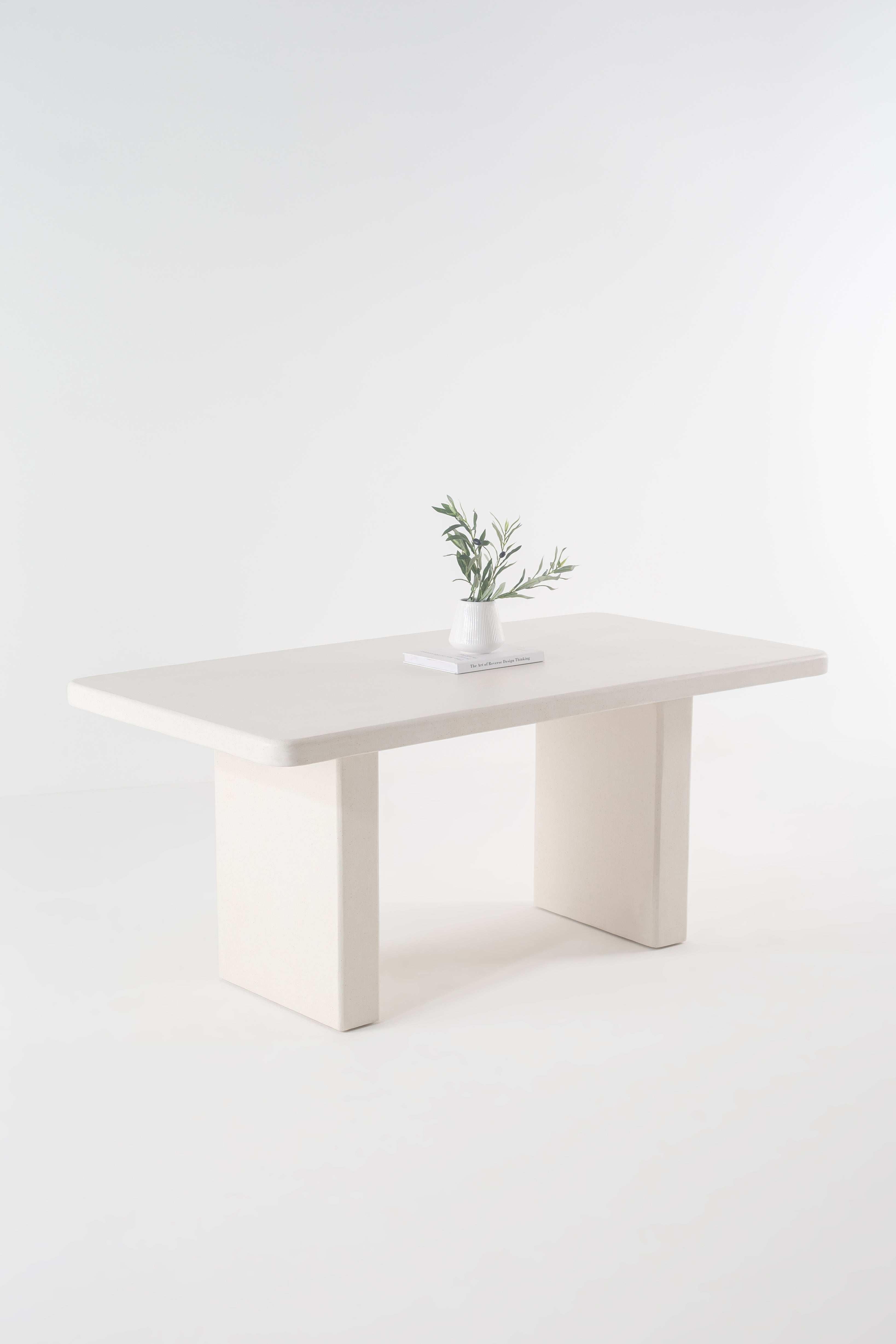 A statement of modern elegance, this micro concrete dining table blends a refined texture with a sleek, sculptural form. The rectangular top, softened by rounded edges, rests on two sturdy block legs, offering both stability and bold presence. The smooth, light toned finish carries subtle speckled details, enhancing its organic appeal. Whether styled with minimalist decor or warm, natural accents, it becomes the foundation of a striking dining space.