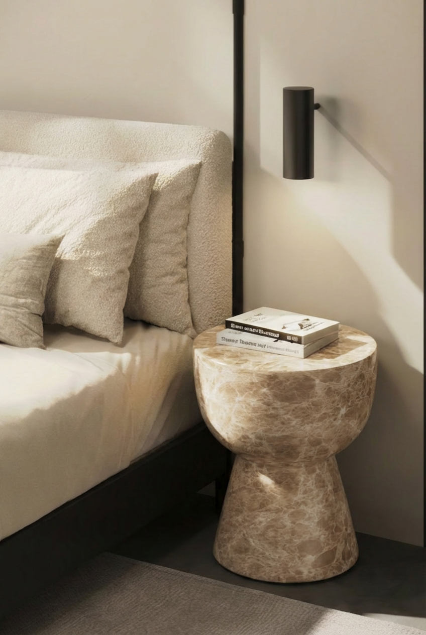 Exuding refined simplicity, this sculptural side table is crafted from premium Fiber Reinforced Concrete and finished in an elegant Light Emperador marble effect that highlights warm caramel tones and delicate white veining. Its smooth rounded top is supported by three bold cylindrical legs, creating an architecturally inspired silhouette that brings contemporary sophistication to any interior. The marble-like surface offers rich visual depth and a sturdy tactile feel, while the durable construction ensures lasting performance in living rooms, bedrooms, or semi-outdoor areas. Seamlessly blending modern artistry with timeless appeal, this versatile piece enhances any space with natural warmth and understated luxury.