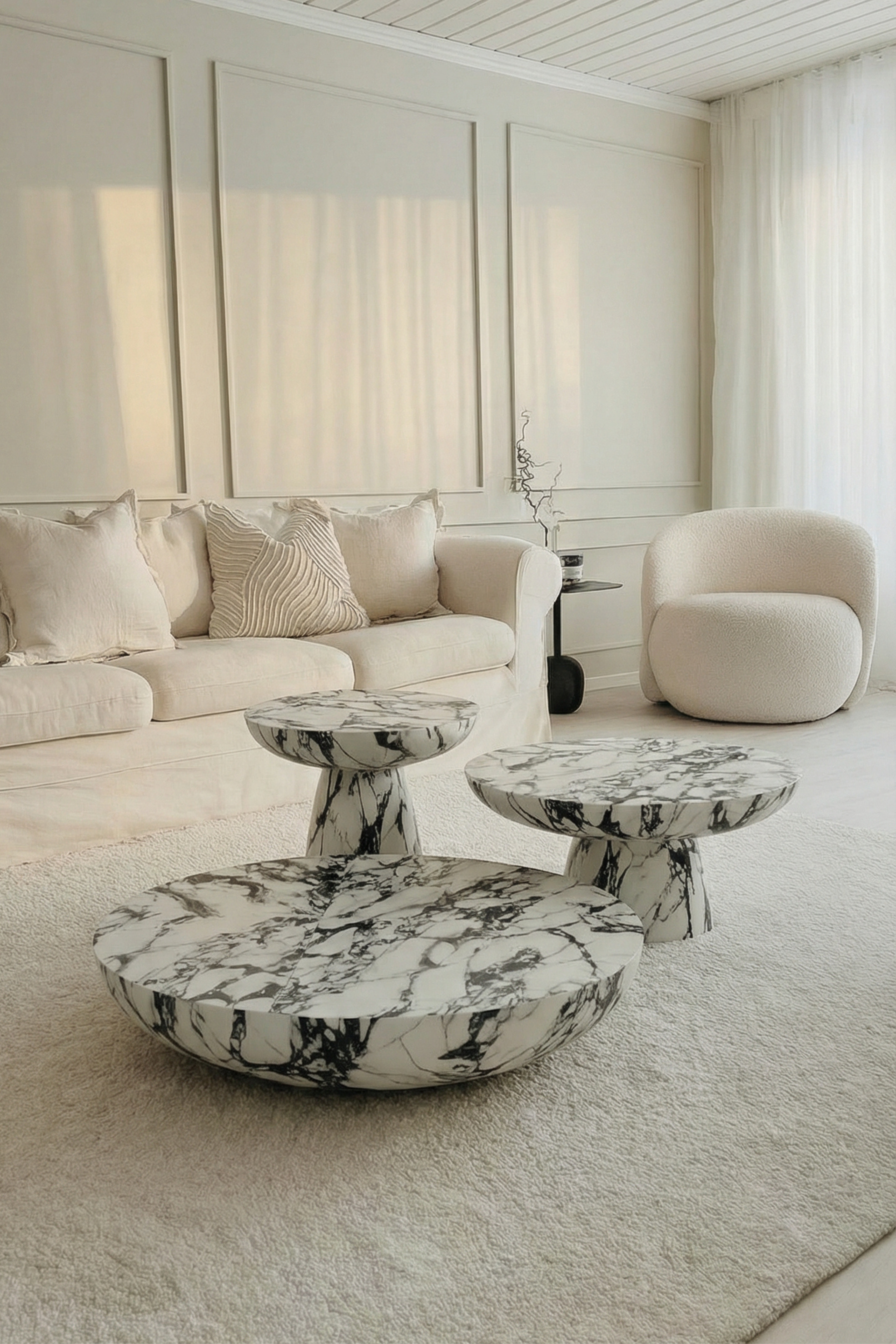 Crafted from premium FRC, this sculptural coffee table showcases a striking Viola Calacatta finish that brings dramatic elegance and artistic depth to any living space. Its smooth, rounded form introduces both visual softness and modern refinement, while the bold veining in deep plum, charcoal, and soft grey tones creates a luxurious stone-like presence. Designed as a statement piece that balances strength and sophistication, it seamlessly complements modern, minimalist, and transitional interiors, offering timeless appeal and a captivating focal point that enhances the beauty of any room.