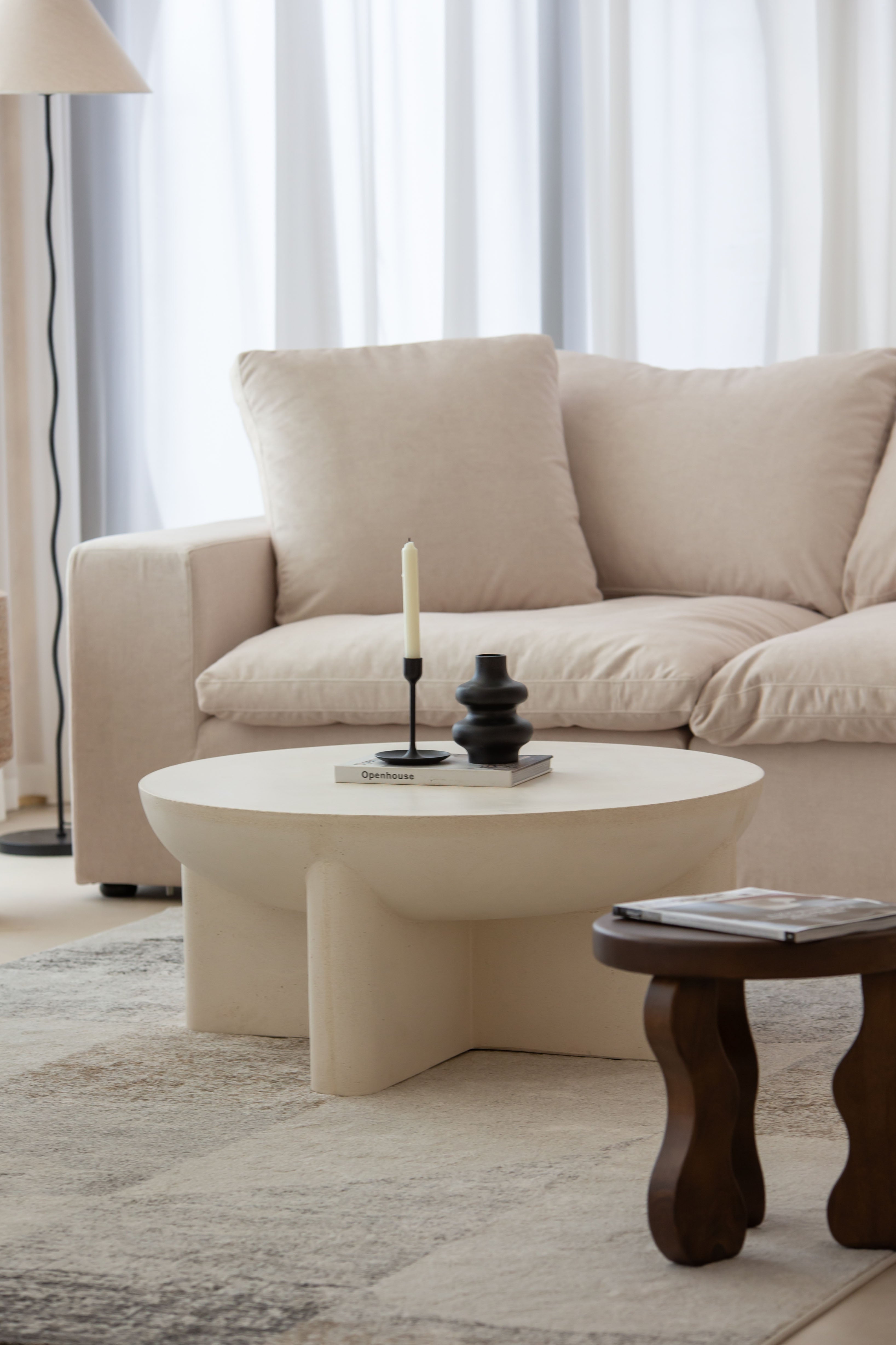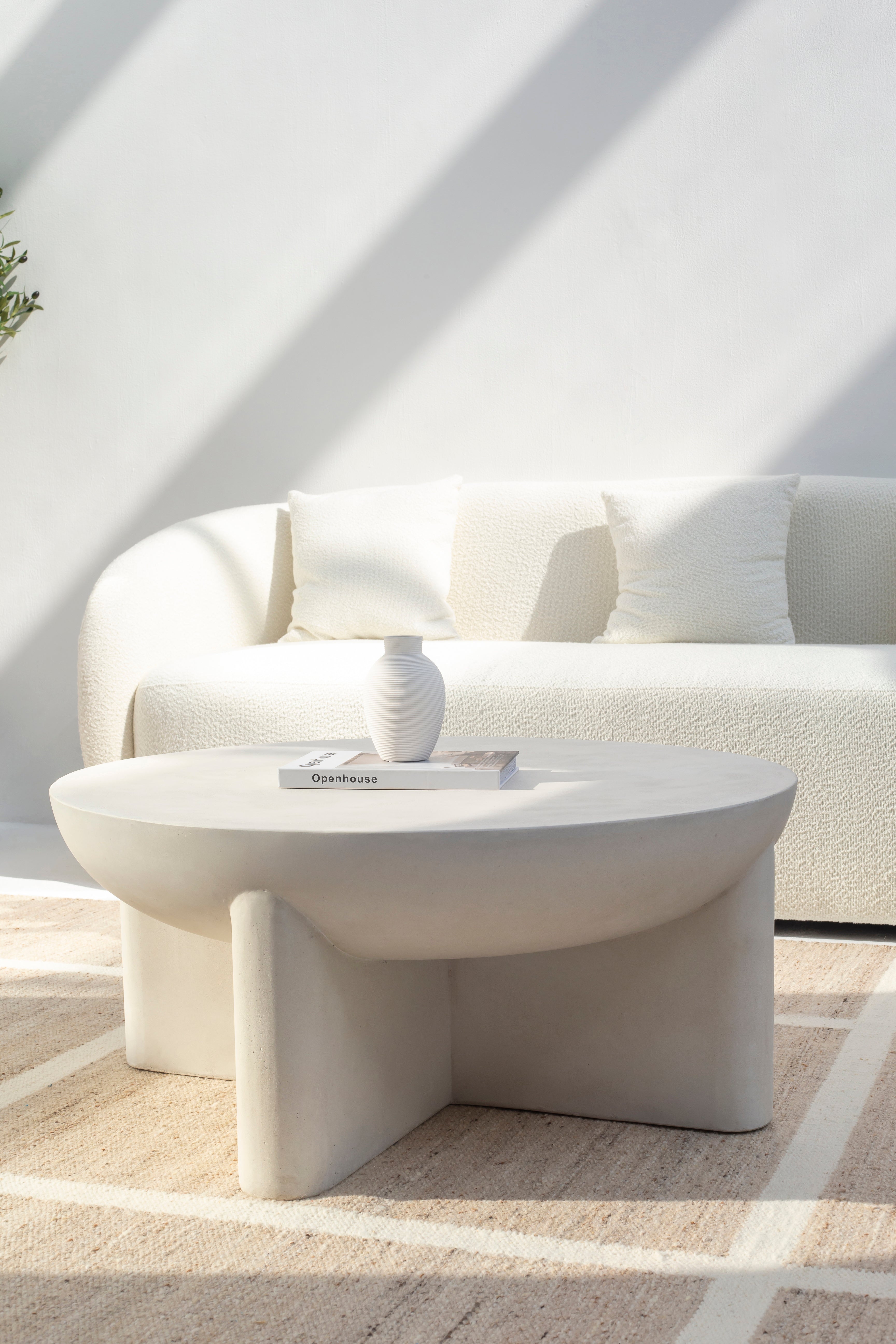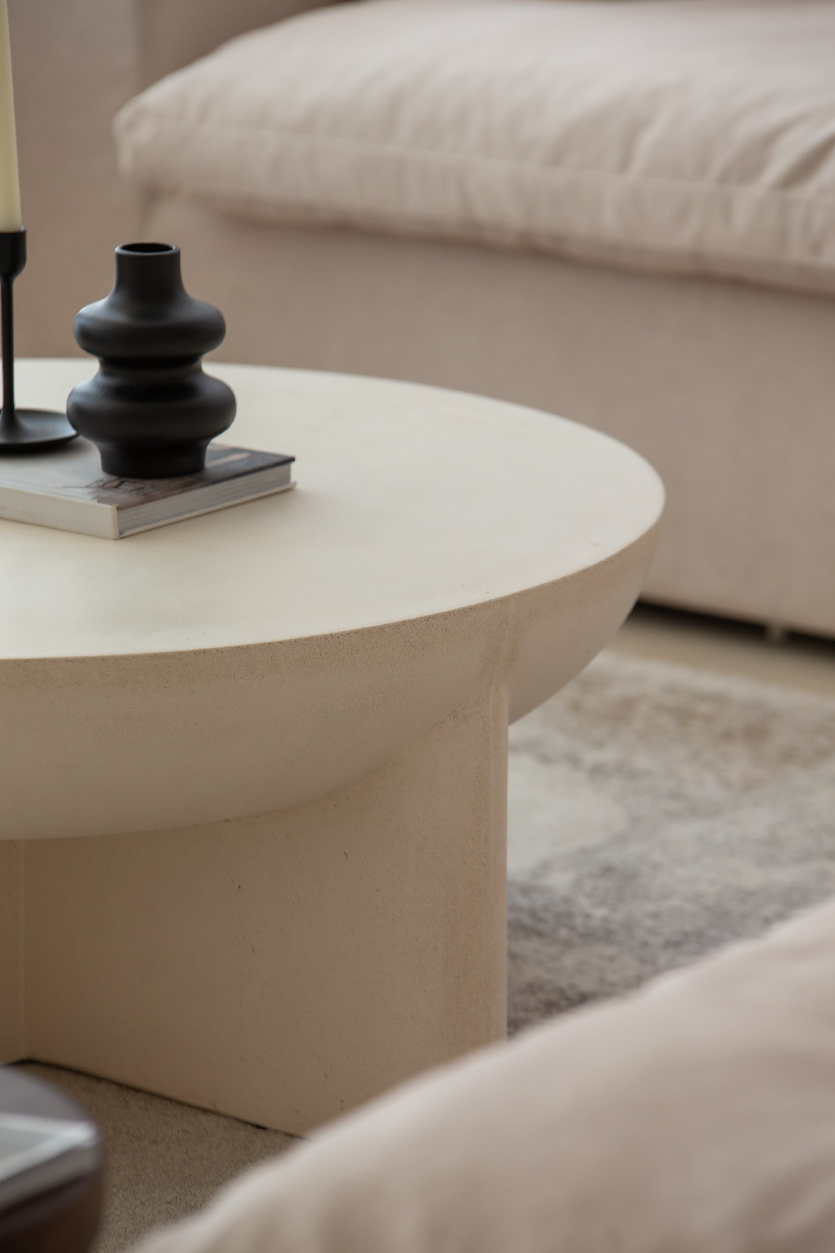 The Morrison Cream Concrete Coffee Table exudes modern minimalism with its rounded top and sculptural base, creating a bold, architectural statement for any living space. The smooth cream-toned GRC (Glass Reinforced Concrete) surface showcases a refined texture, bringing a touch of contemporary elegance while maintaining unmatched durability. Its substantial, geometric legs add structural balance and artistic appeal, making it a focal point for gatherings or serene lounging.