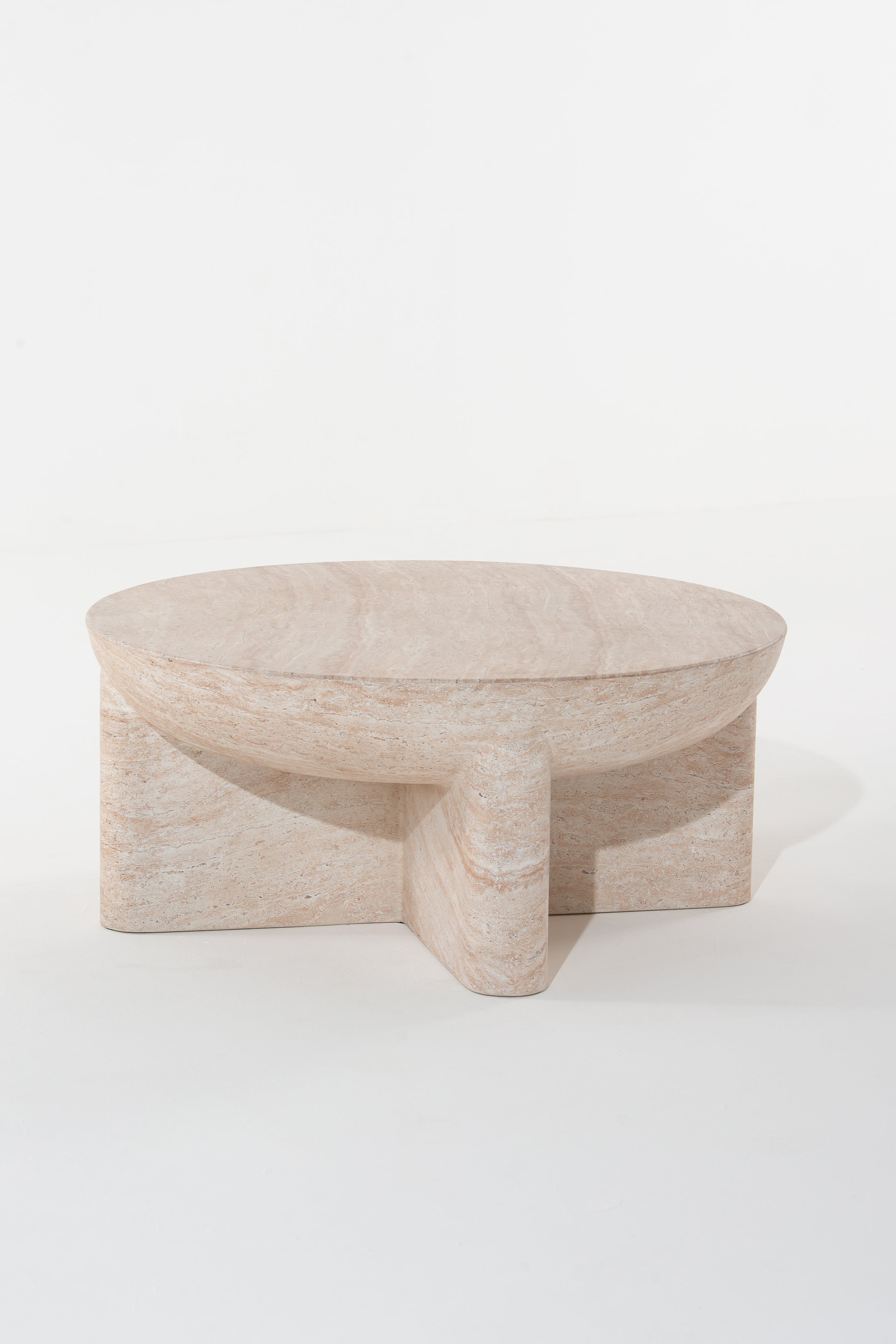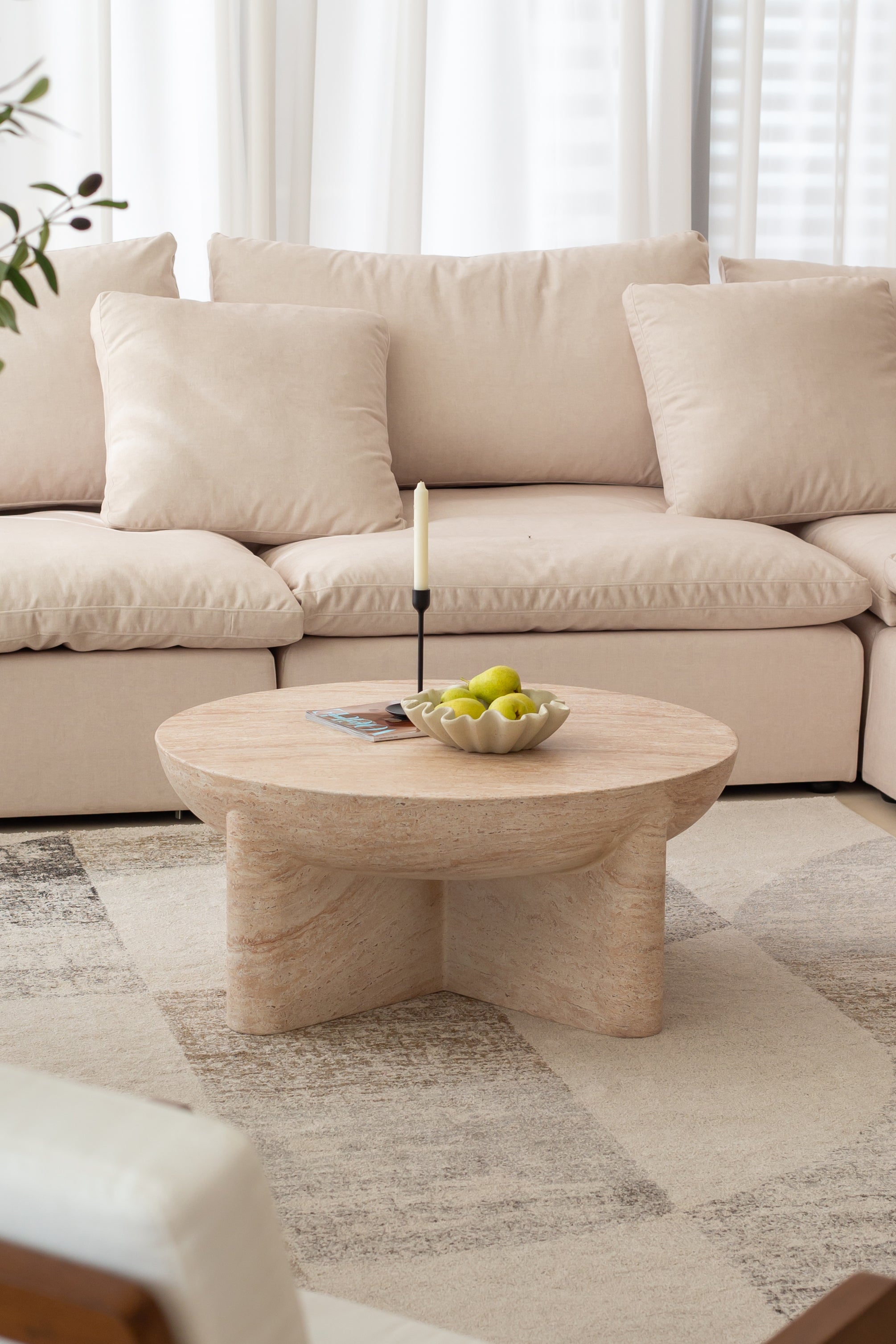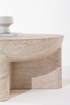The Morrison Travertine-Finish Concrete Coffee Table seamlessly blends modern aesthetics with natural elegance. Crafted with a travertine-inspired finish, it radiates a warm, earthy beige tone that beautifully mimics genuine stone. The rounded tabletop rests gracefully on a uniquely structured base, adding a sculptural touch to any room. Its polished, smooth surface highlights subtle veining and a rich texture, making it an ideal statement piece in contemporary and minimalist spaces.
