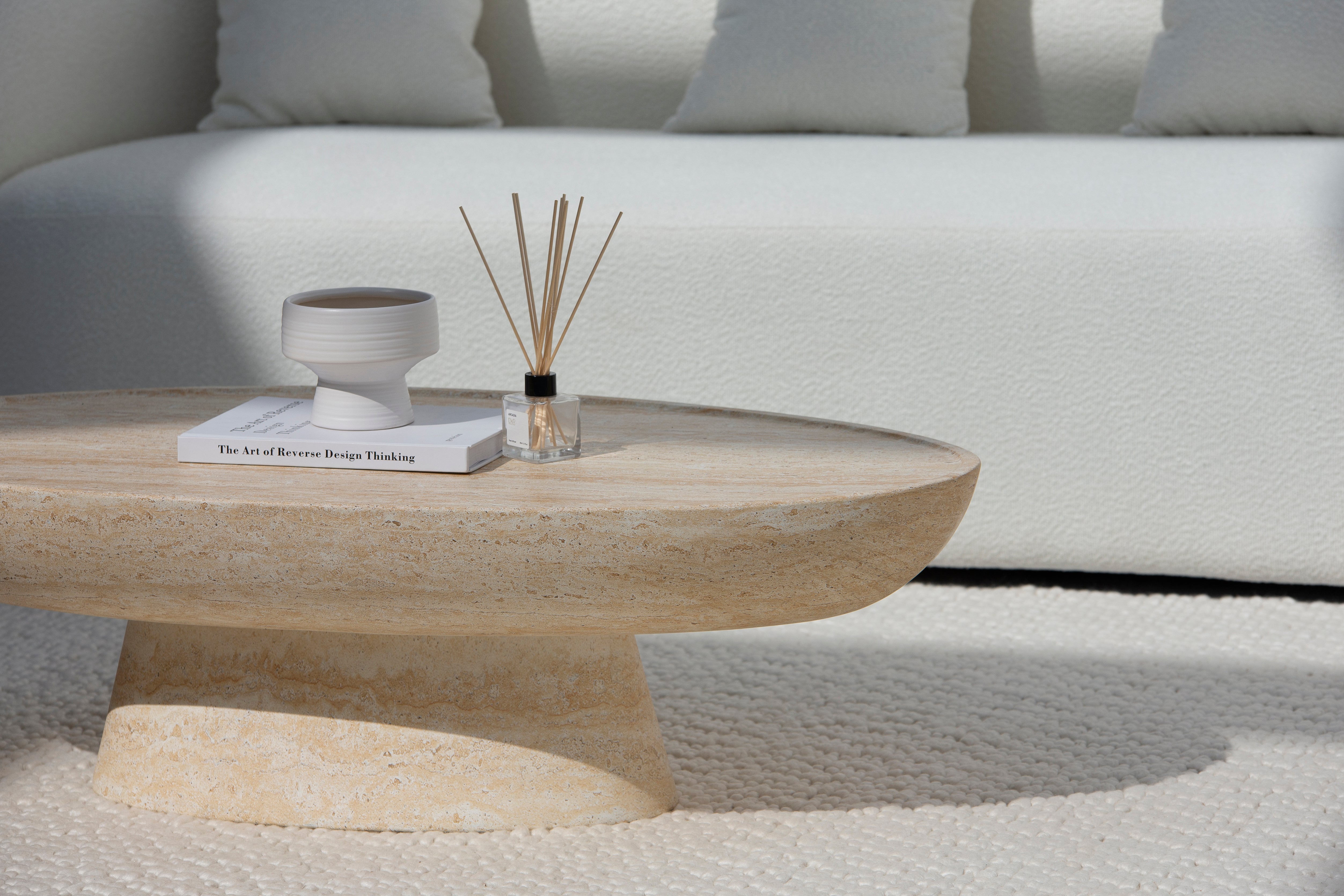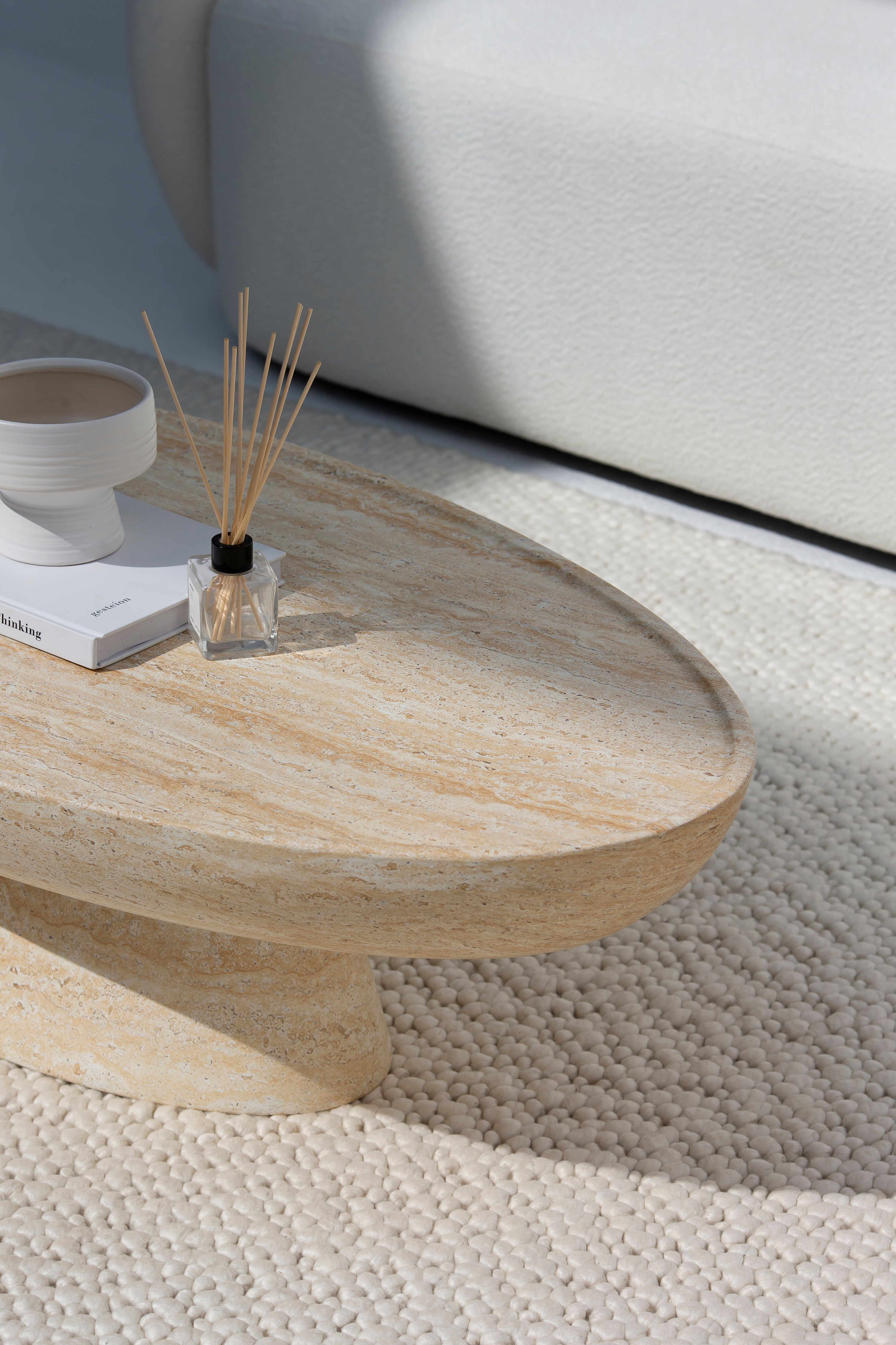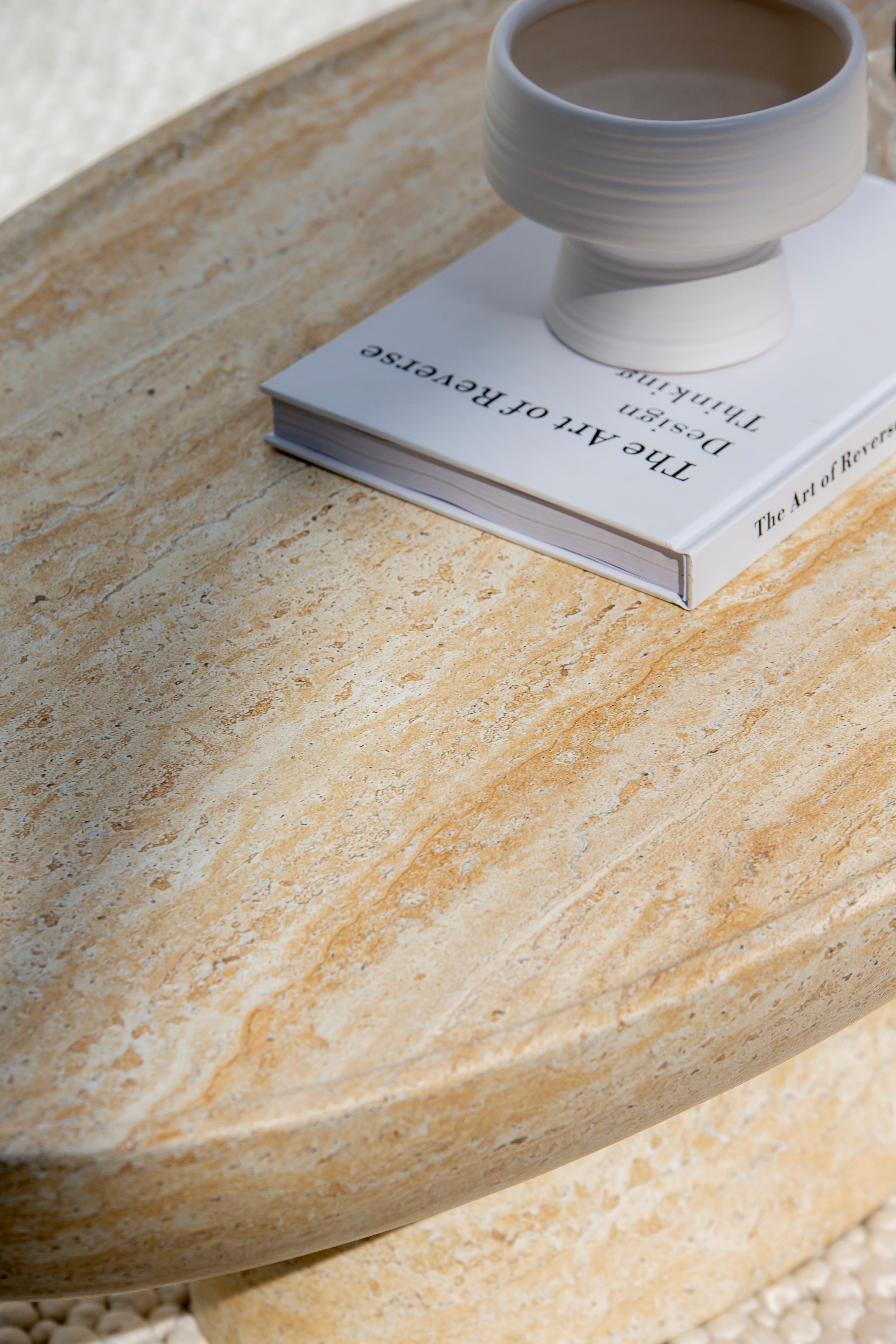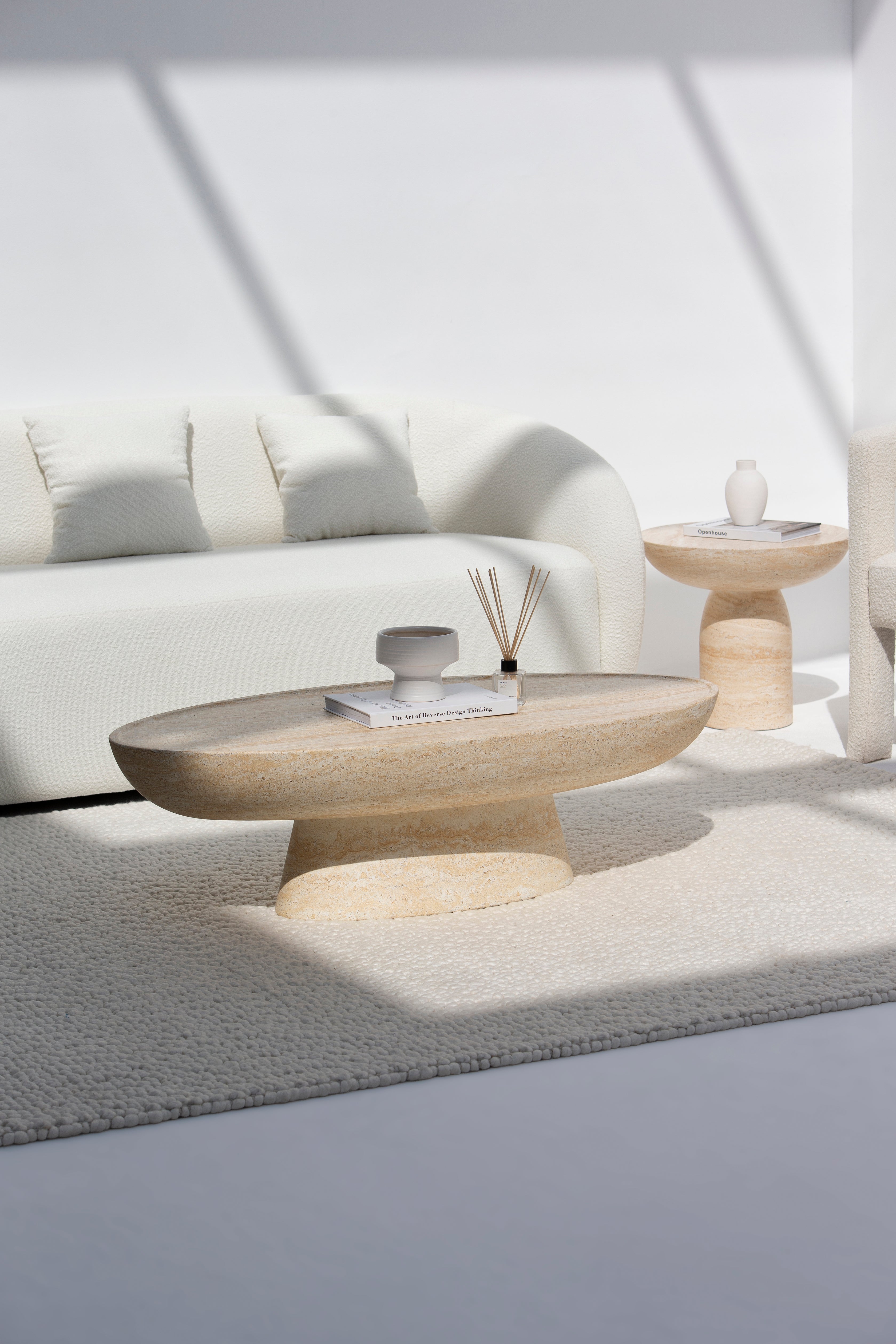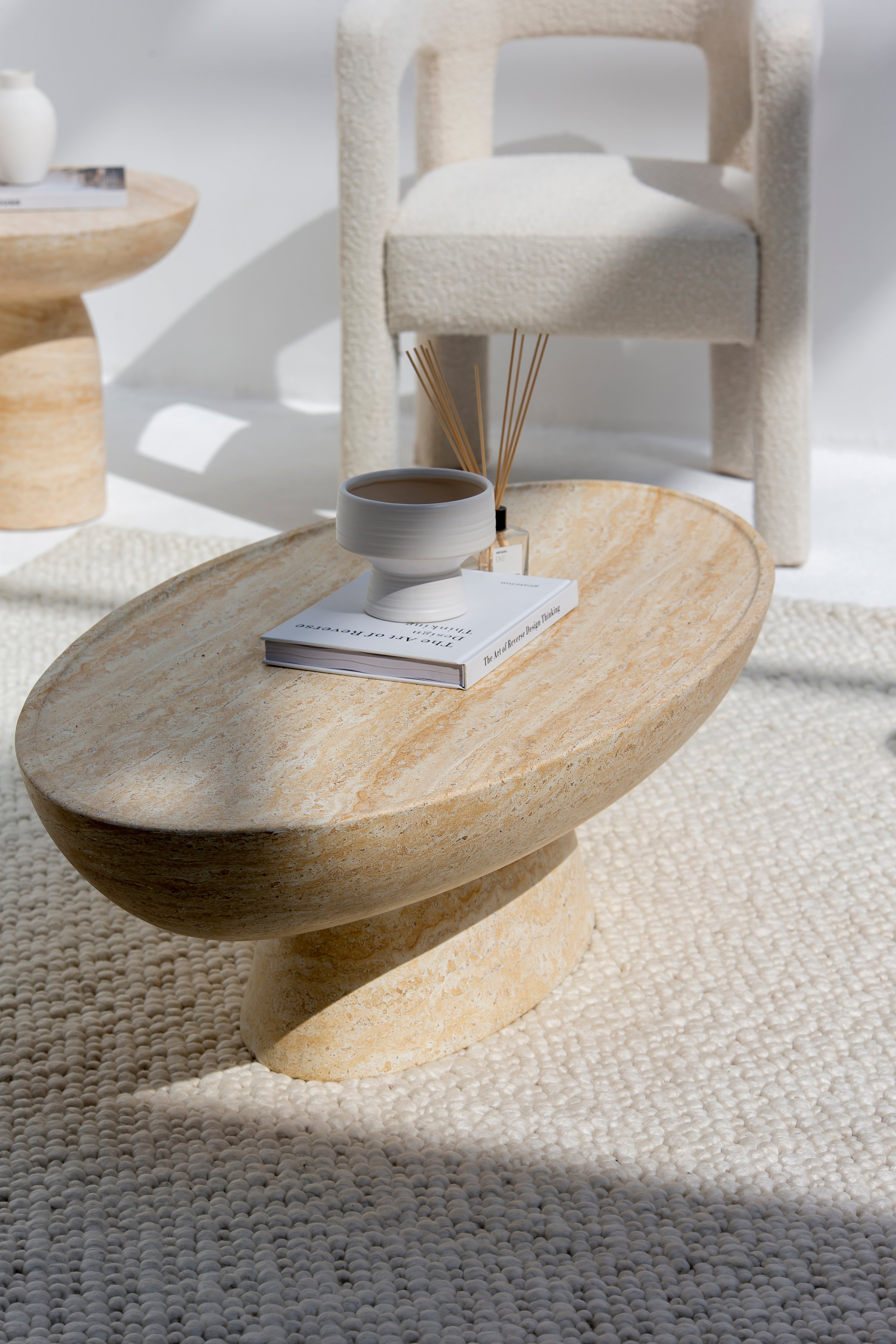 Made from durable GRC (Glassfibre Reinforced Concrete), it combines robust construction with a light appearance. The table’s smooth, organic shape pairs beautifully with its subtle travertine finish, delivering an aesthetic that blends earthy charm and modern chic. Perfect for styling with coffee books and décor, it enhances any living area.