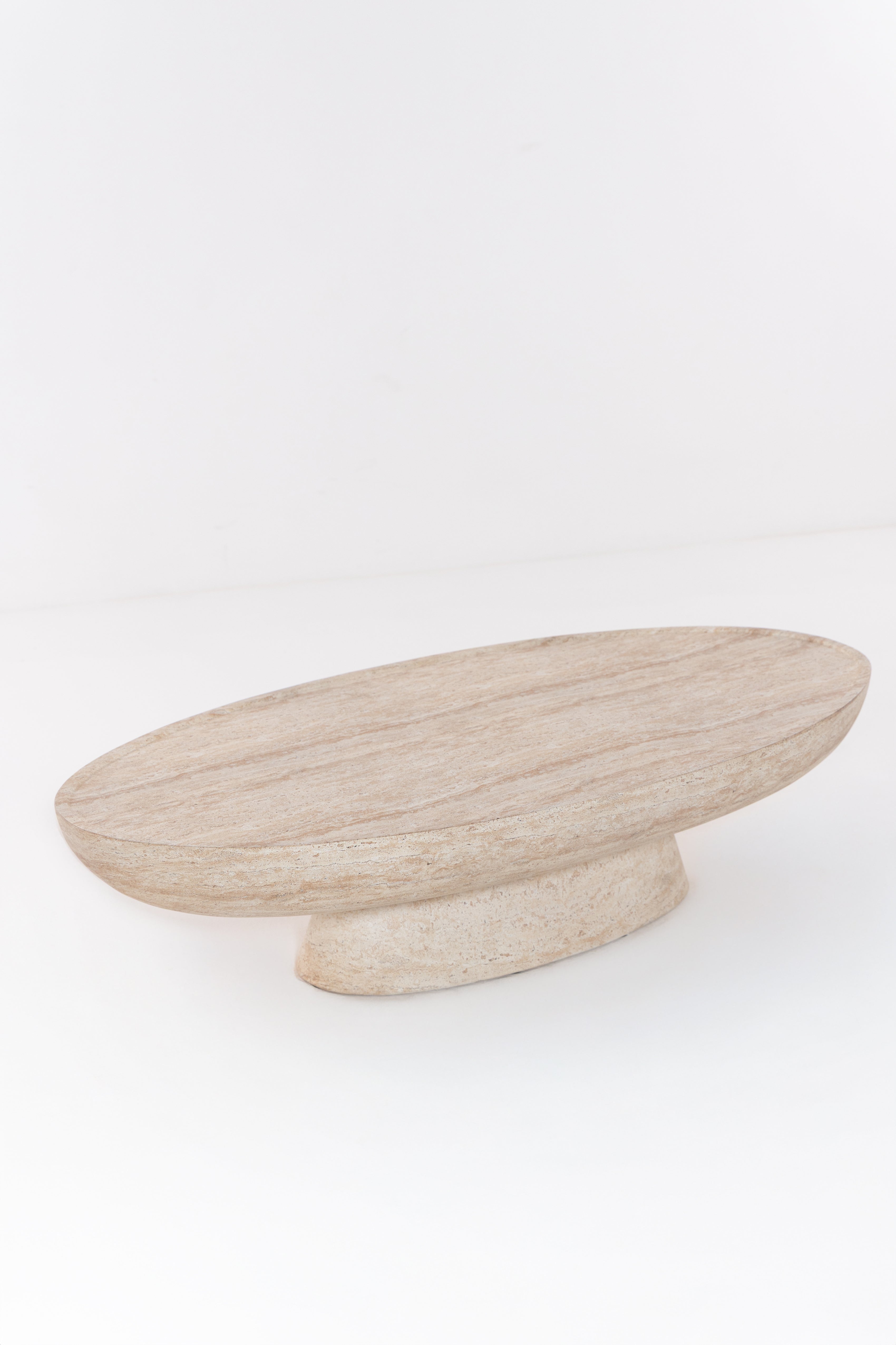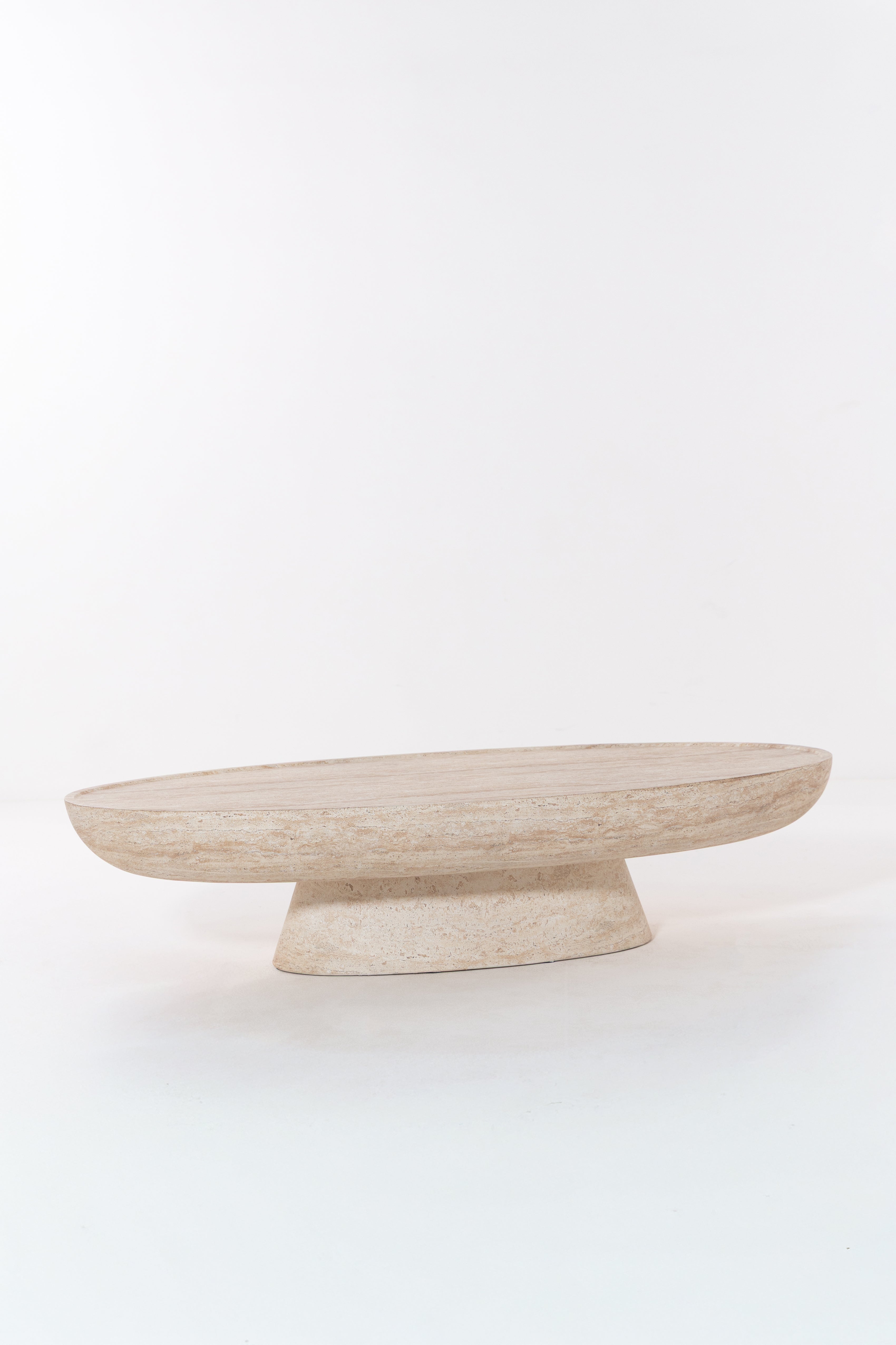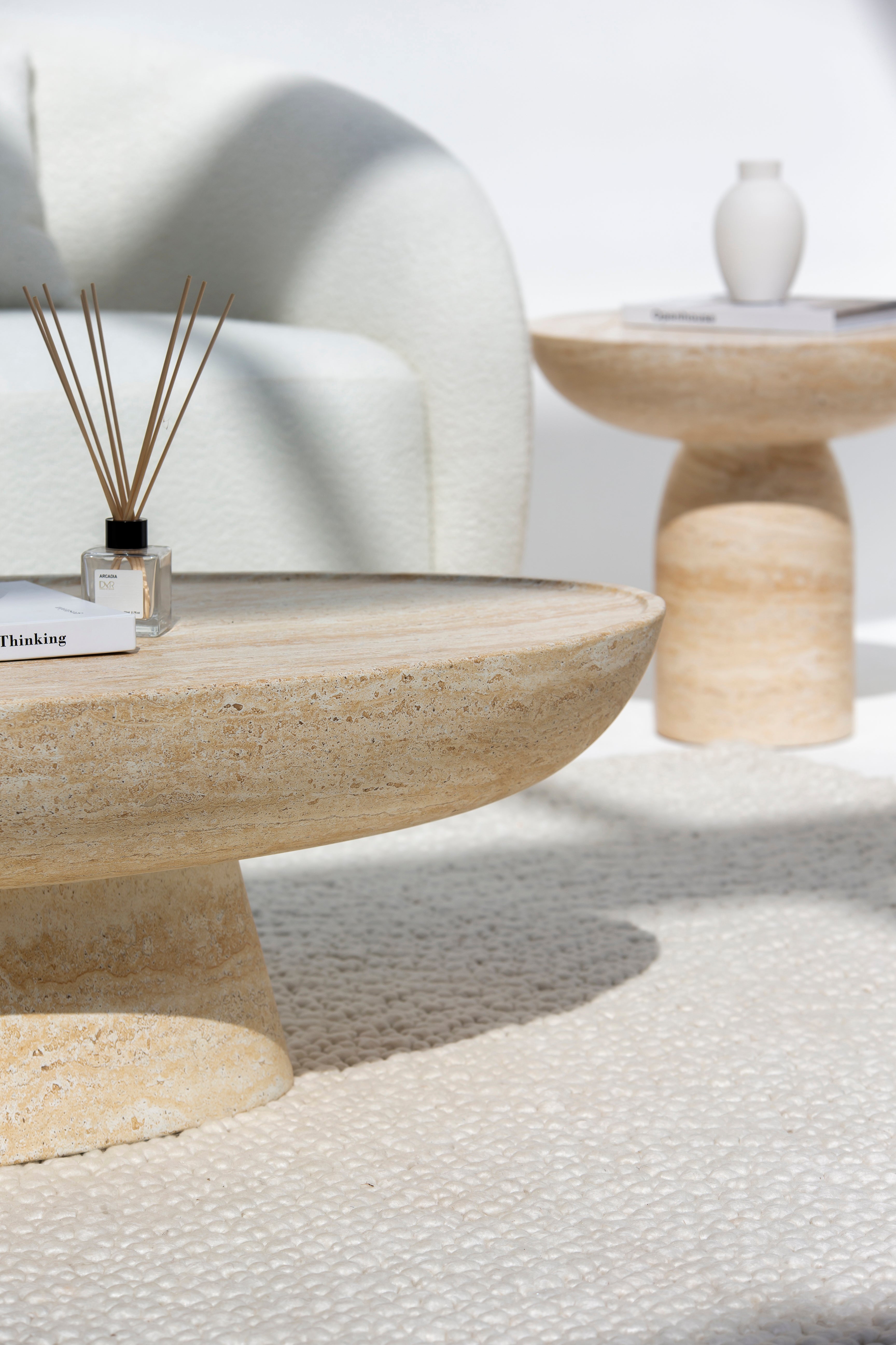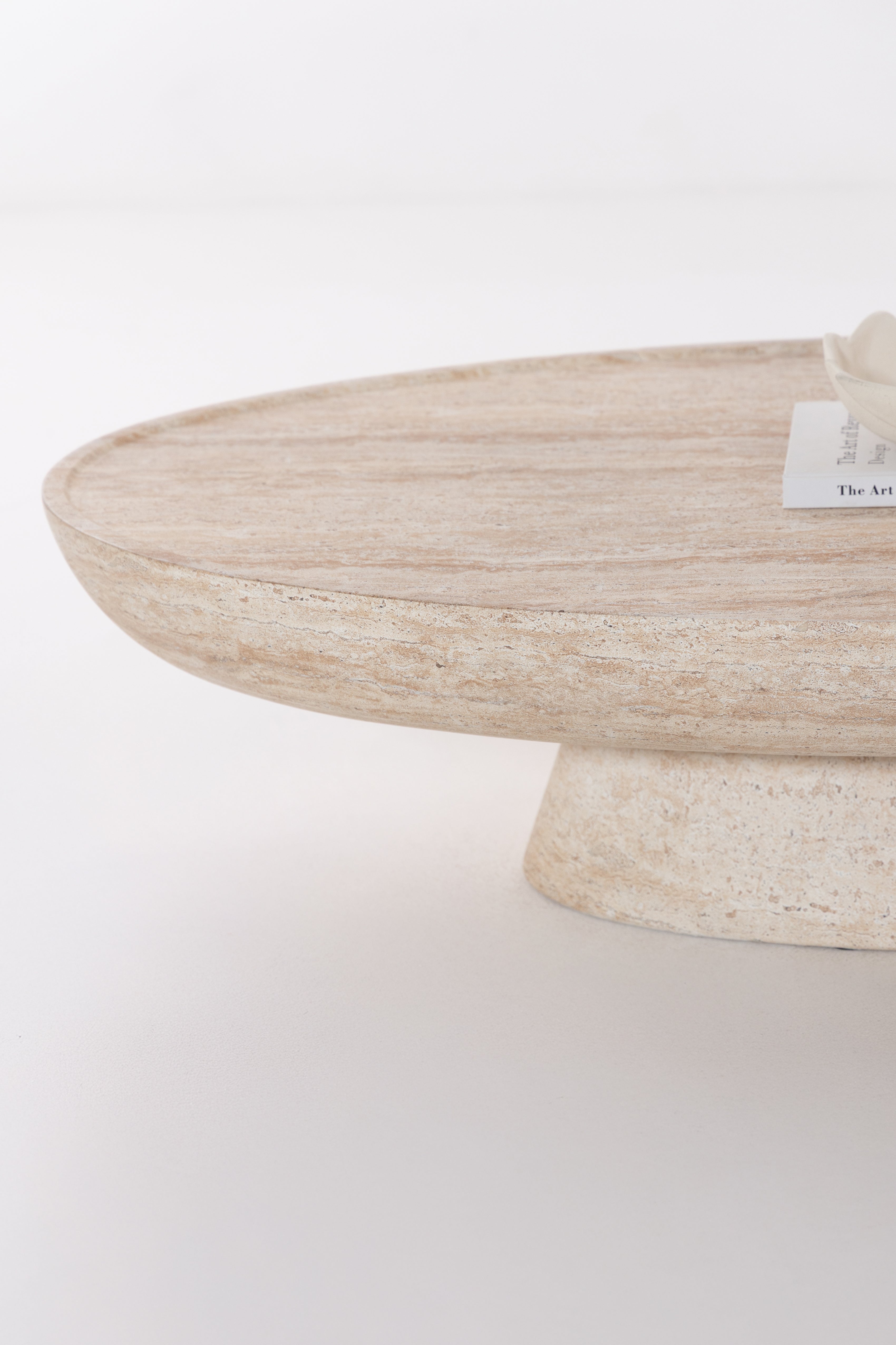 Made from durable GRC (Glassfibre Reinforced Concrete), it combines robust construction with a light appearance. The table’s smooth, organic shape pairs beautifully with its subtle travertine finish, delivering an aesthetic that blends earthy charm and modern chic. Perfect for styling with coffee books and décor, it enhances any living area.