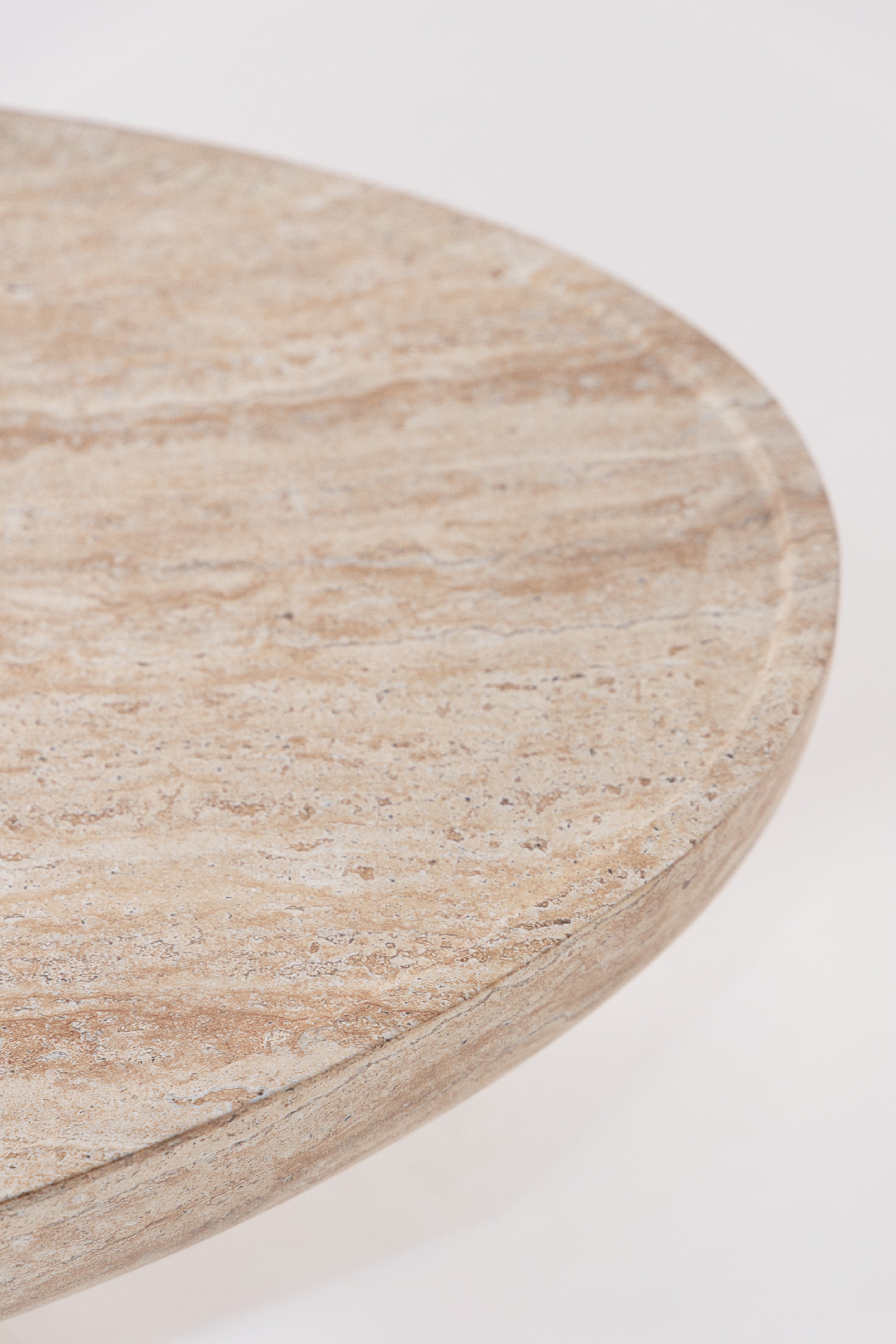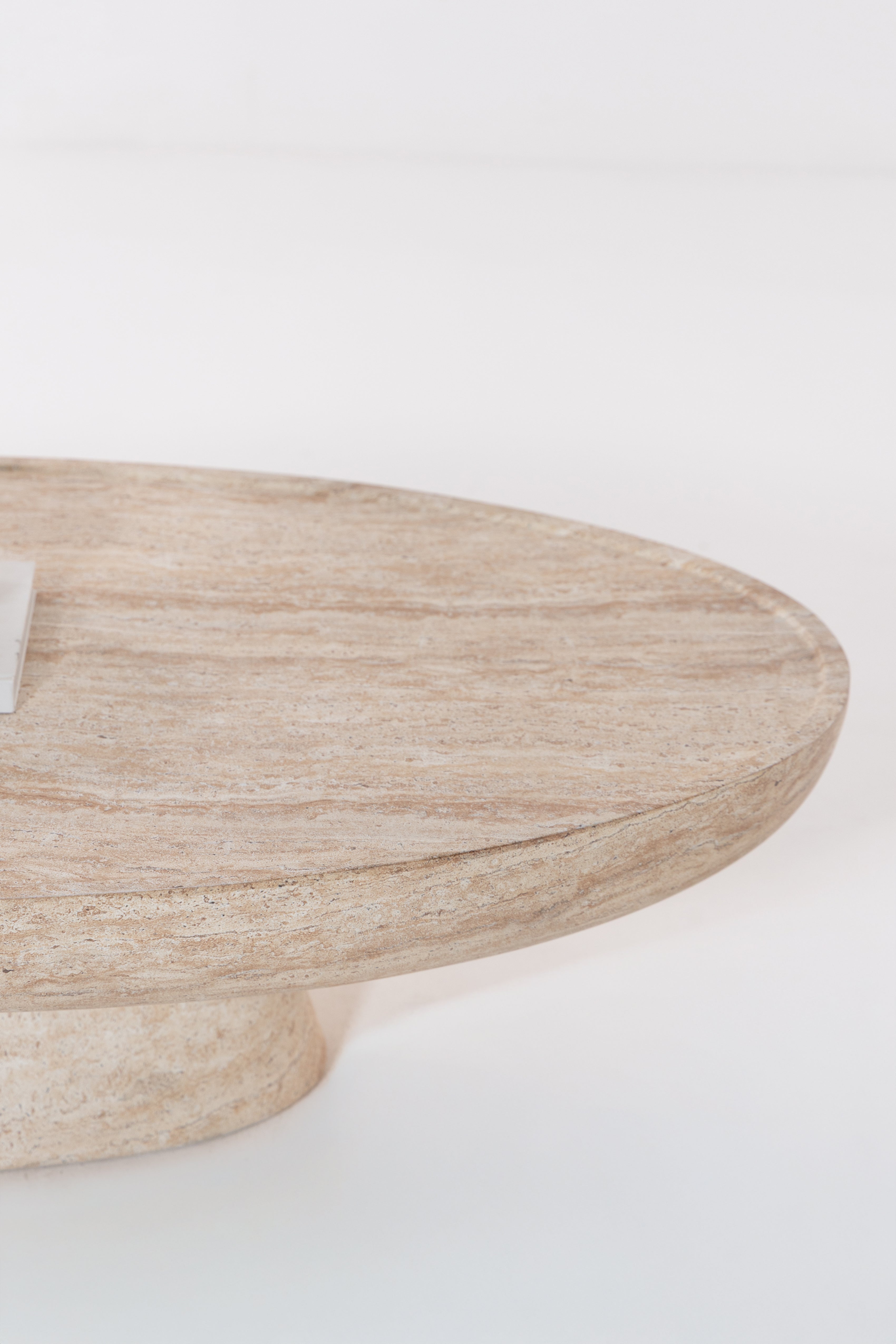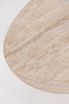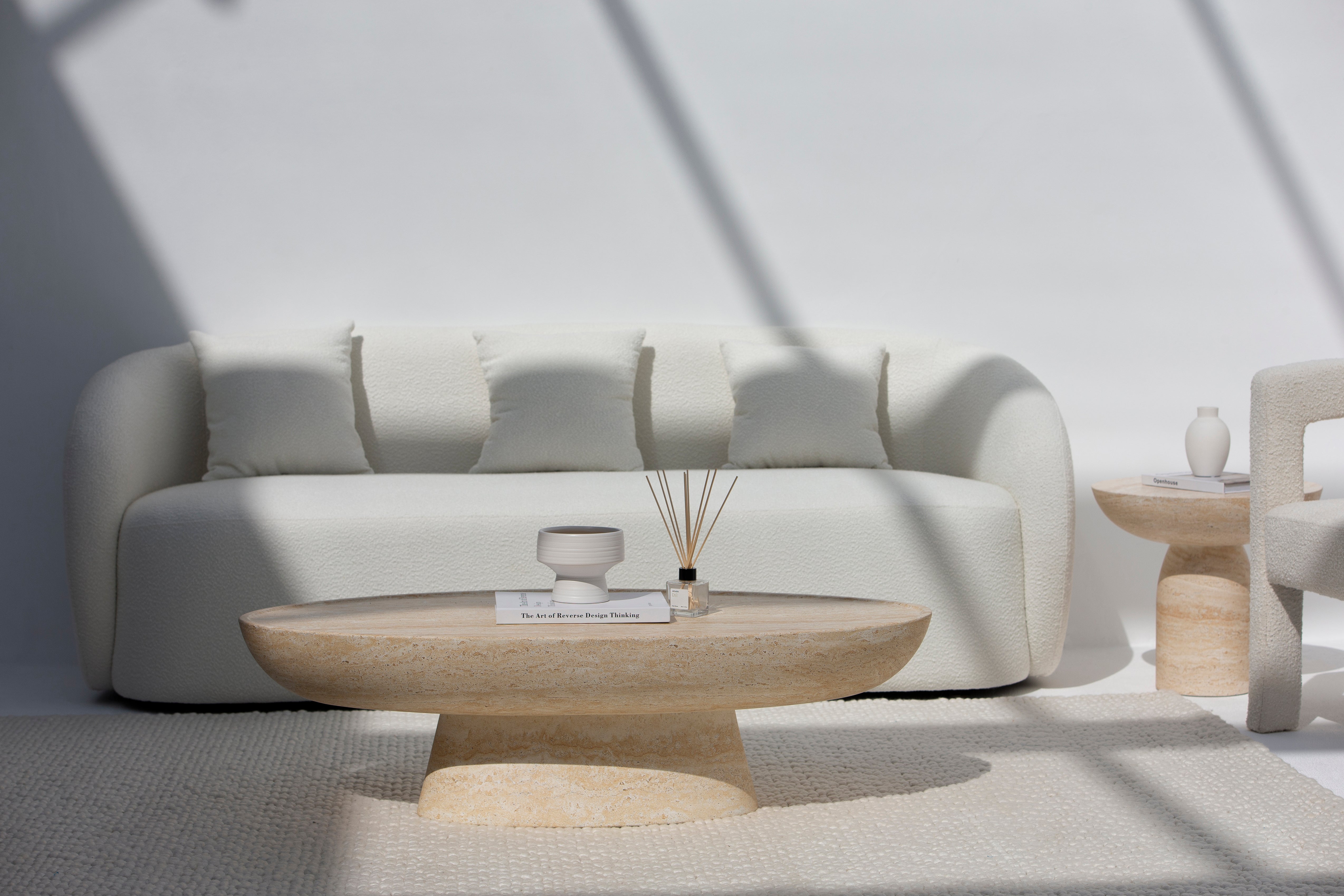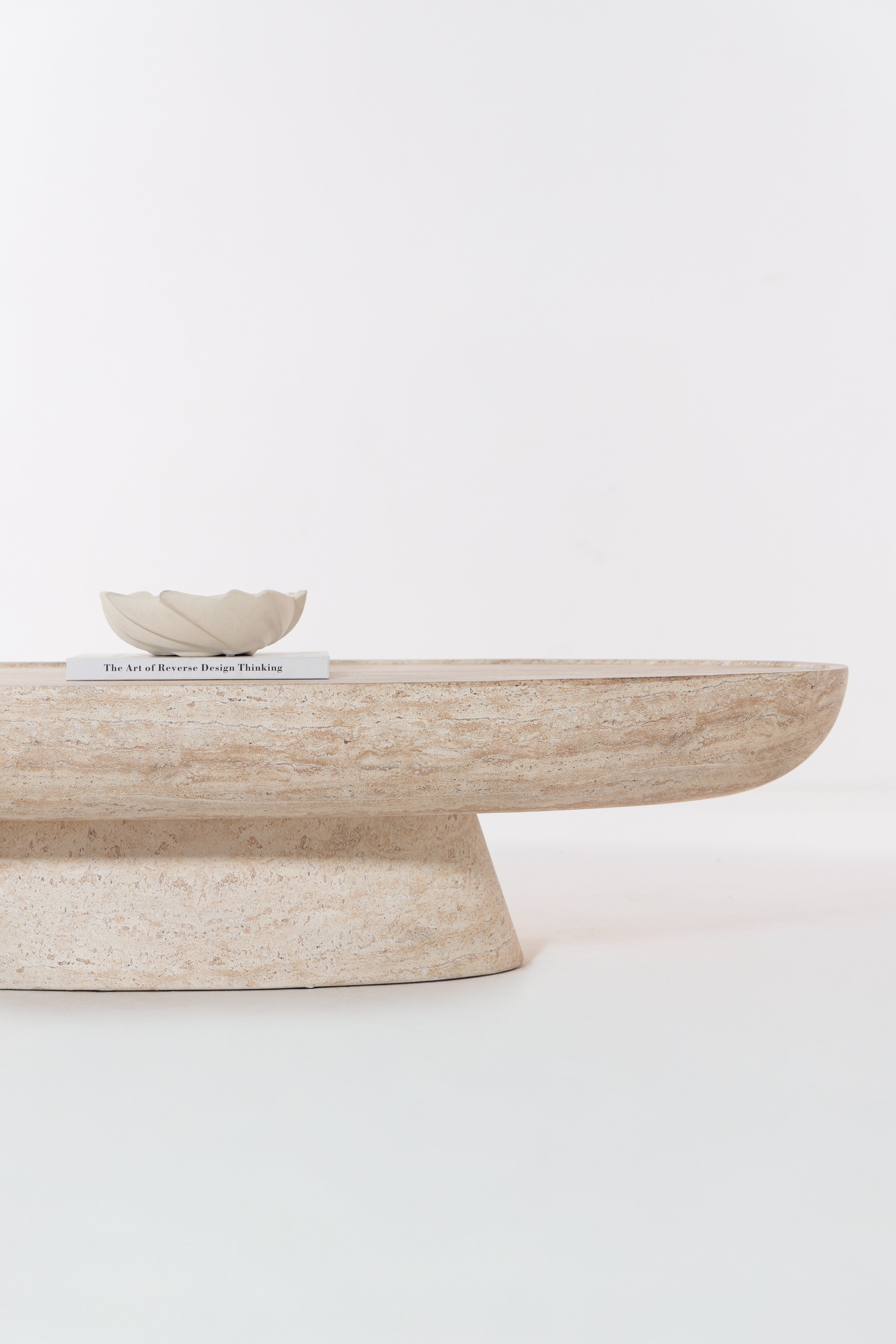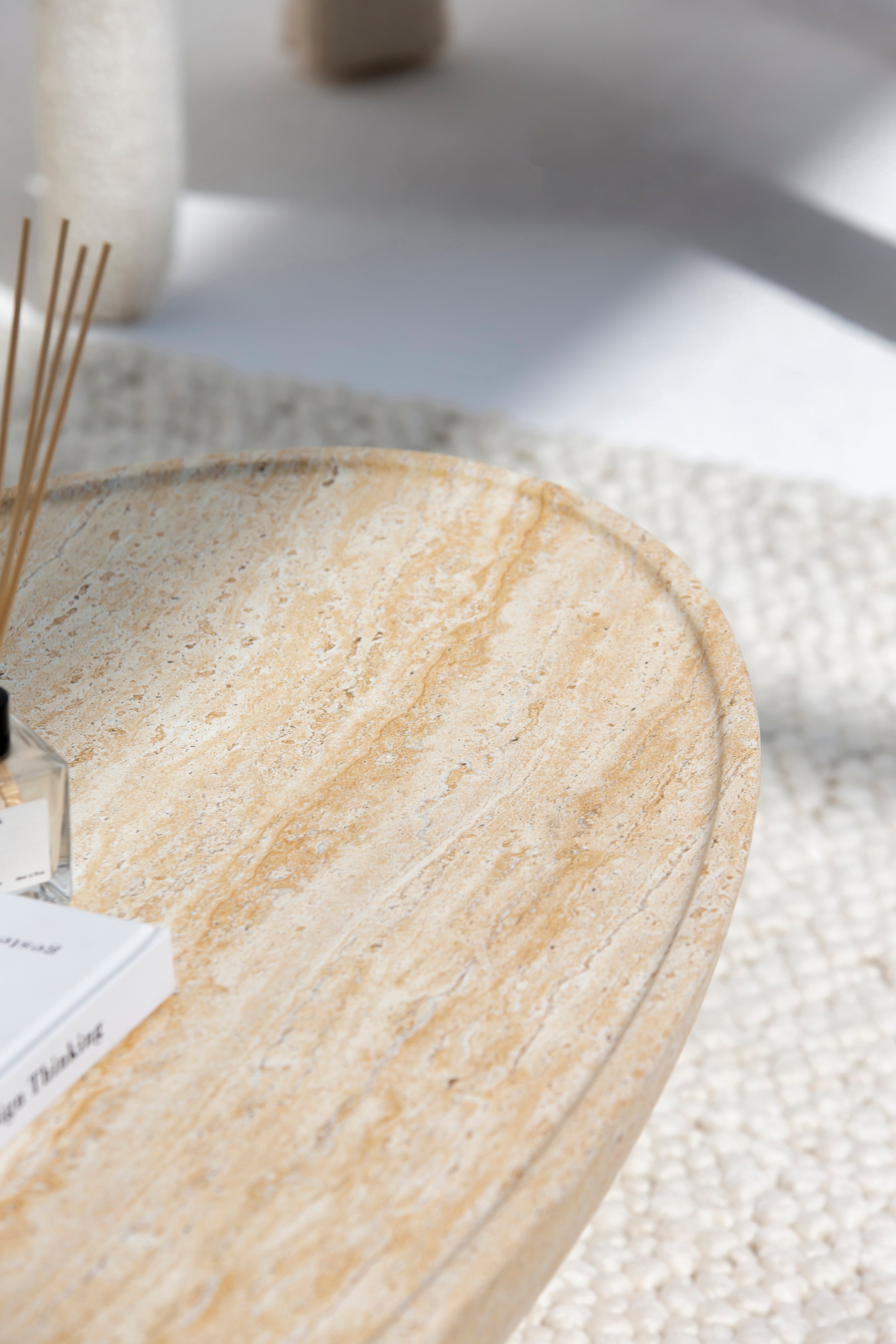 Made from durable GRC (Glassfibre Reinforced Concrete), it combines robust construction with a light appearance. The table’s smooth, organic shape pairs beautifully with its subtle travertine finish, delivering an aesthetic that blends earthy charm and modern chic. Perfect for styling with coffee books and décor, it enhances any living area.