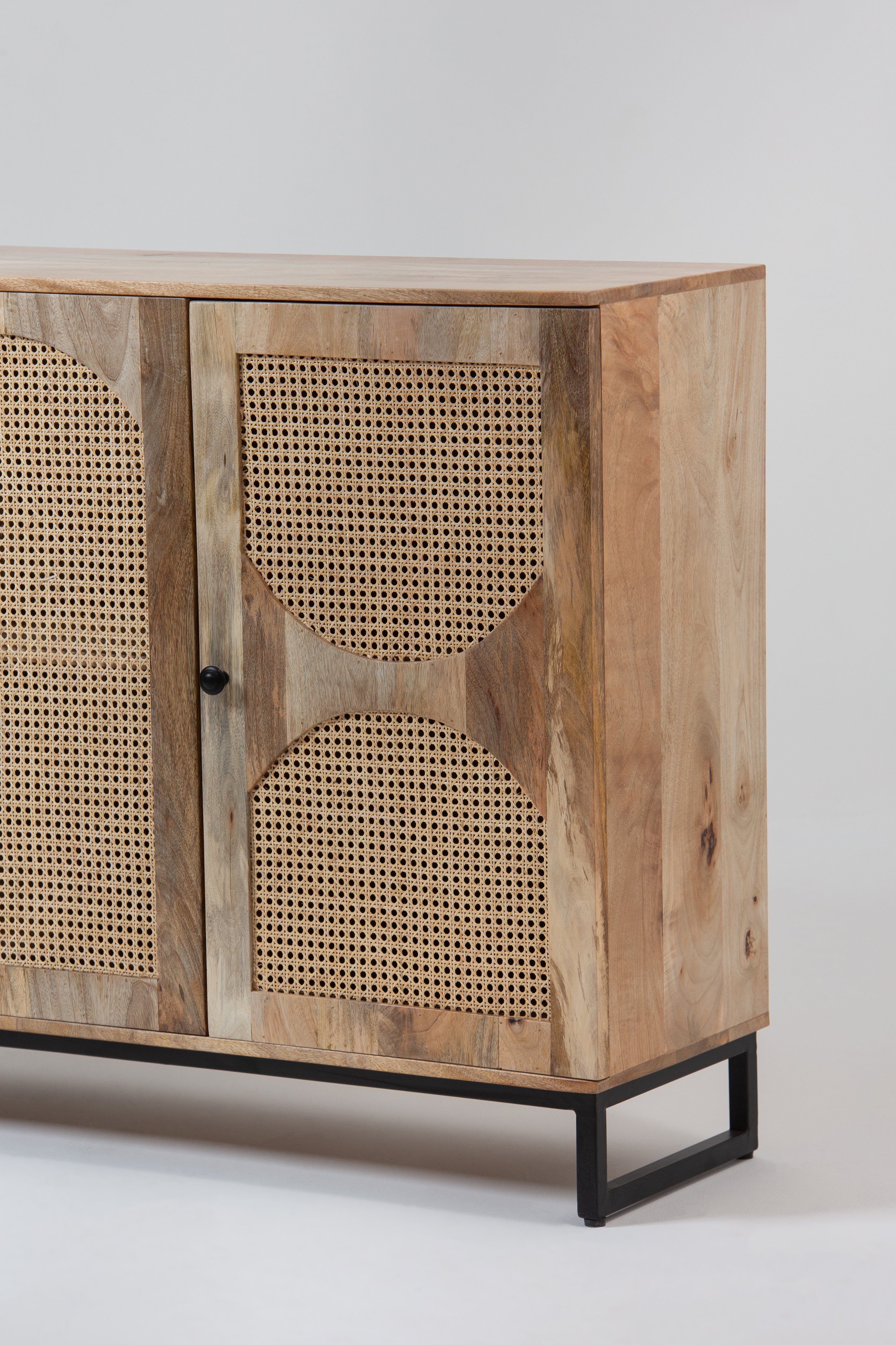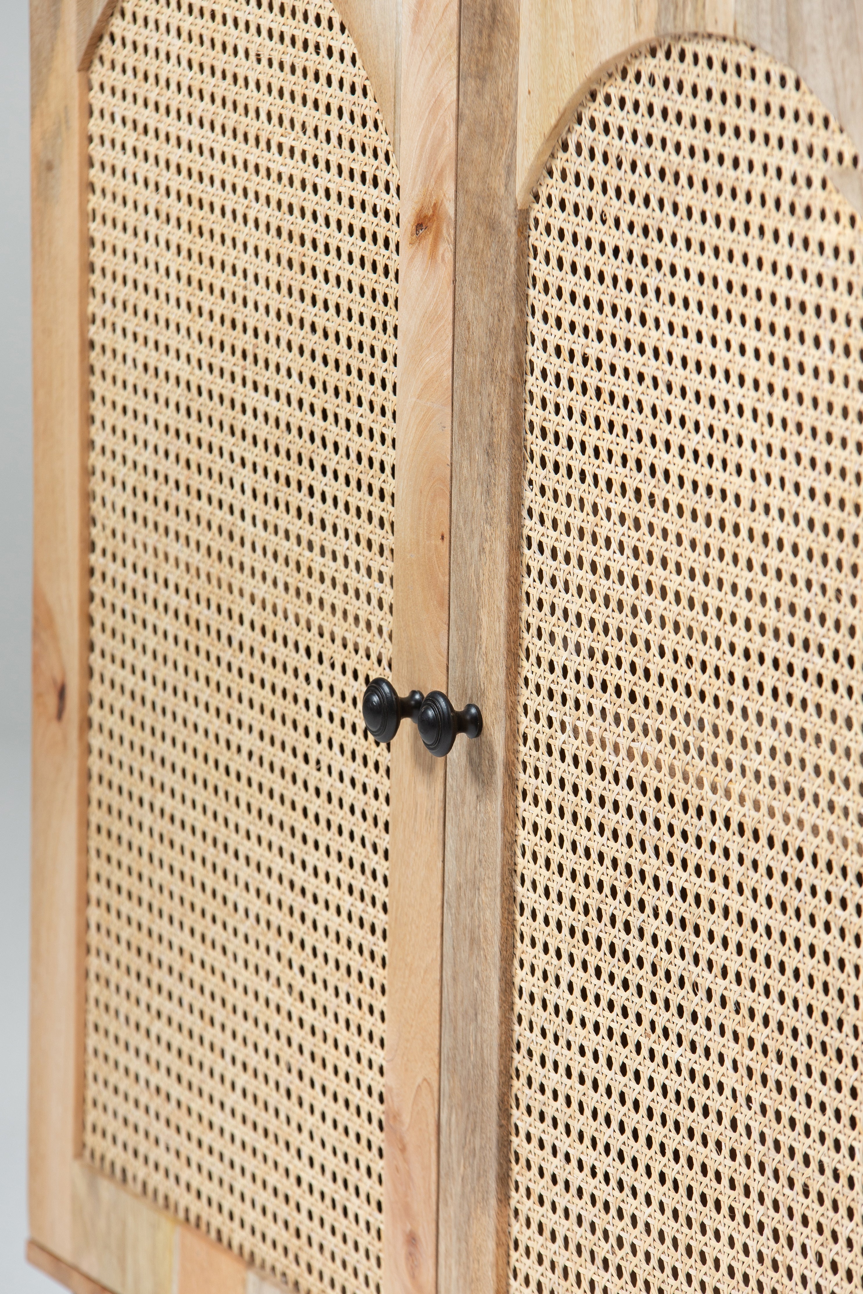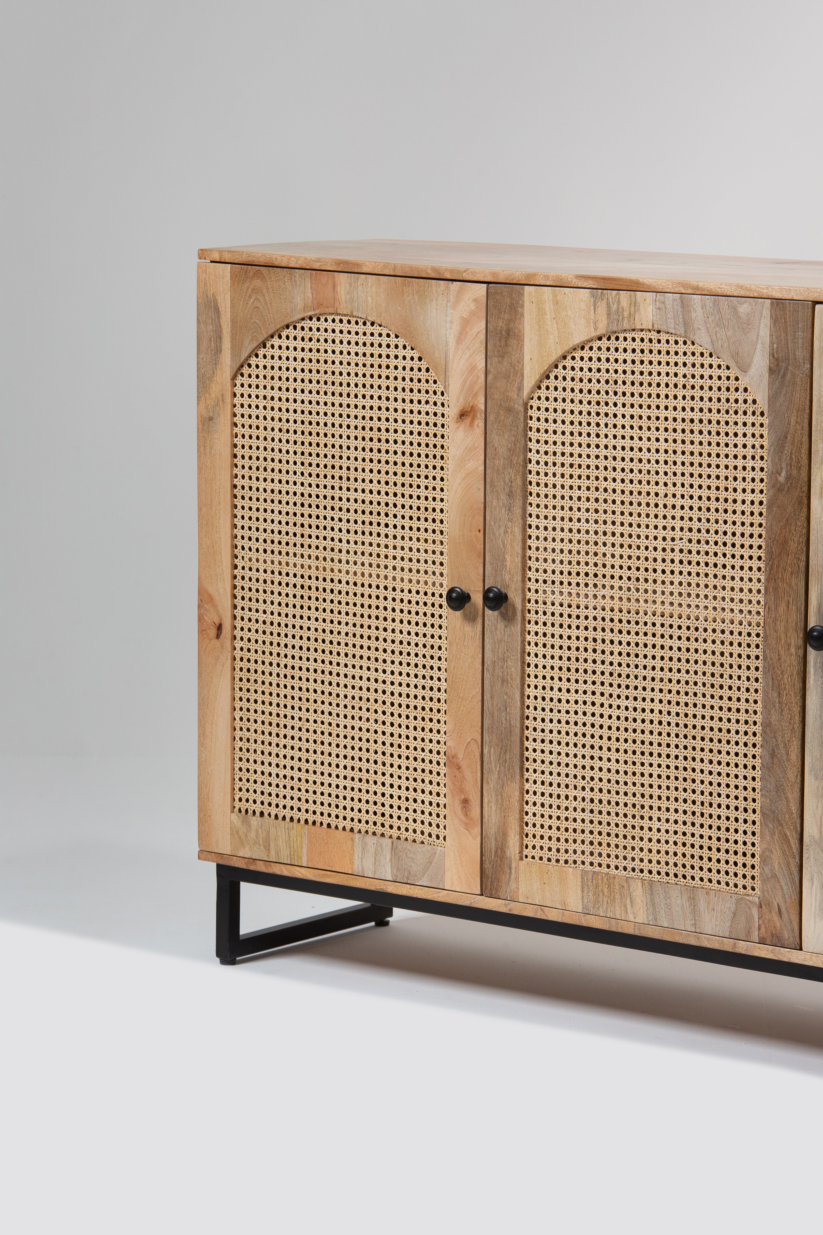 This wooden sideboard combines natural mango wood tones with intricate rattan detailing, exuding rustic elegance. The rectangular shape sits atop a minimalist black metal frame, offering a modern touch. With arched patterns on the doors and ample internal storage, it's perfect for organizing and enhancing your living or dining space.