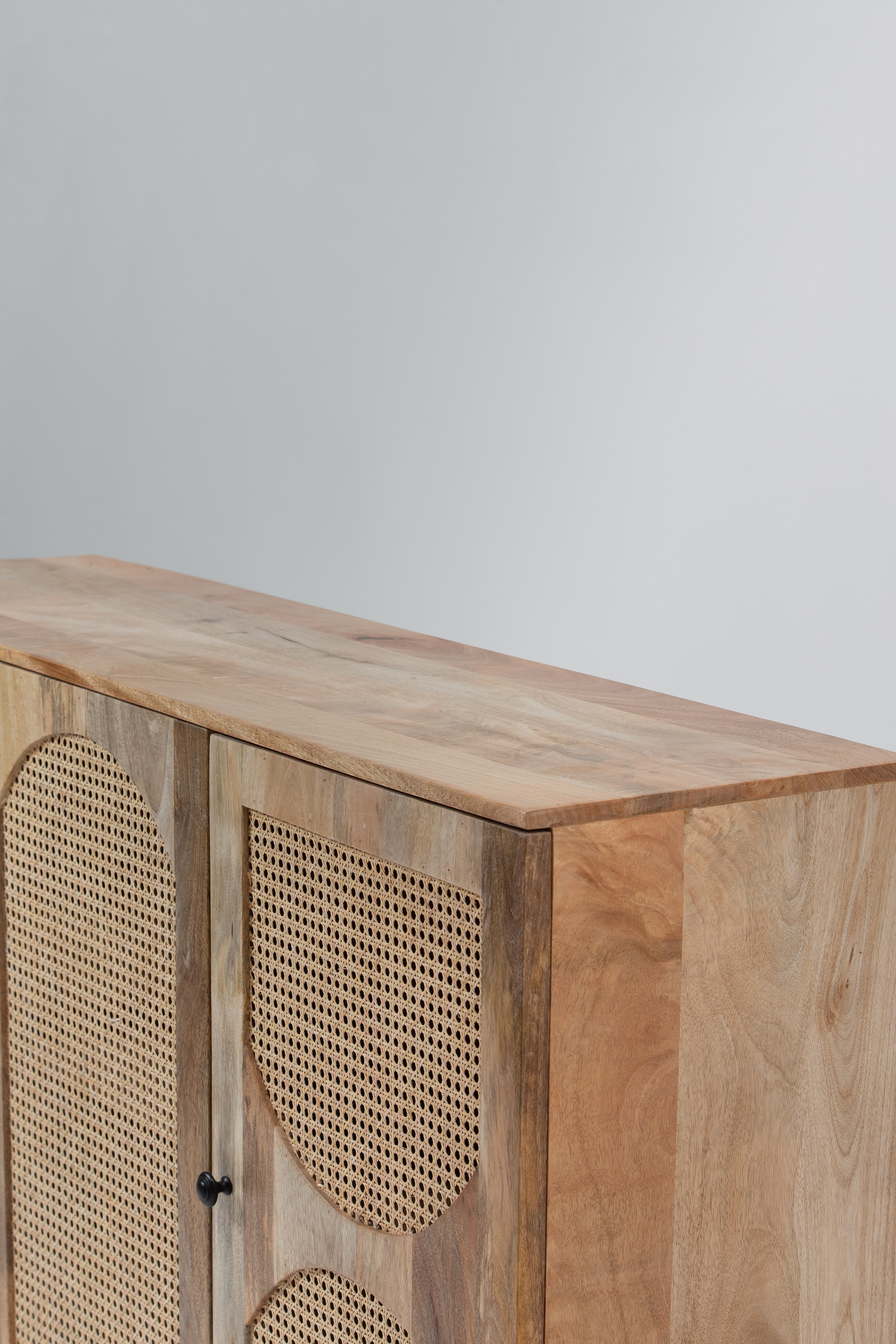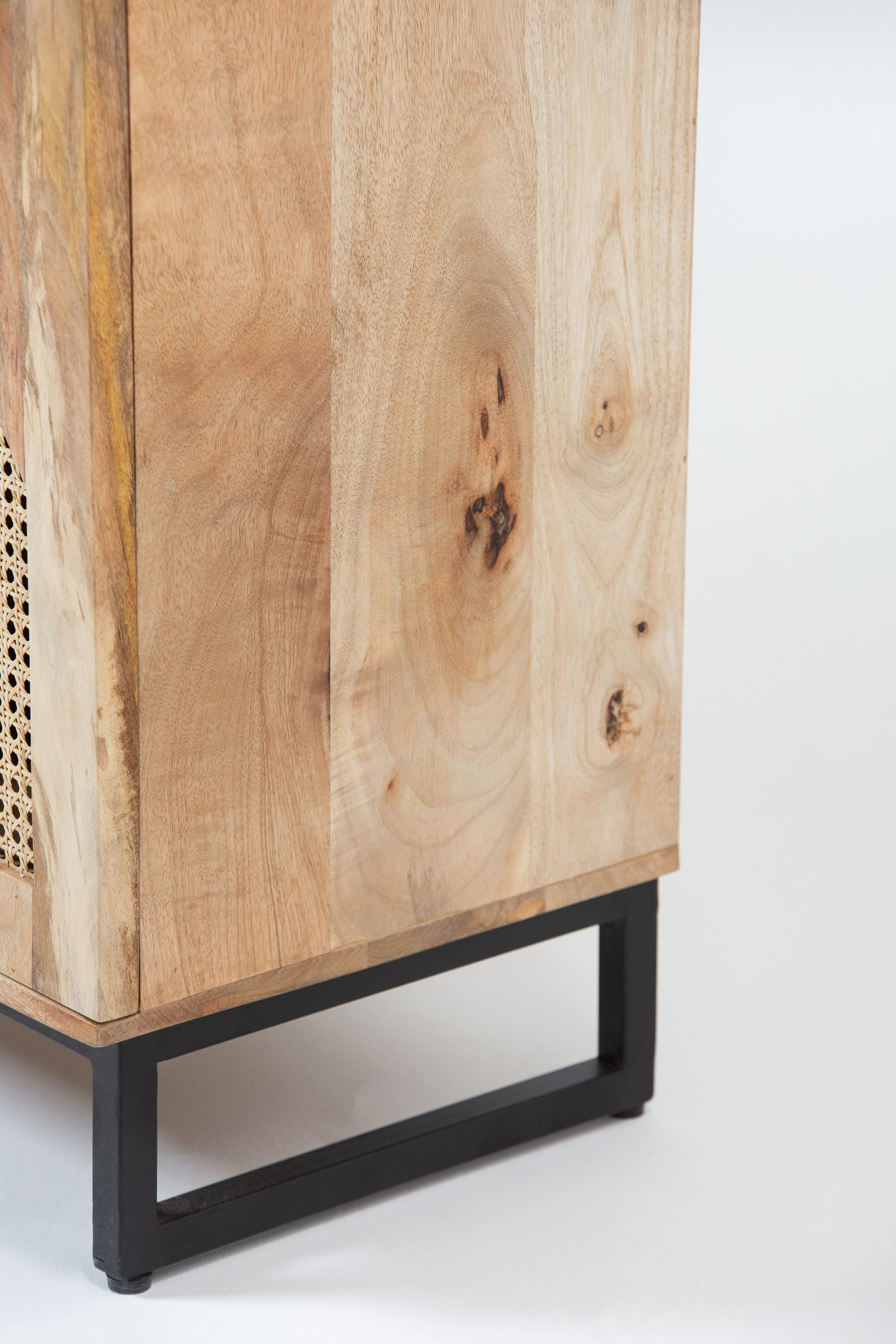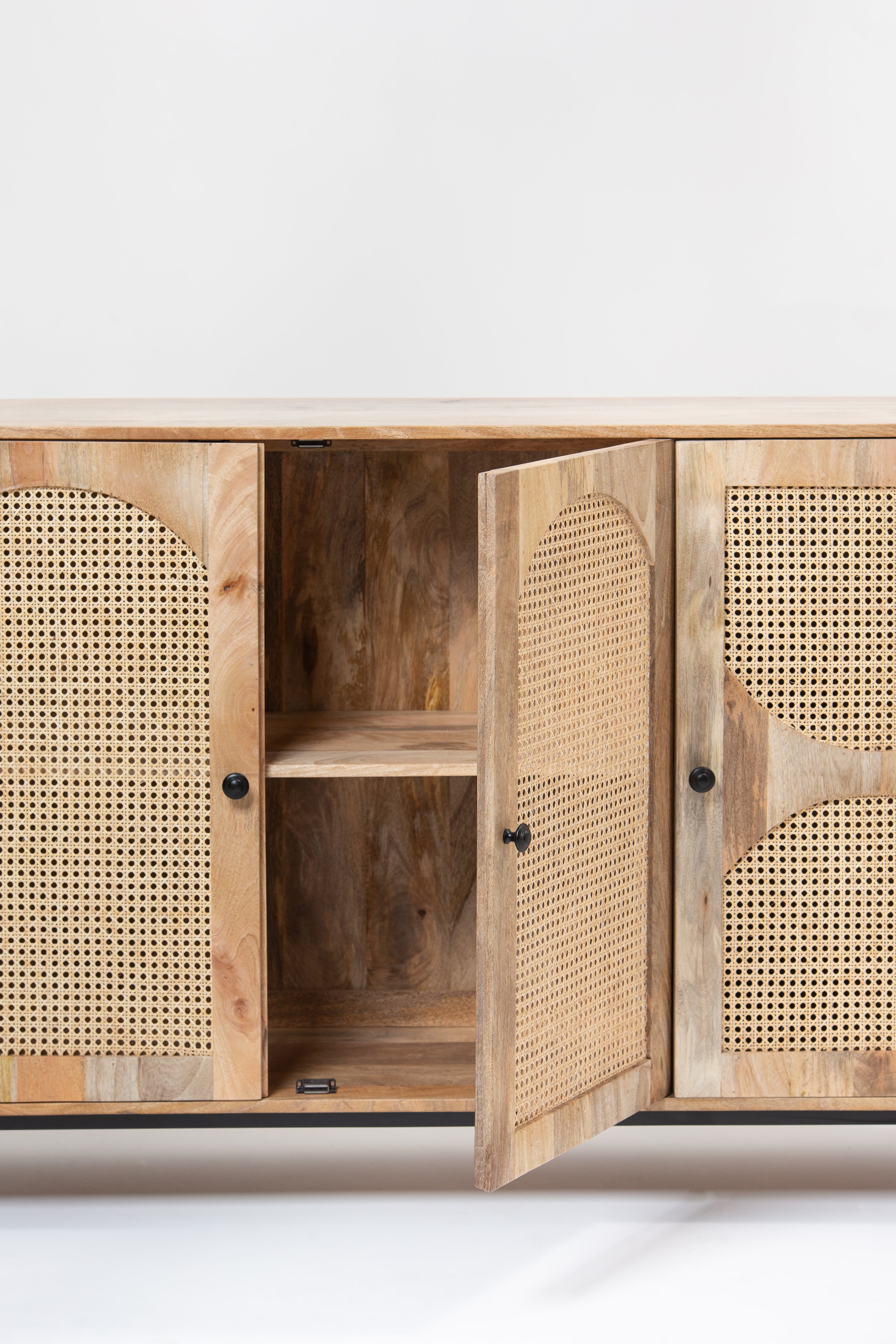 This wooden sideboard combines natural mango wood tones with intricate rattan detailing, exuding rustic elegance. The rectangular shape sits atop a minimalist black metal frame, offering a modern touch. With arched patterns on the doors and ample internal storage, it's perfect for organizing and enhancing your living or dining space.