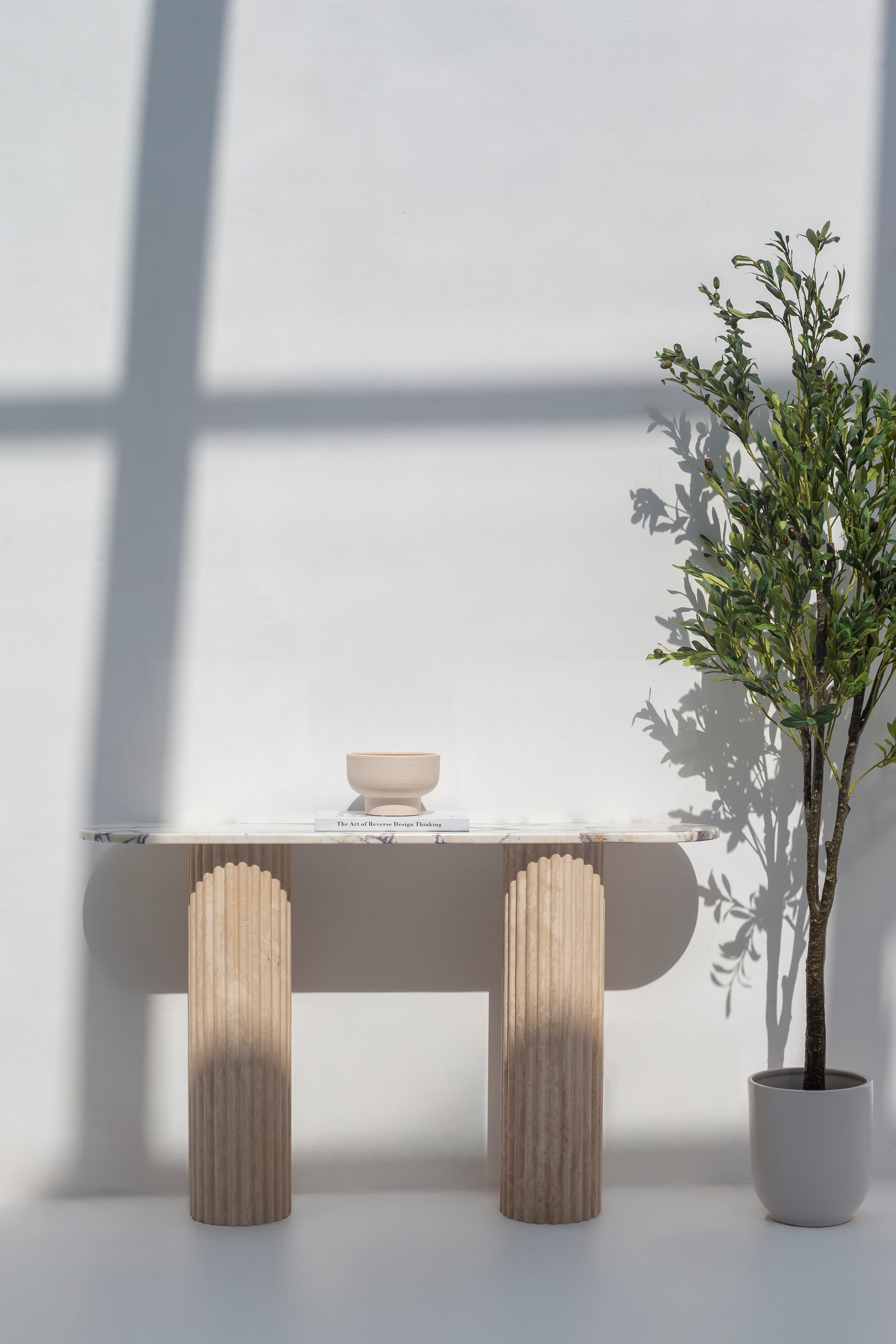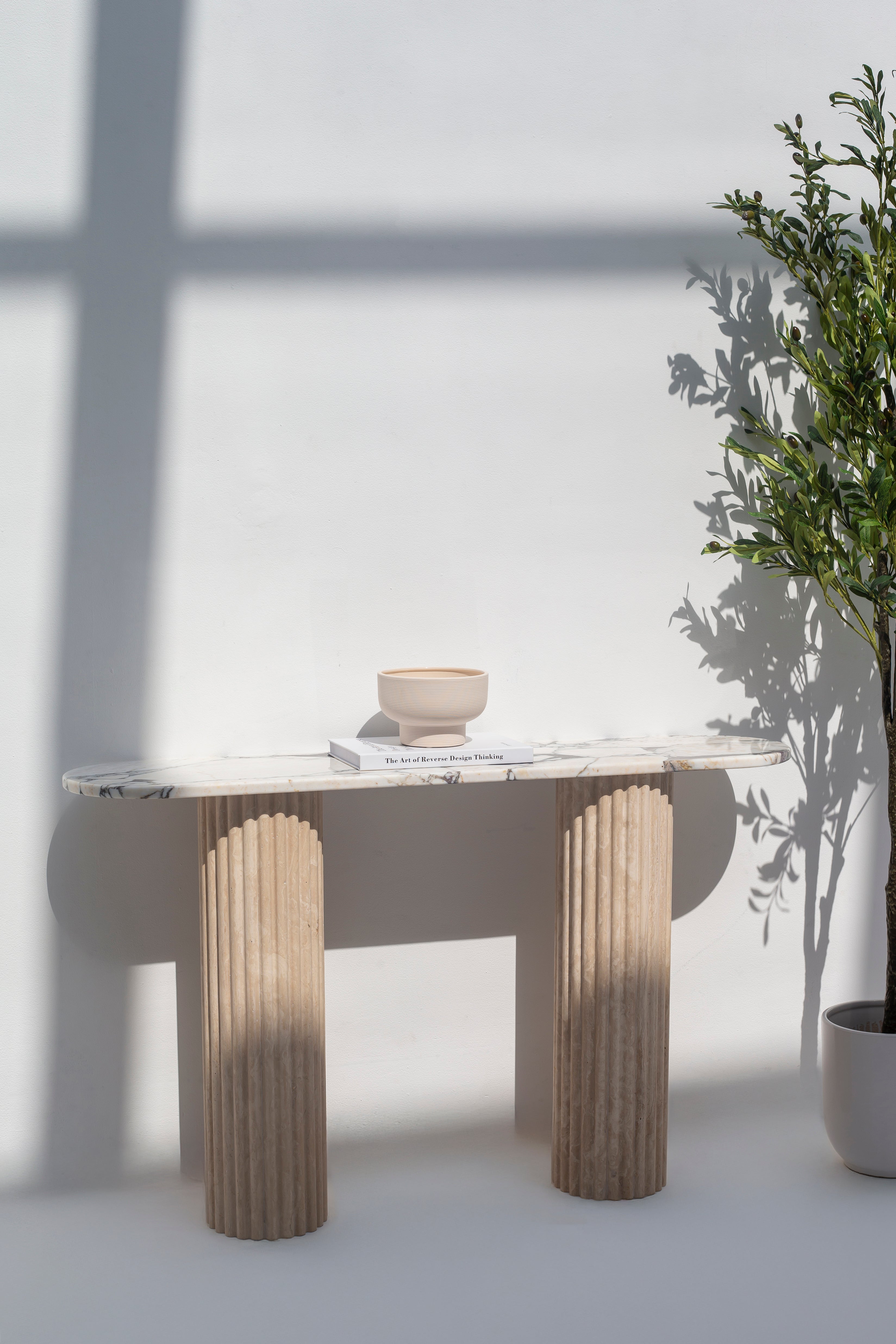 The Diletta Viola Marble Top Console Table captivates with its blend of elegance and artisanal craftsmanship. Featuring a richly veined marble top with soft cream and earthy tones, this console table exudes sophistication. The smooth, elongated surface rests gracefully atop twin column-style bases with a fluted texture, creating a striking architectural aesthetic. Ideal for entryways, living areas, or hallways, this table effortlessly complements a range of décor styles, from contemporary to classic.