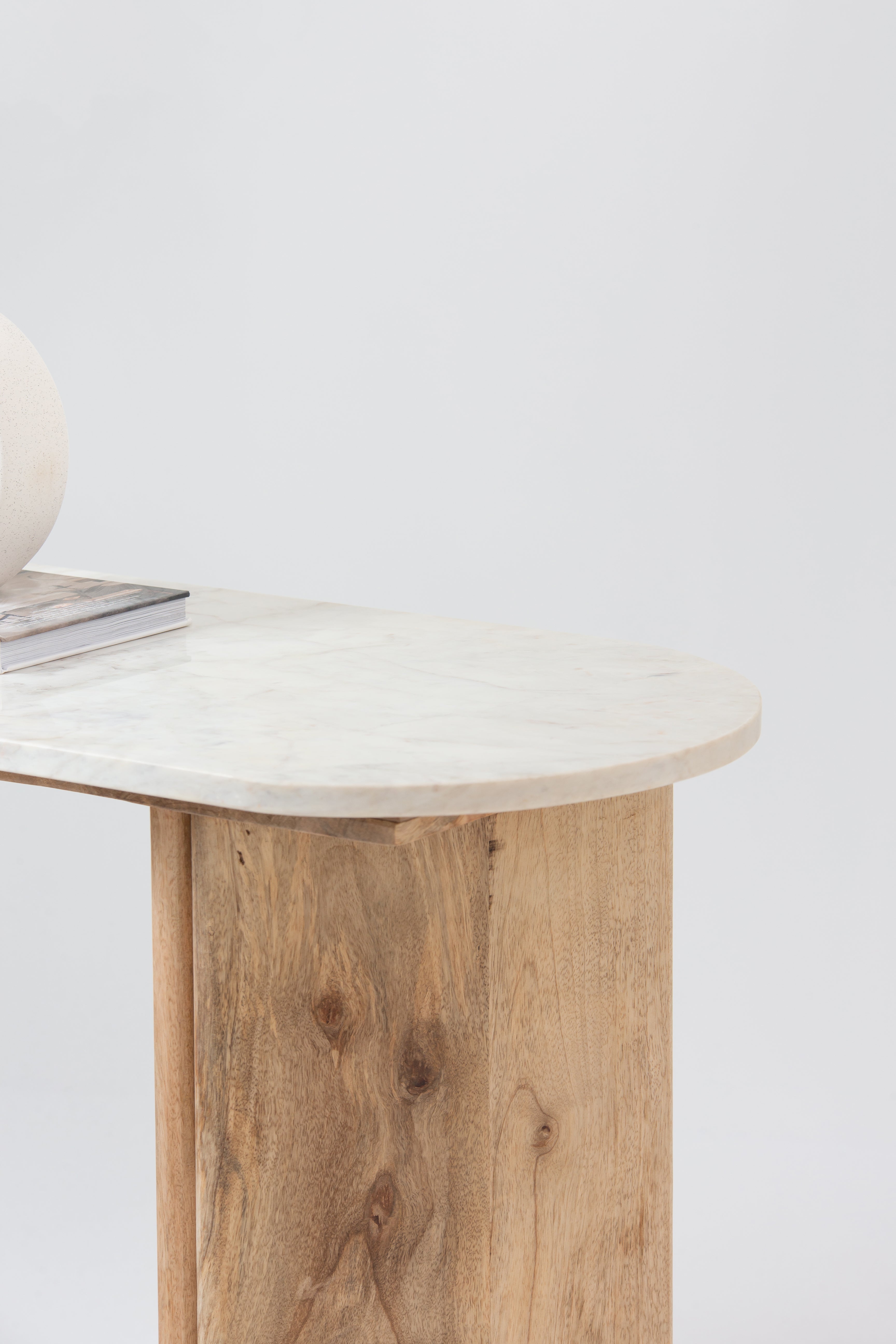 The Lydia Console Table pairs a sleek marble top with a distinctive triangular base design crafted from solid mango wood. The natural wood tones and angular silhouette create a captivating balance of elegance and modern craftsmanship, making this console table a statement piece for any space. Ideal for hallways, living rooms, or entryways, its functional yet artistic design blends seamlessly with various interior styles while offering a touch of contemporary sophistication.