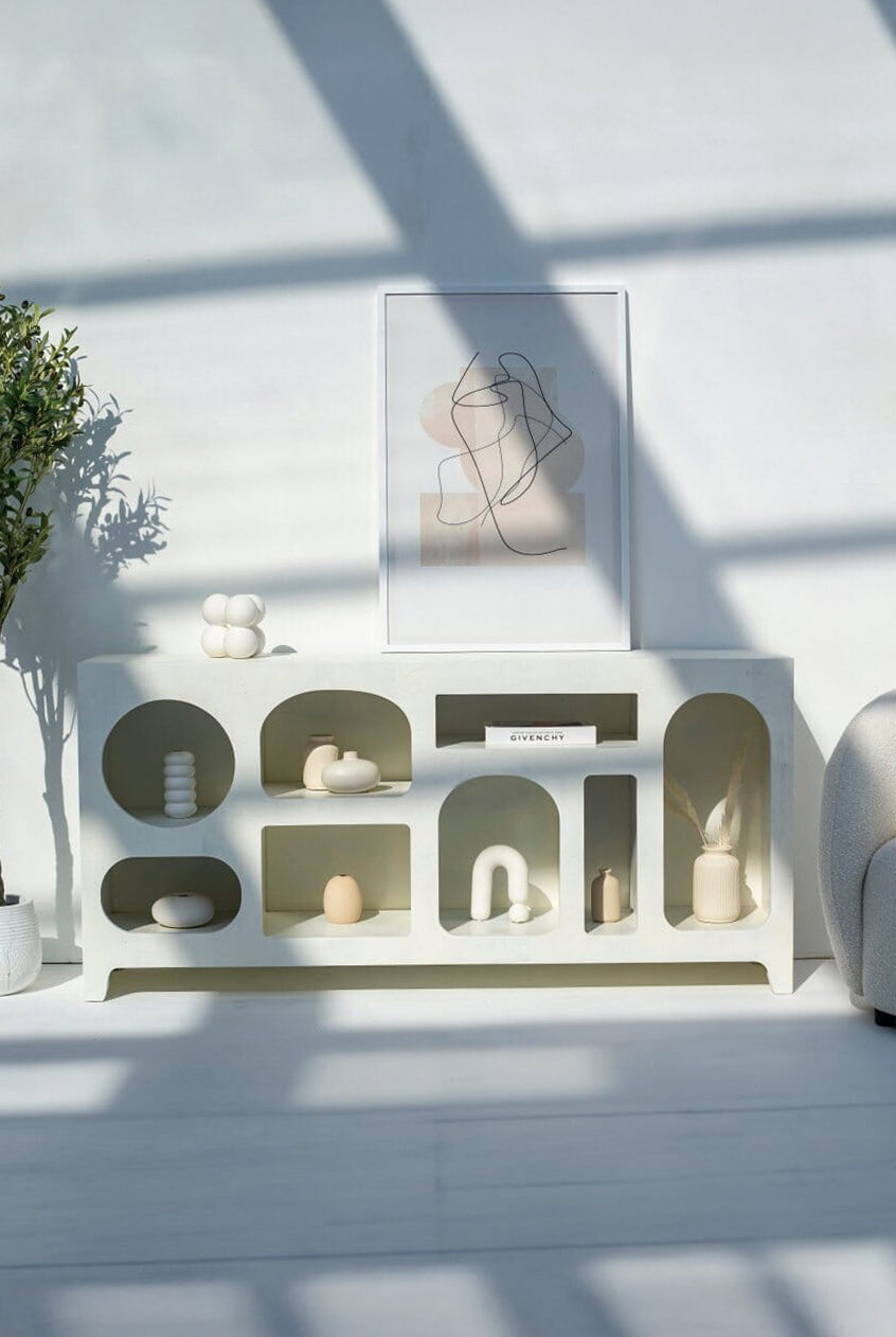 The Vilnius White Painted Display Console is a stunning blend of modern design and timeless craftsmanship. Crafted from durable mango wood, this console boasts a sleek white finish that adds a fresh and airy feel to any space. Its unique shape, featuring a series of rounded arches and clean lines, provides an elegant display solution for your favorite décor pieces. The open shelving design allows for easy access and visibility, making it perfect for showcasing decorative items, books, or personal treasures.