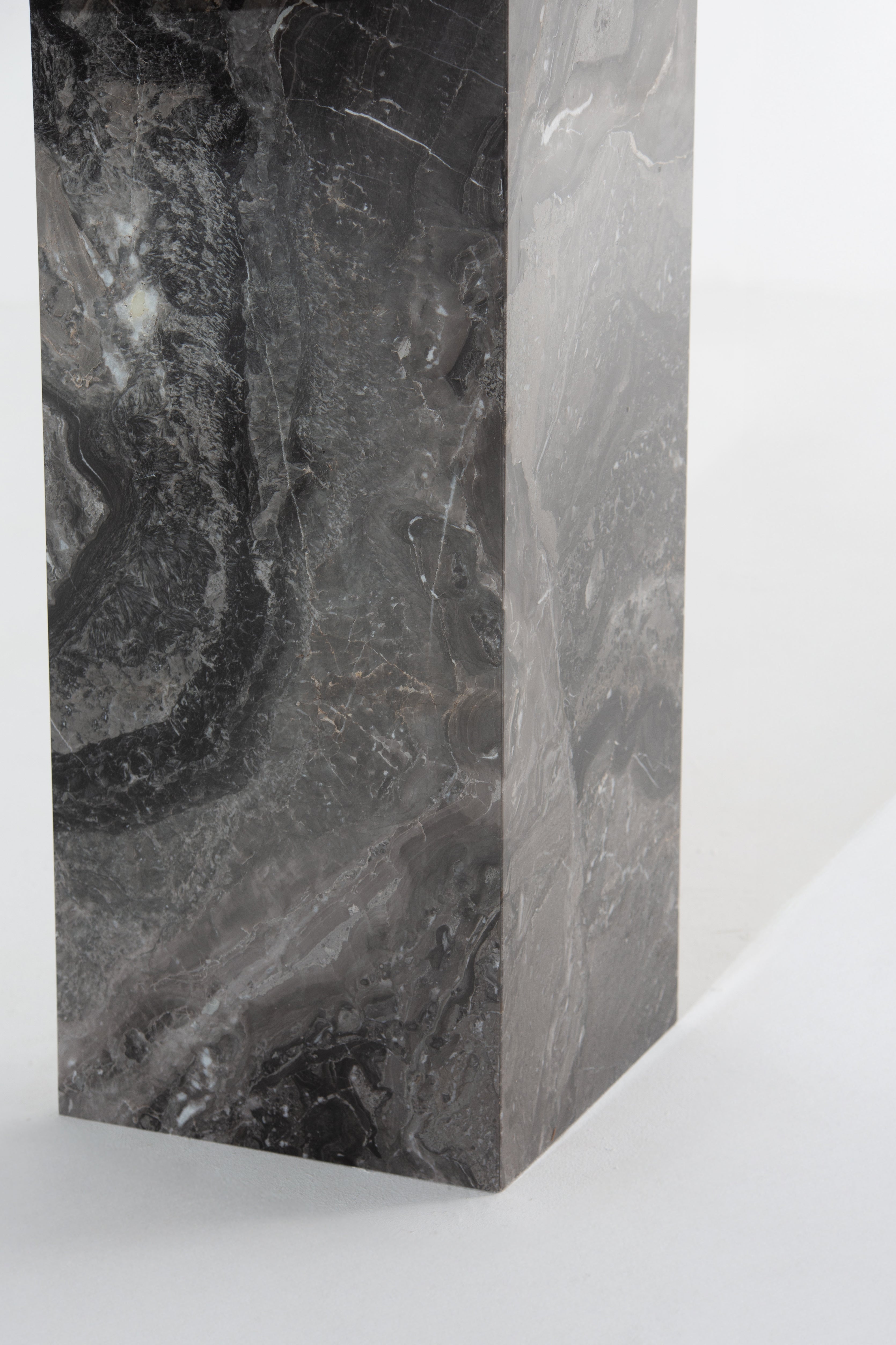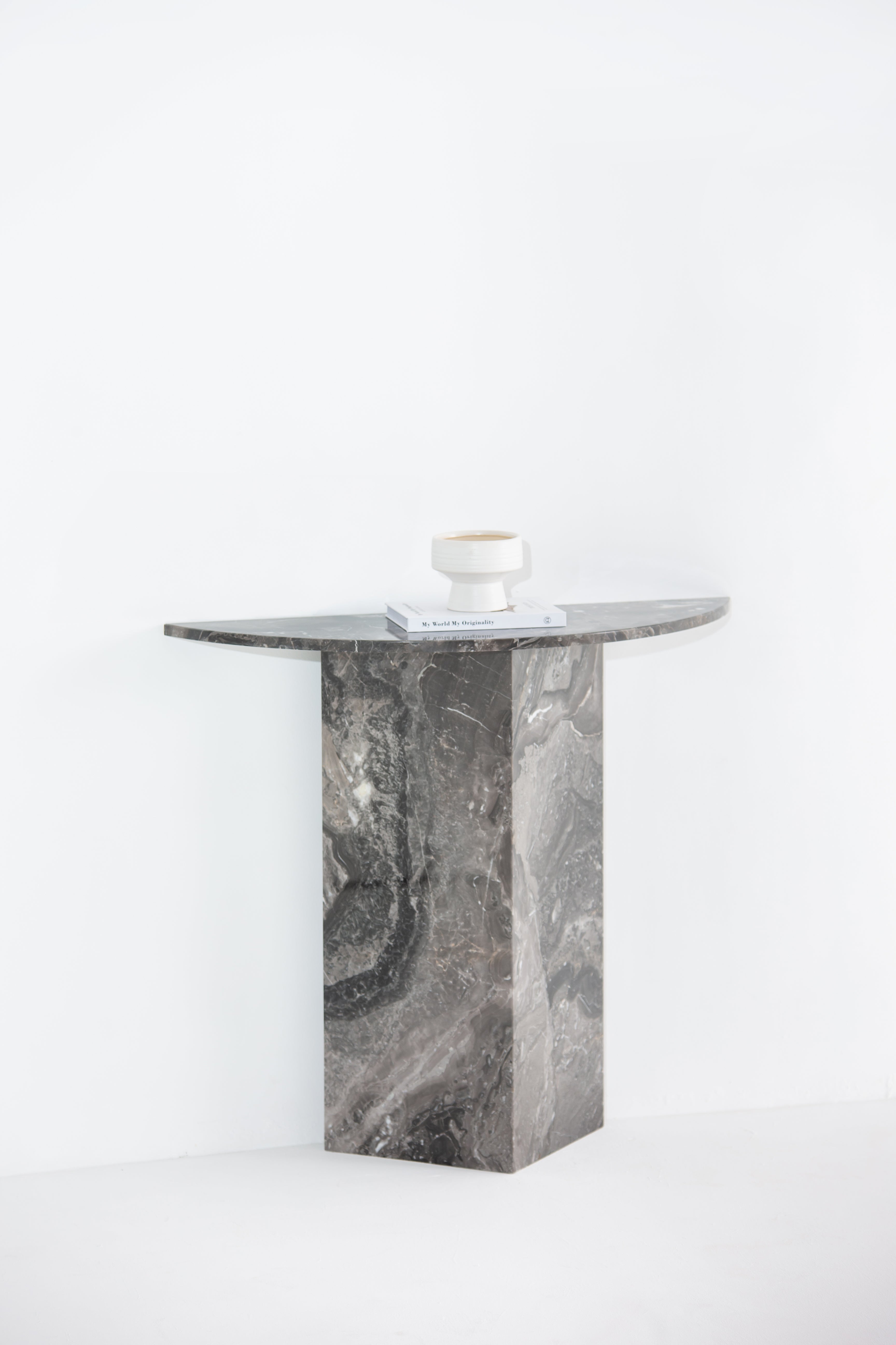 A bold blend of minimalism and luxury, the Orobico Grey Marble Console Table is designed to make a sculptural statement. Featuring a rounded-edge oval top balanced over a single monolithic base, this piece embraces architectural restraint while showcasing the rich veining and tonal depth of Orobico grey marble. The deep, swirling patterns of the stone add a dramatic touch, while the clean silhouette keeps the design grounded and versatile. Ideal for use in entryways, narrow corridors, living spaces, or under artwork, this console table functions as both a surface and a statement.