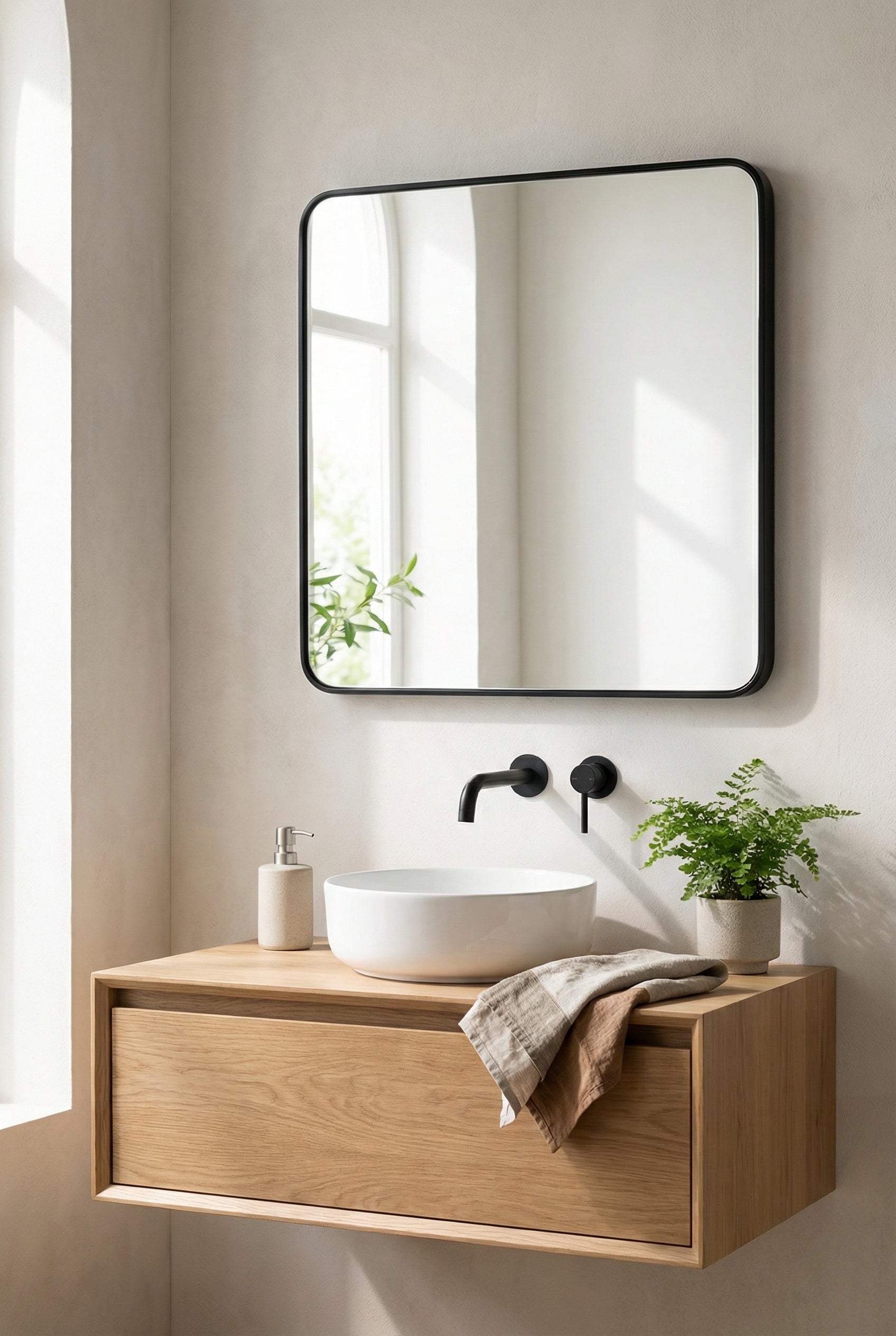 Infuse your home with a touch of minimalist elegance with this square wall mirror. The clean lines and rounded corners of the sleek black frame give it a modern yet soft aesthetic, while the large reflective surface brightens up your space. This versatile piece of home decor is a fantastic addition to any living room, bedroom, or entryway, creating the illusion of more space and light. Its timeless design seamlessly complements a wide range of interior styles, from contemporary to classic.