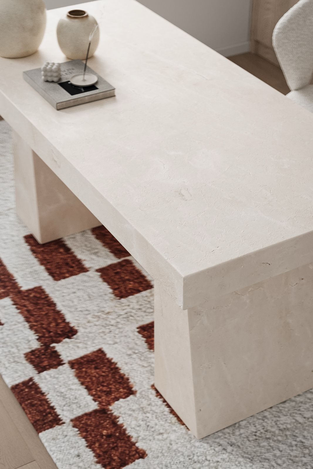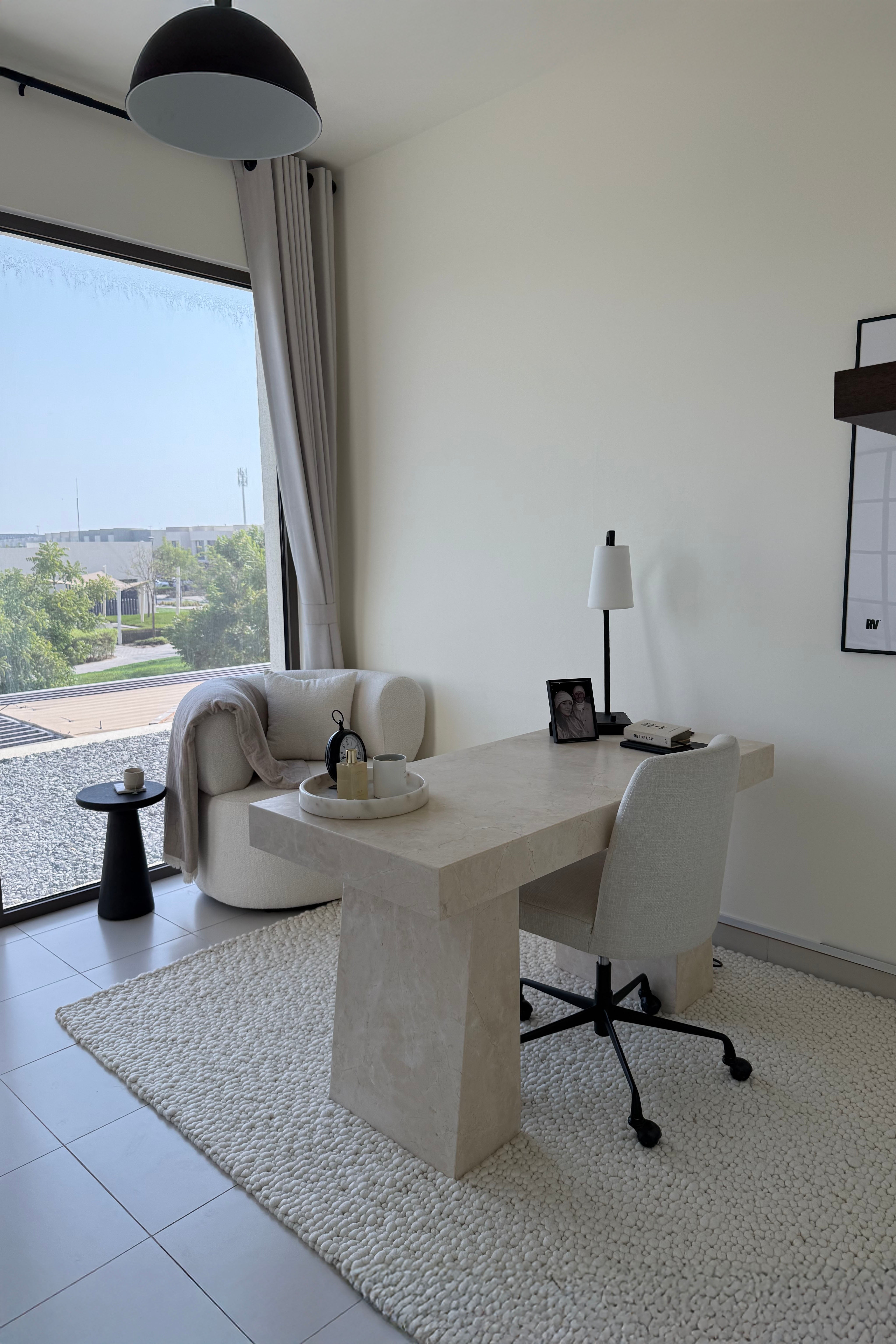 Command attention the moment you enter your workspace with this statement-making Olga Crema Marble Desk—a sculptural centrepiece crafted for refined interiors in the UAE. Carved from solid crema marble, its honed matte finish reveals rich natural veining, while the monolithic trapezoid legs anchor the piece with architectural depth. The minimalist silhouette, smooth texture, and warm beige undertone lend a serene luxury to home offices, executive spaces, or creative studios. Pair it with boucle seating and statement decor to complete your vision. Perfectly suited for modern, contemporary, or minimalist homes seeking premium marble desks.