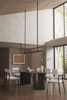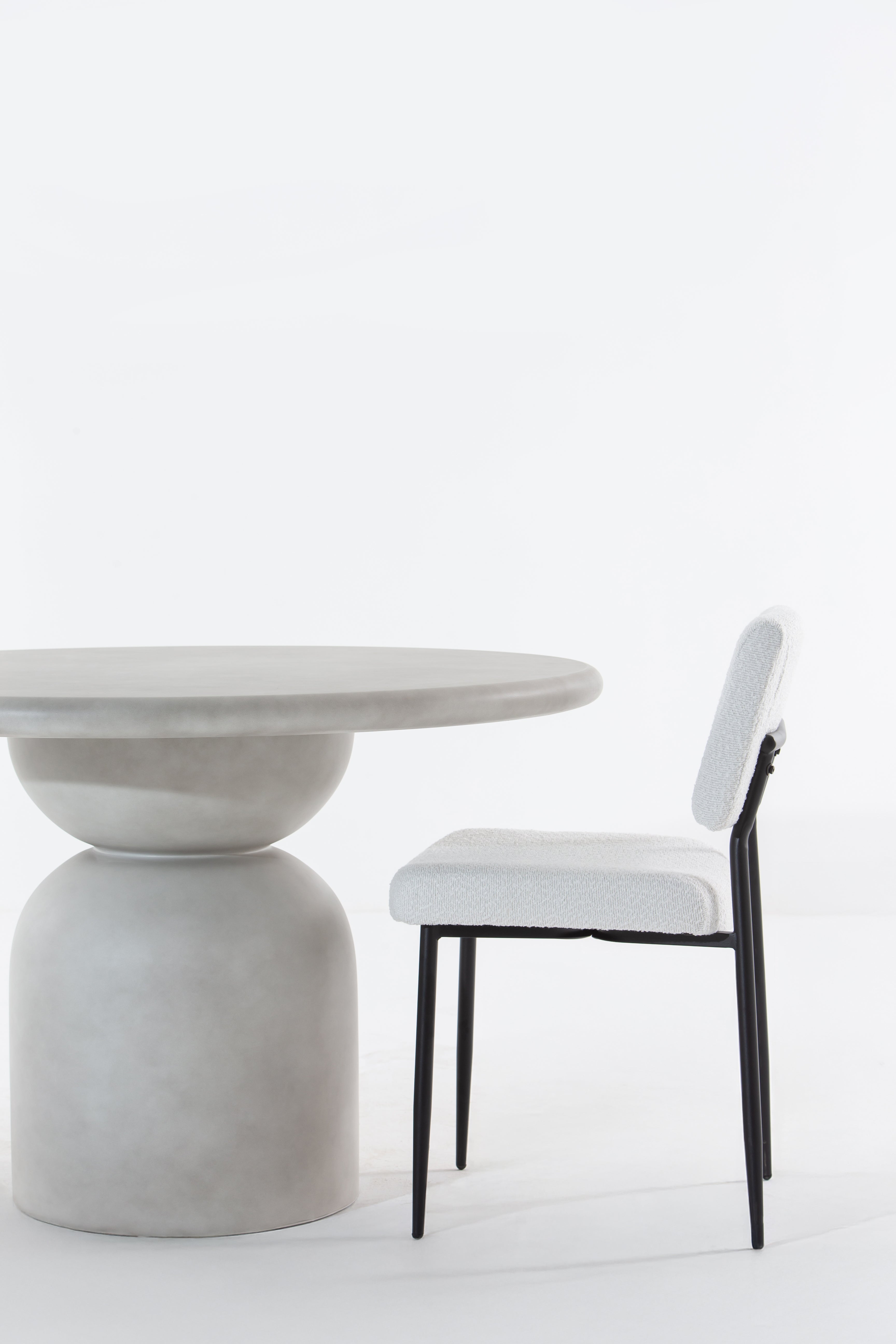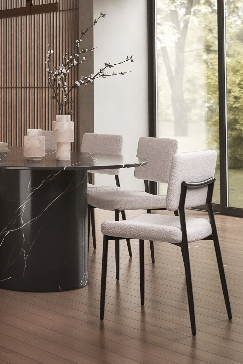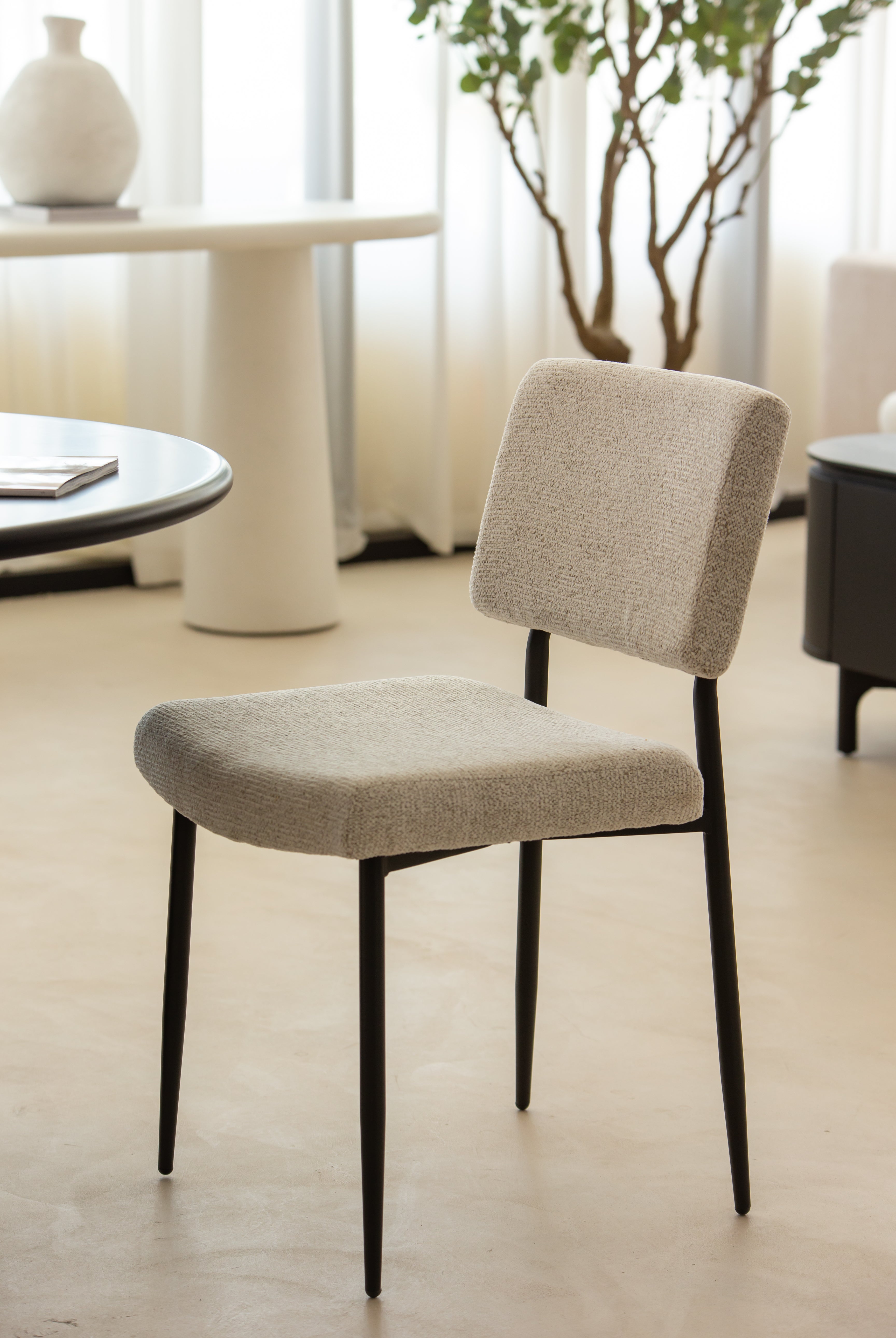 A refined balance of comfort and style, this dining chair enhances your space with its textured fabric seat and powder-coated metal legs. The soft, neutral upholstery adds warmth, while the sleek black frame provides contrast for a modern touch. A gently curved backrest and plush cushioning ensure lasting comfort, making every meal feel inviting. Whether styled in a contemporary dining setup or as an accent chair, its minimalist form effortlessly complements various interiors.