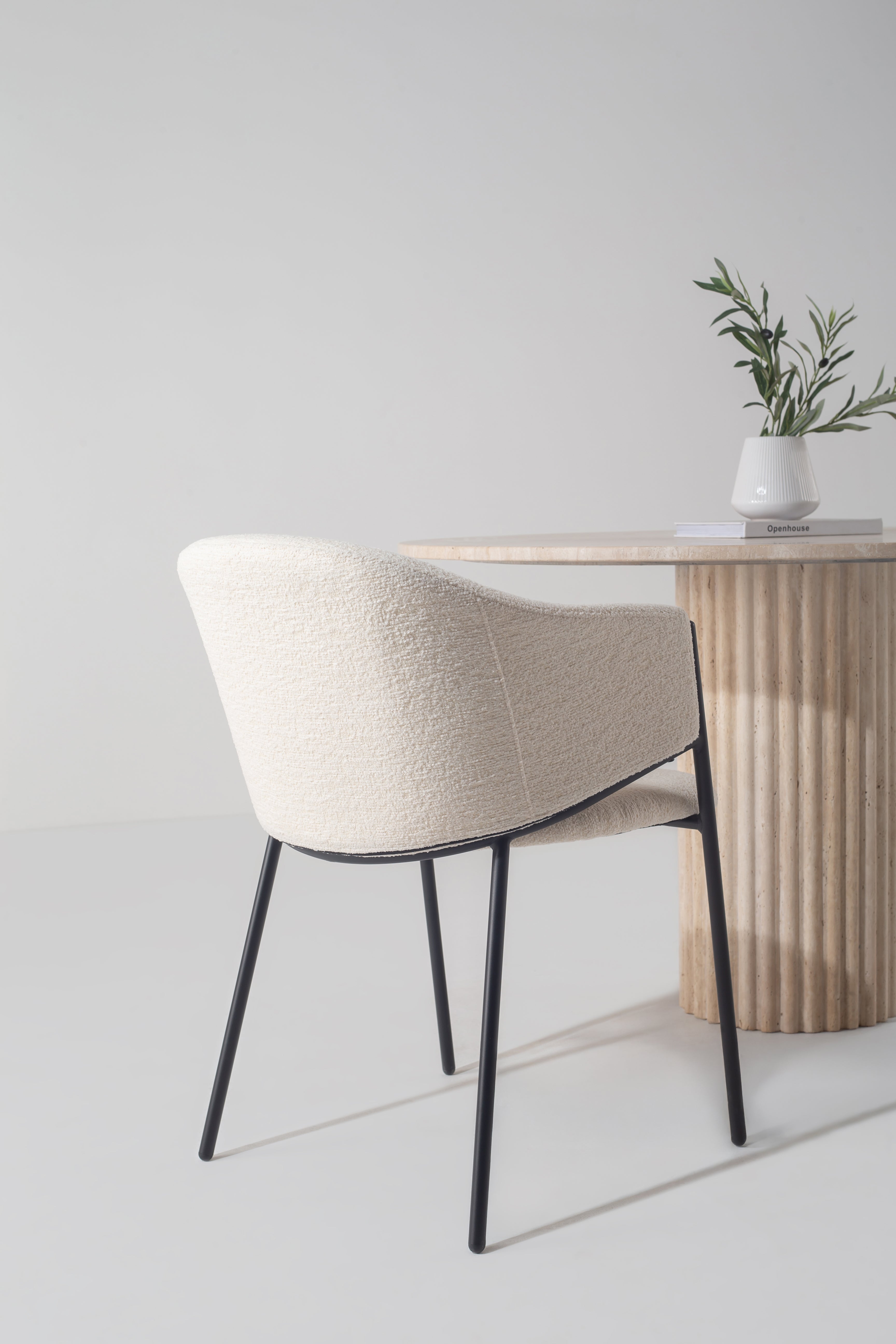 Designed with elegance in mind, this boucle dining chair features a softly curved backrest and a cozy textured upholstery, offering a refined yet comfortable seating experience. Its sleek frame and tapered legs provide a modern minimalist aesthetic, perfectly complementing contemporary dining setups.