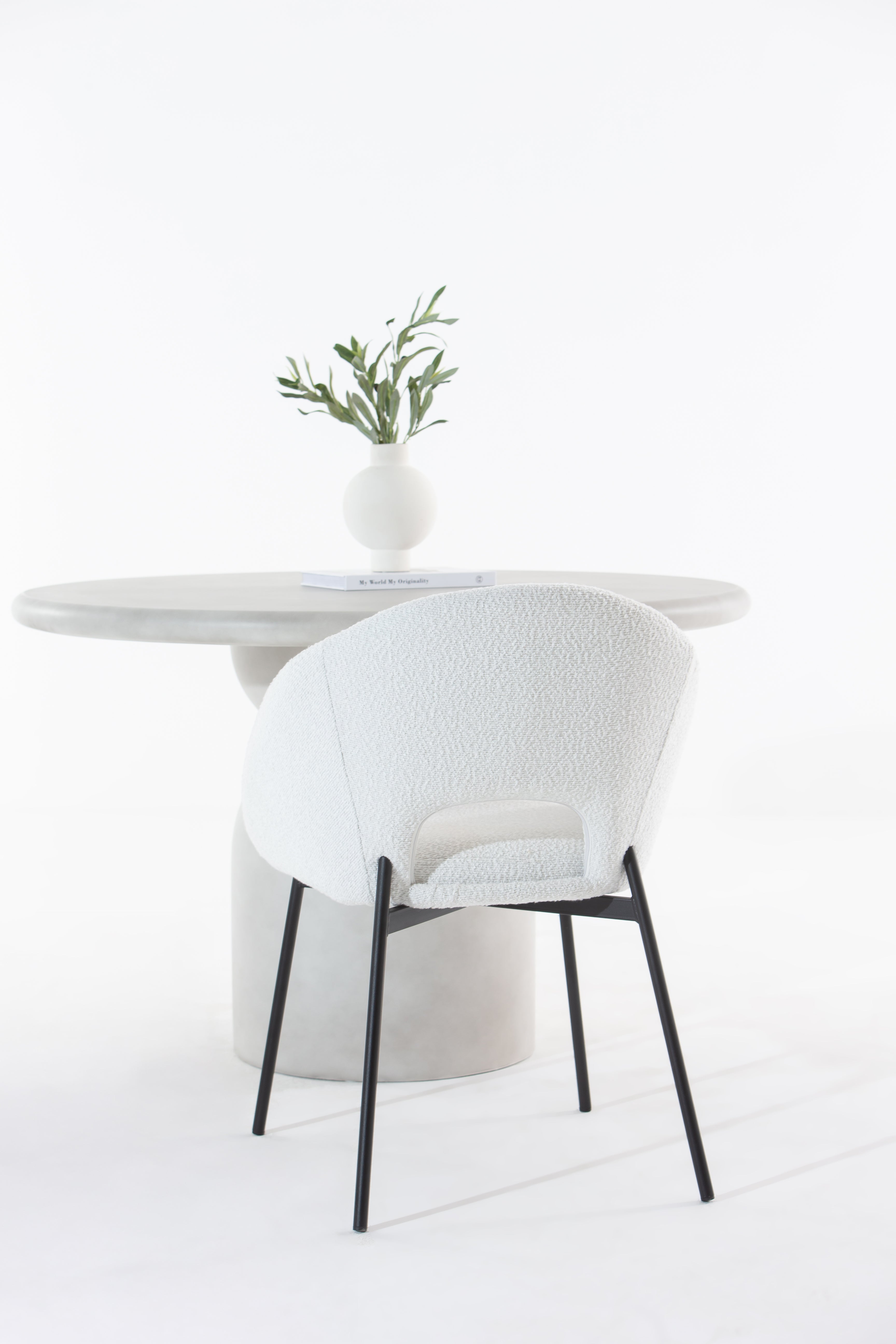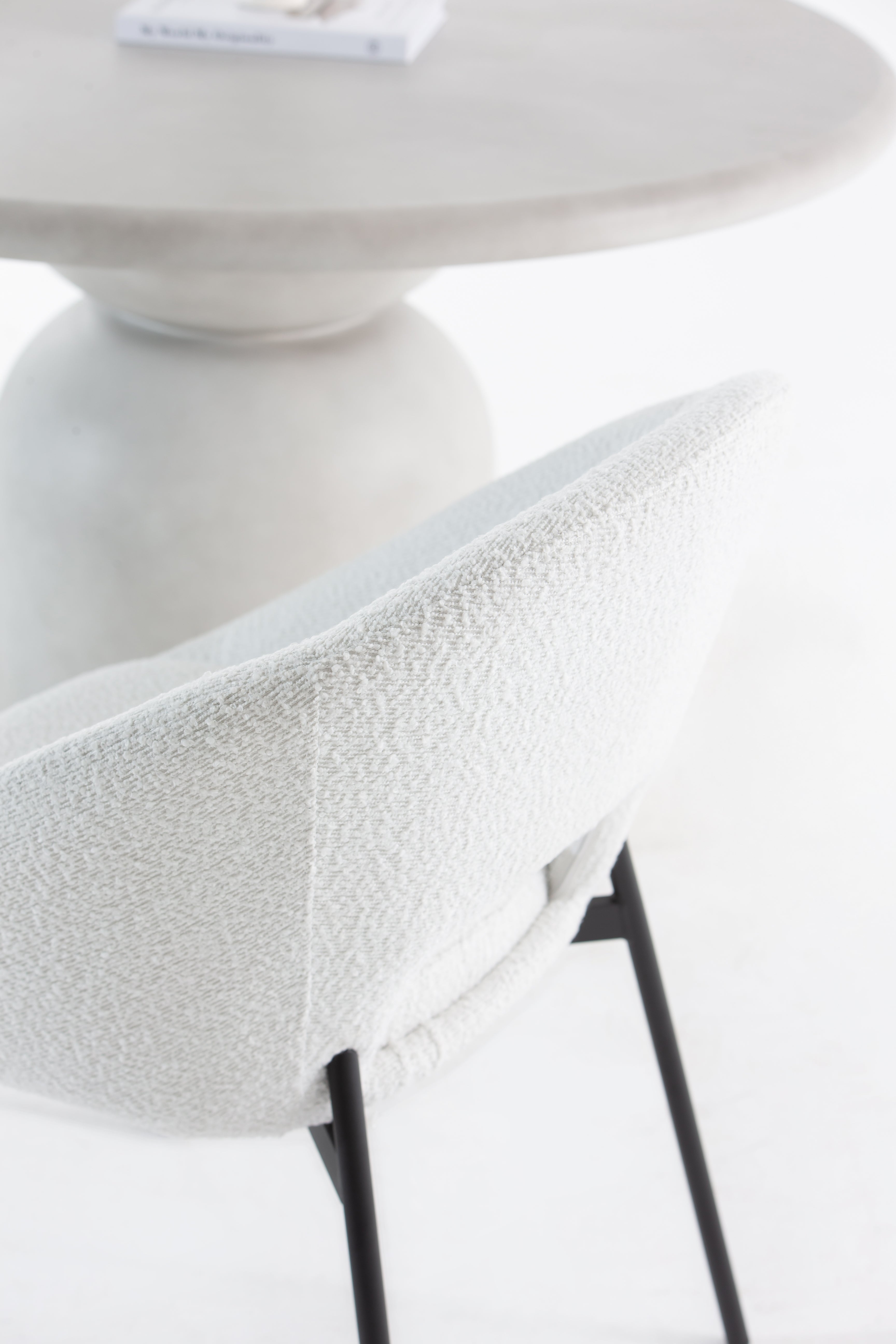 Step into timeless elegance with Boucle Dining Chair, where Grecian charm meets modern minimalism. As you settle into the plush, boucle upholstery in off-white, the gently curved backrest and sculpted cut-out embrace your posture with style and support. Its sleek black legs add contrast and stability, making it a striking yet versatile addition to your dining space. Whether you're hosting or unwinding, the Delos transforms everyday dining into a refined experience. Ideal for contemporary or minimalist this boucle dining chair is your perfect blend of comfort, design, and sophistication.