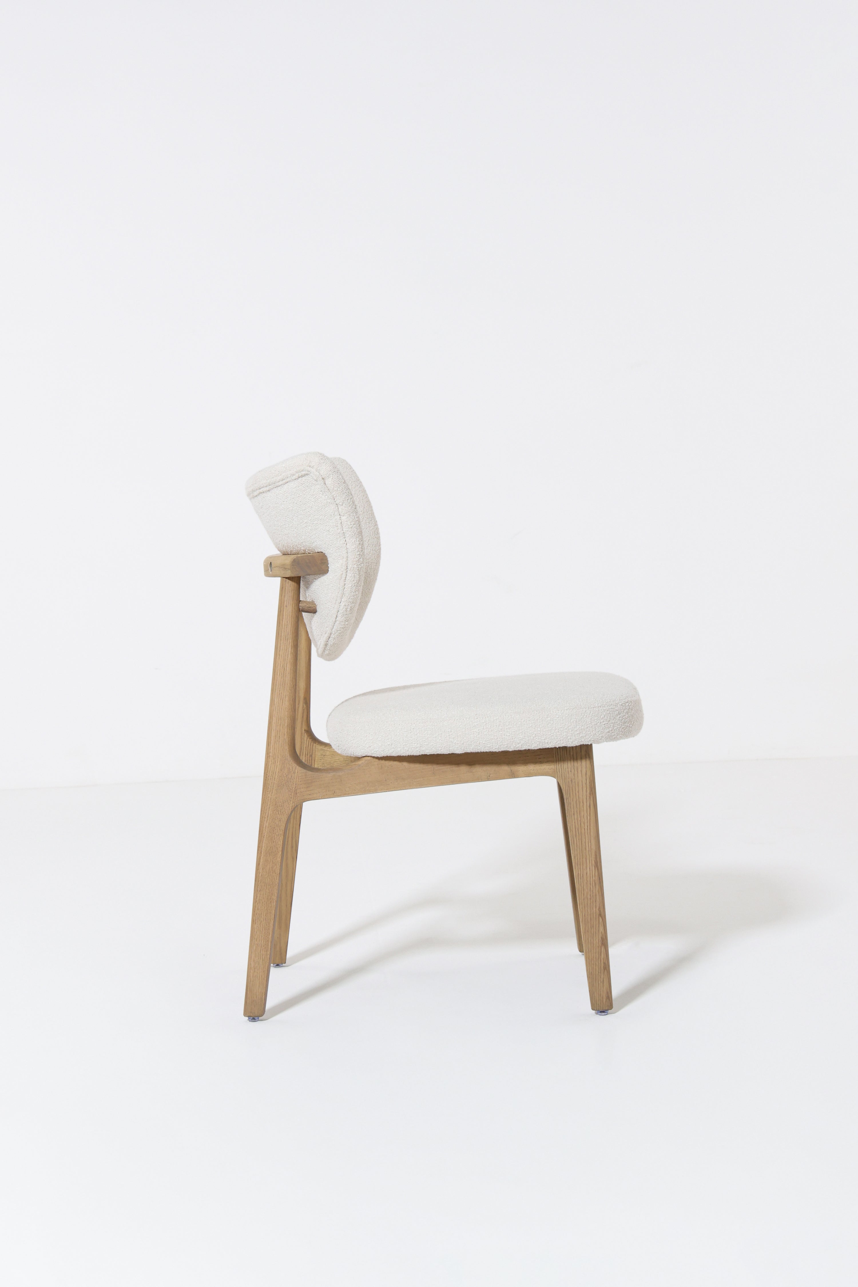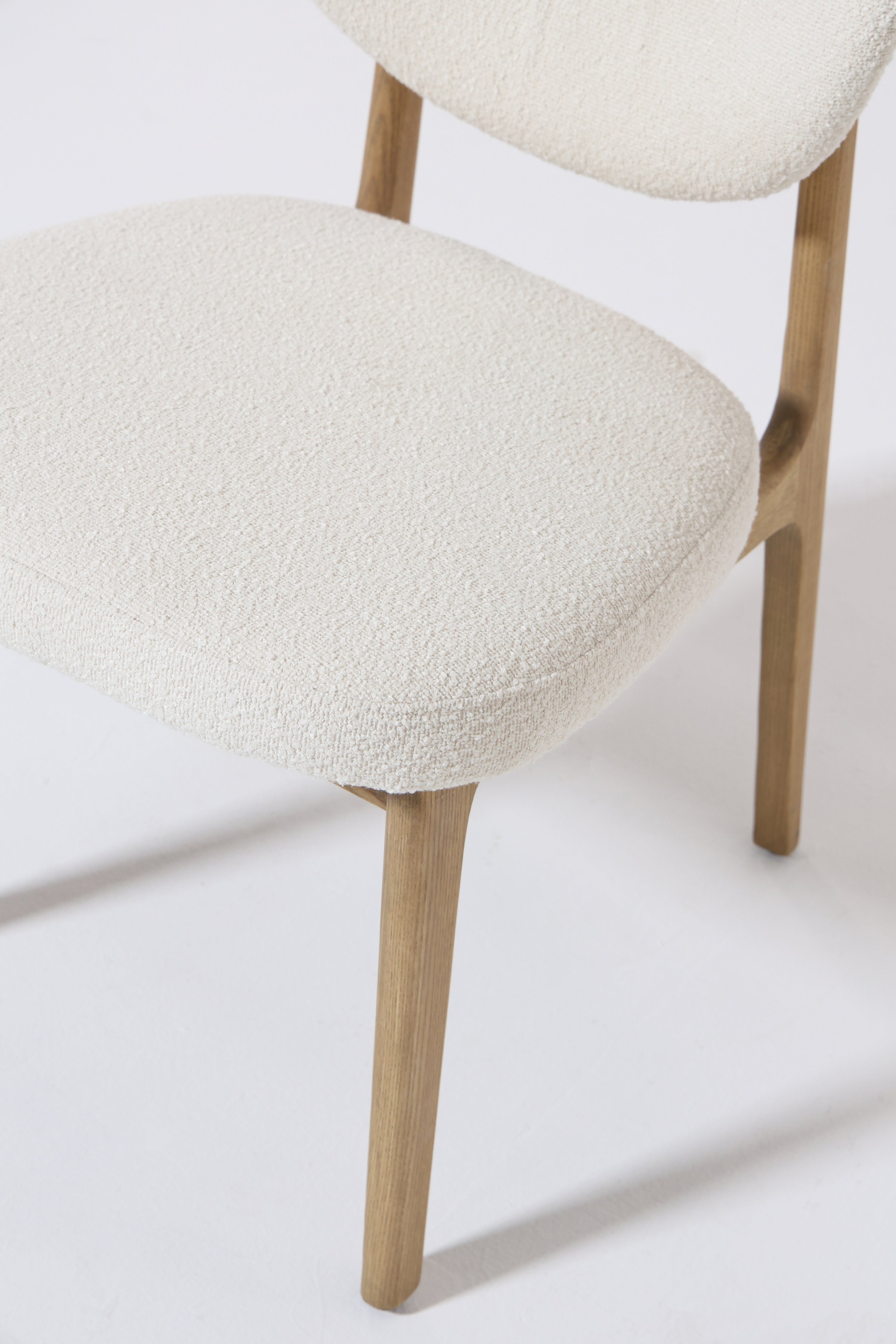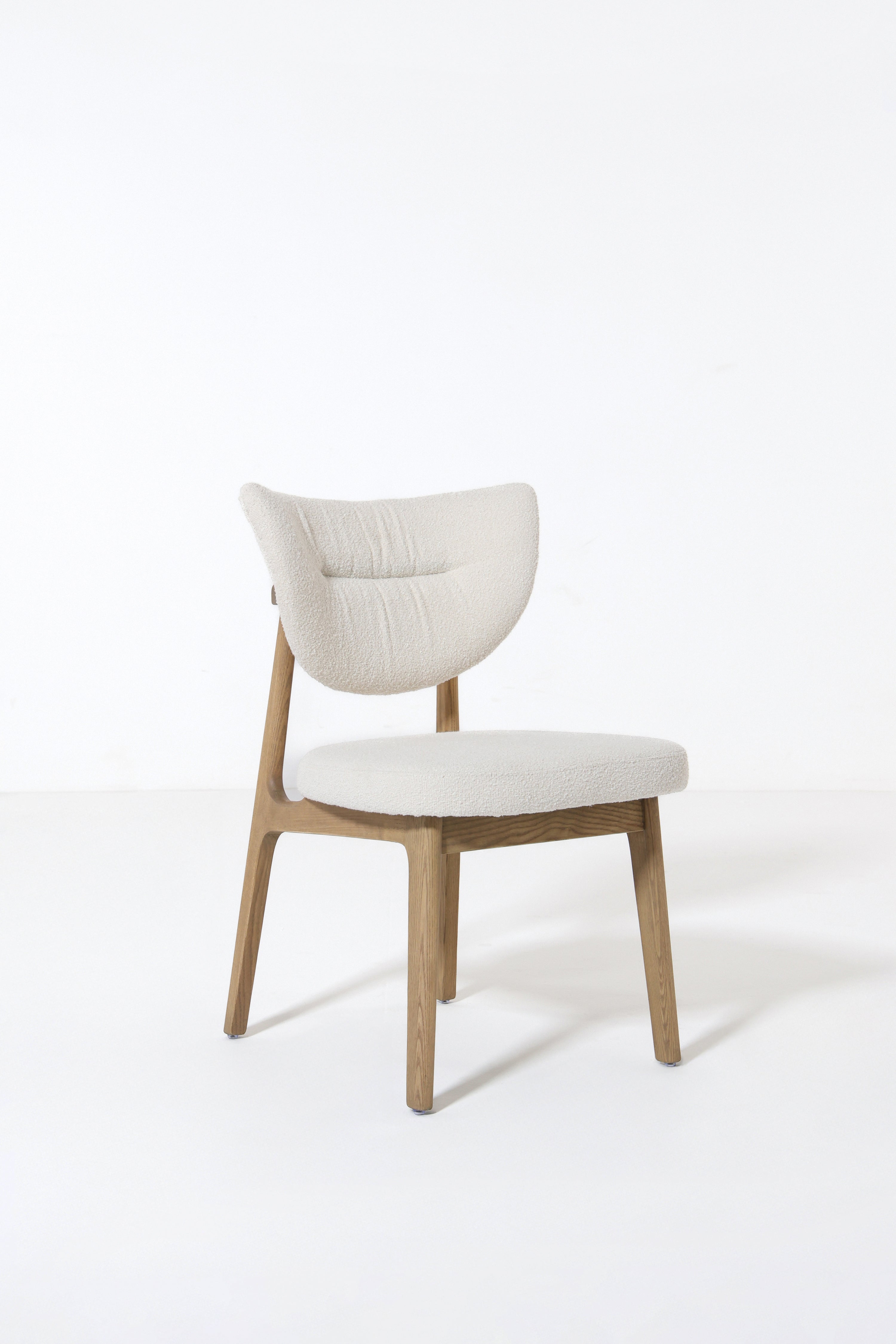 Bring elegance and comfort to your dining space with a chair designed to blend modern minimalism and timeless warmth. The natural wooden frame in a light oak finish showcases clean, sculpted lines, while the upholstered seat and curved backrest in soft off-white fabric provide support and sophistication. Its refined silhouette and versatile neutral tones make it the perfect companion for both contemporary and classic interiors, transforming every meal into a stylish experience.
