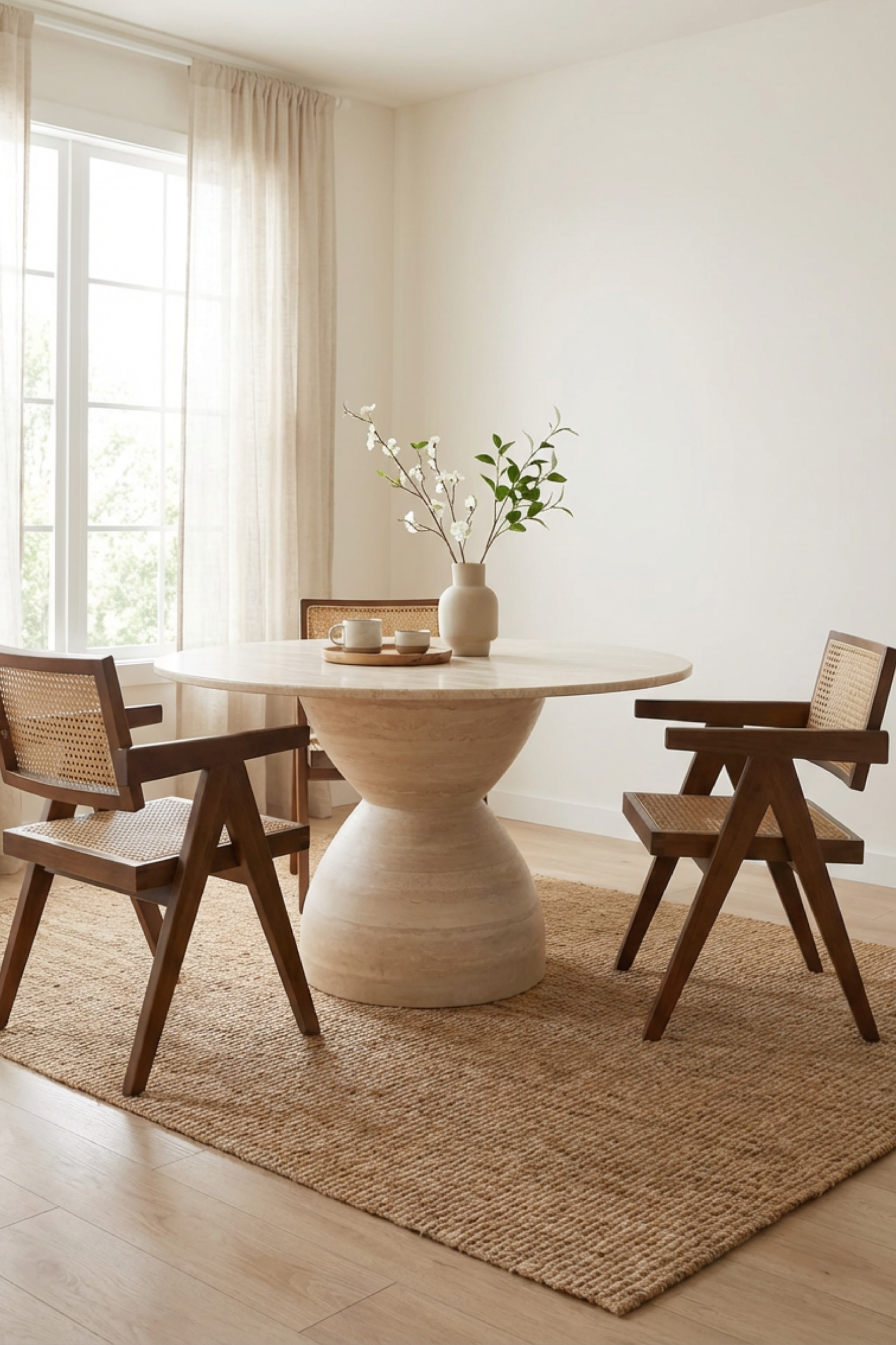 Neutral Palette: Embrace a neutral color palette with soft tones for walls, table linens, and accessories to highlight the warmth of the wood and the natural aesthetic of rattan.