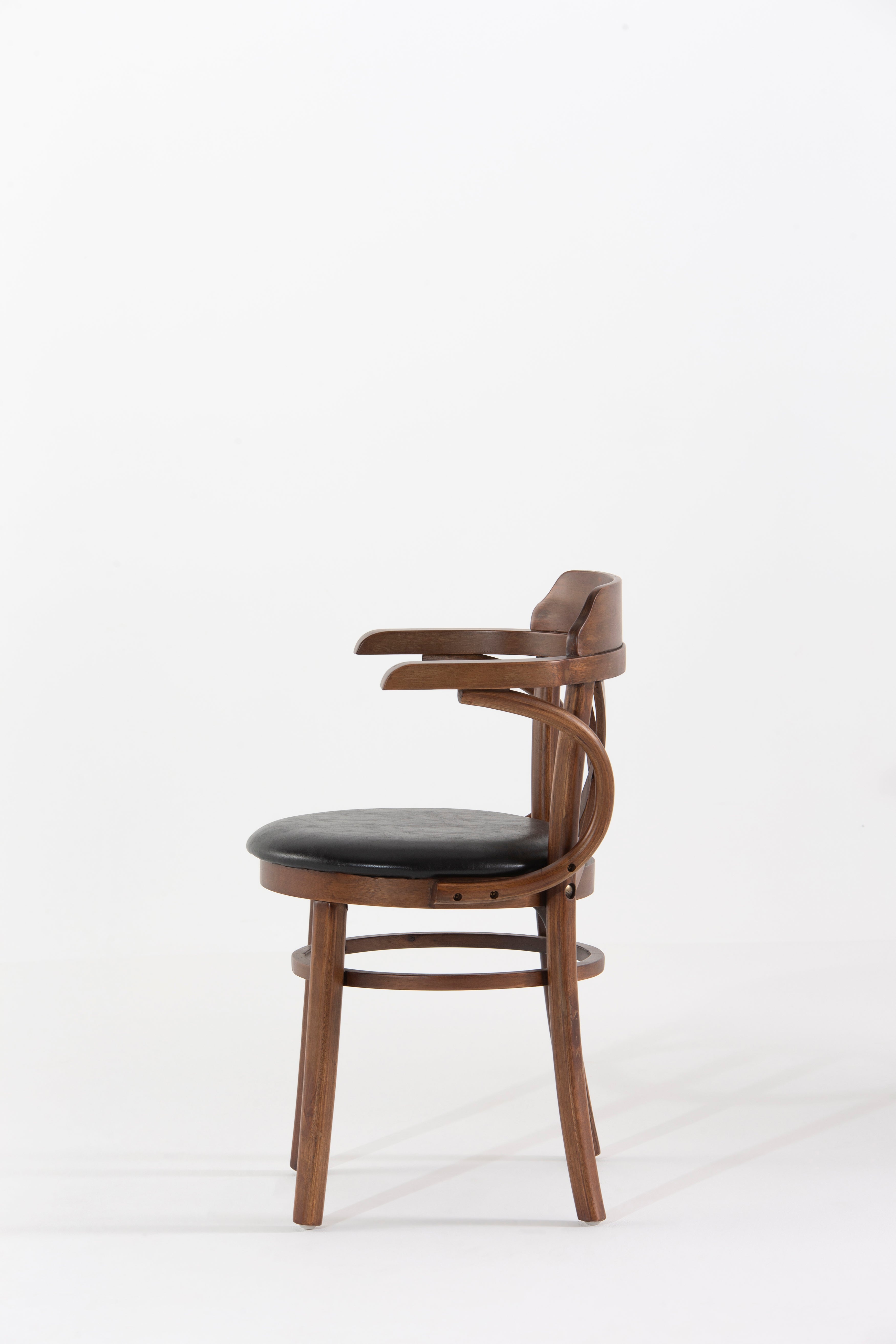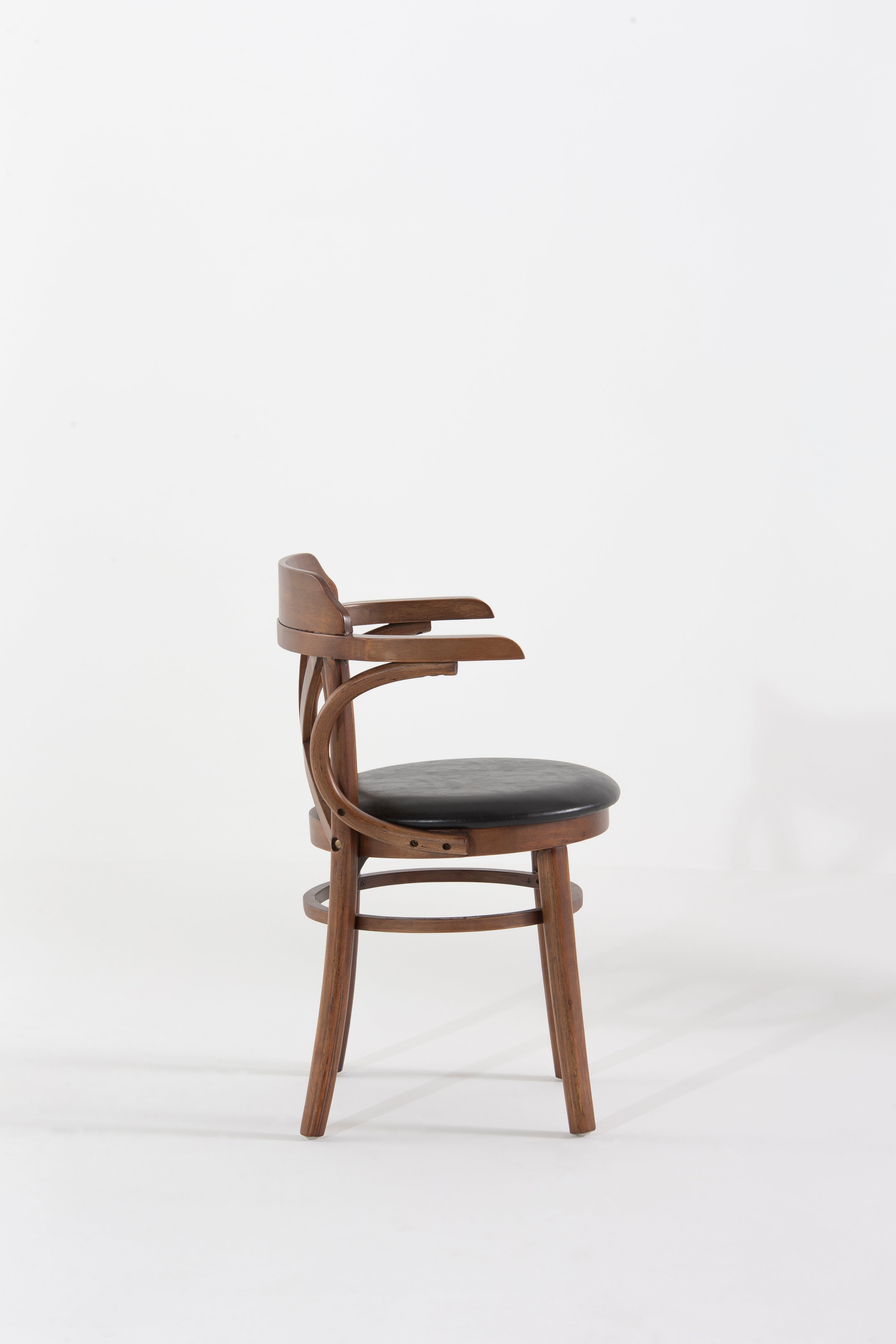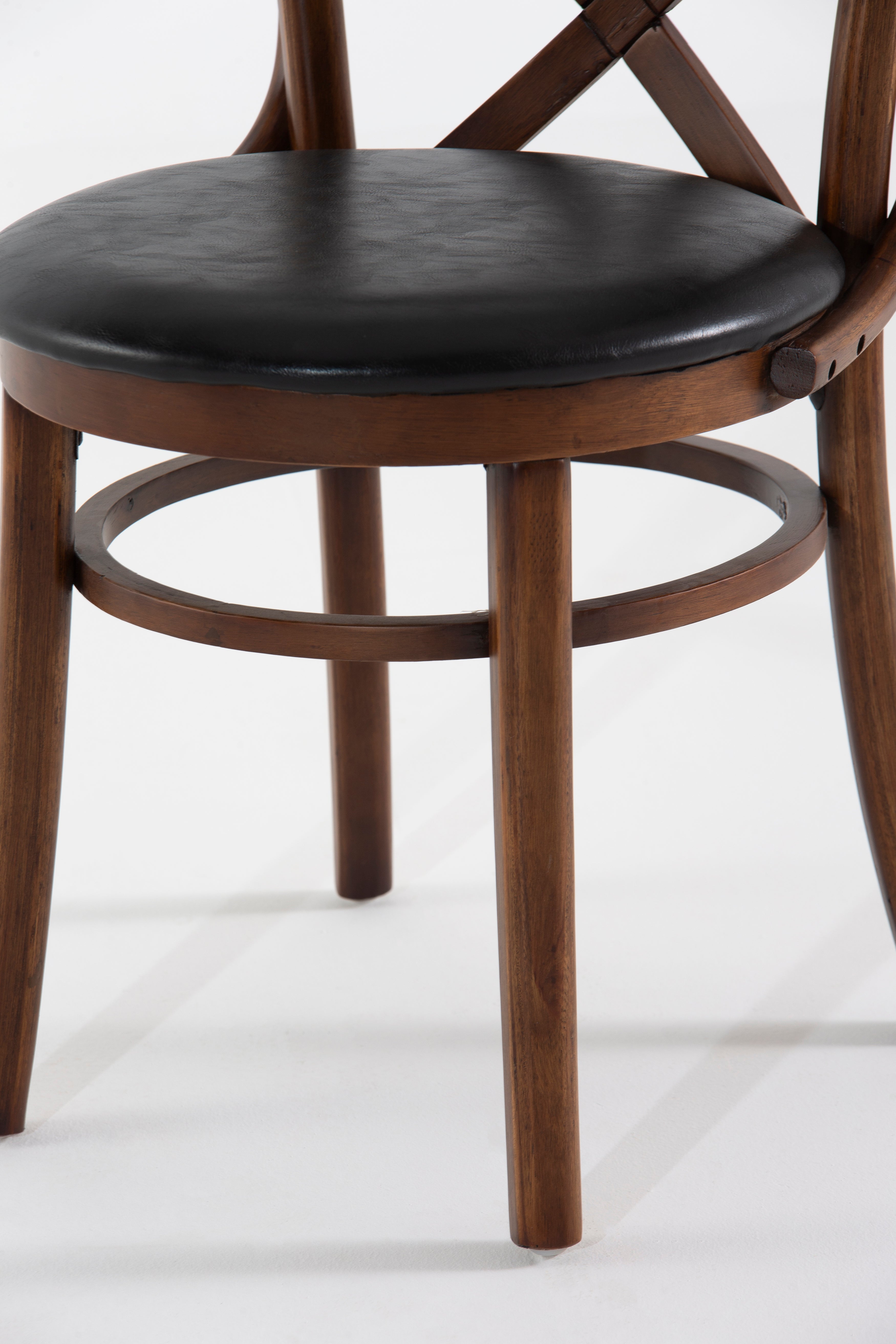 Crafted for timeless elegance, this wooden dining chair blends vintage charm with modern durability. Its rich brown frame, gracefully curved arms, and distinctive X-back design exude sophistication, while the black leather seat ensures lasting comfort. The sturdy bentwood structure adds a refined touch, making it a perfect choice for classic and contemporary interiors alike. Whether in a dining space, café, or lounge, this chair delivers both style and functionality, enhancing your space with its exquisite craftsmanship.