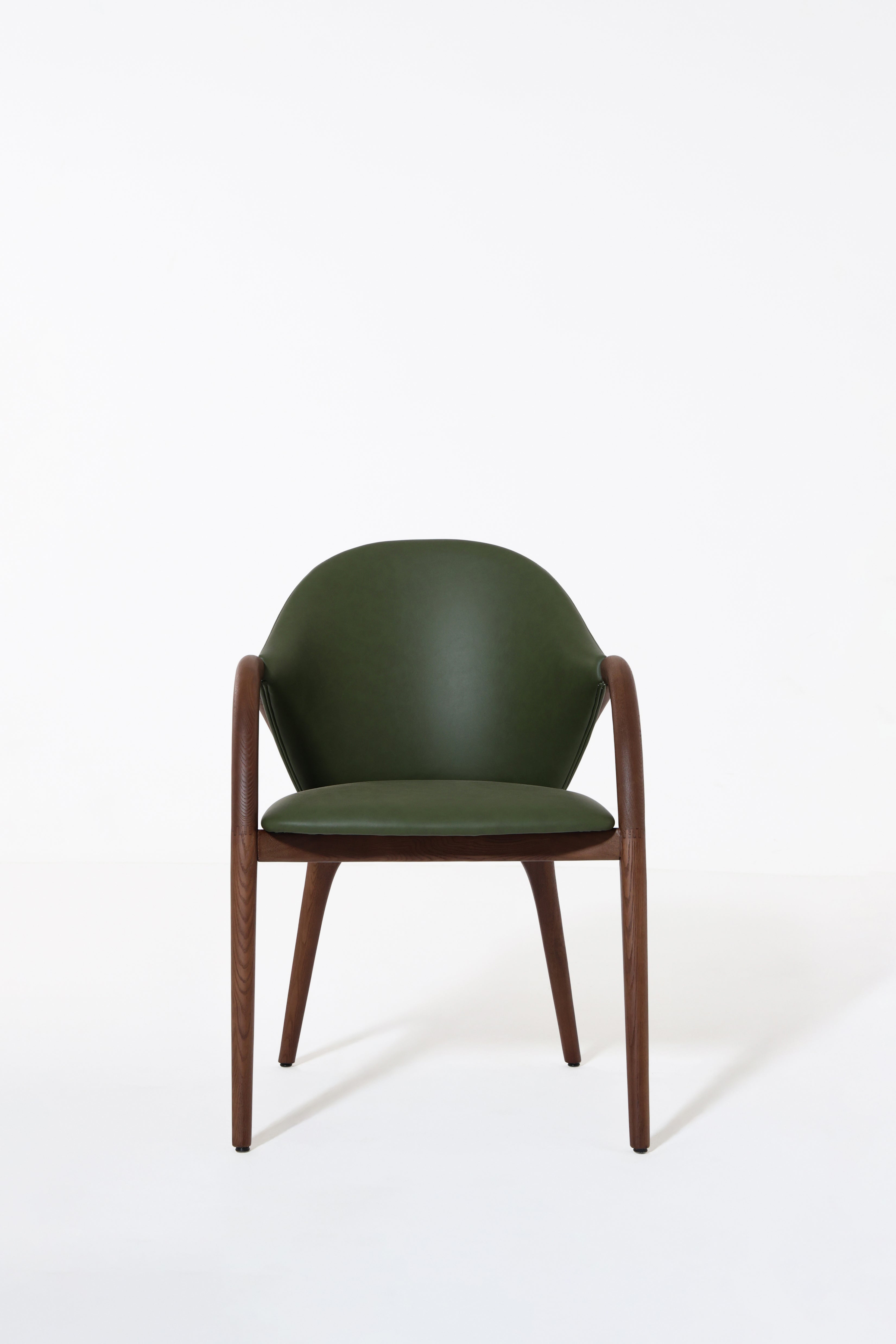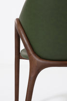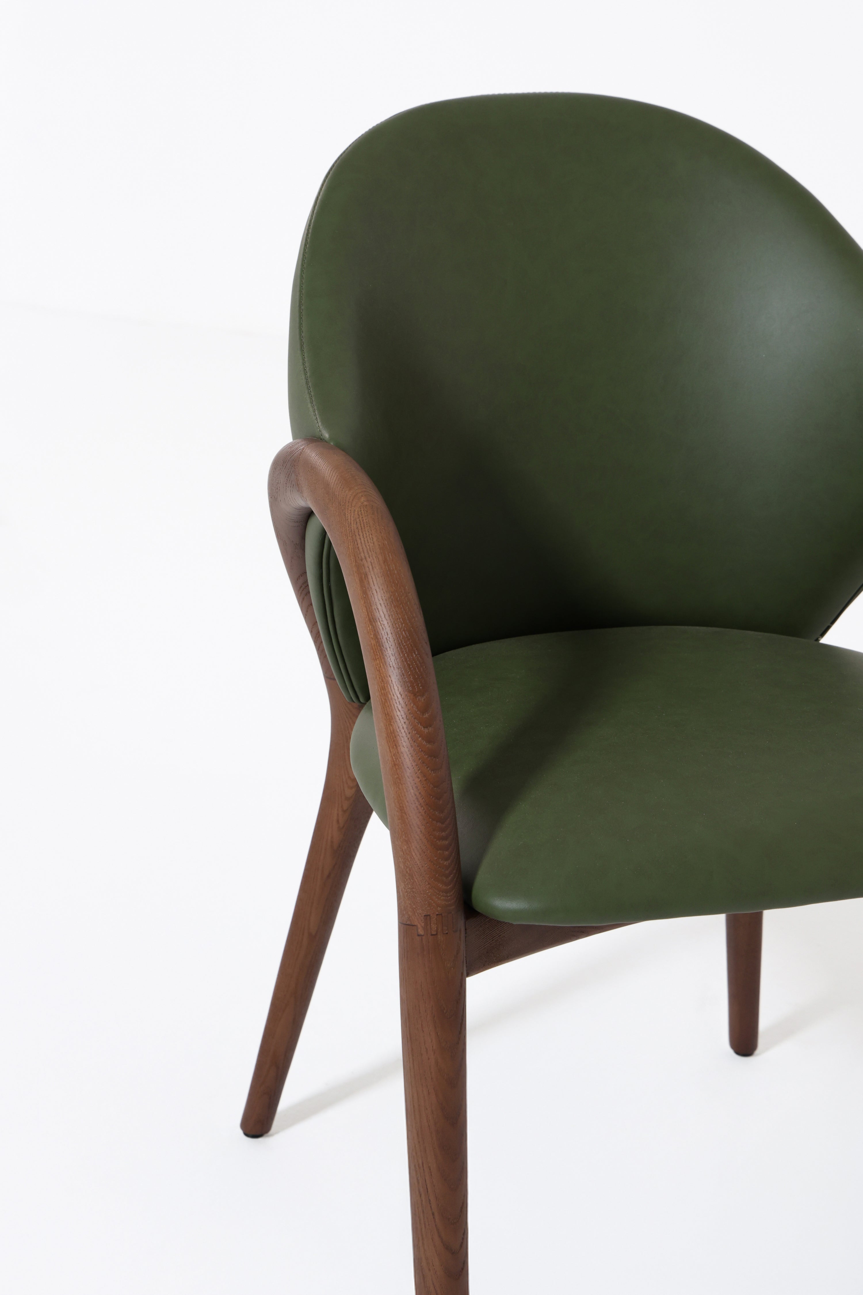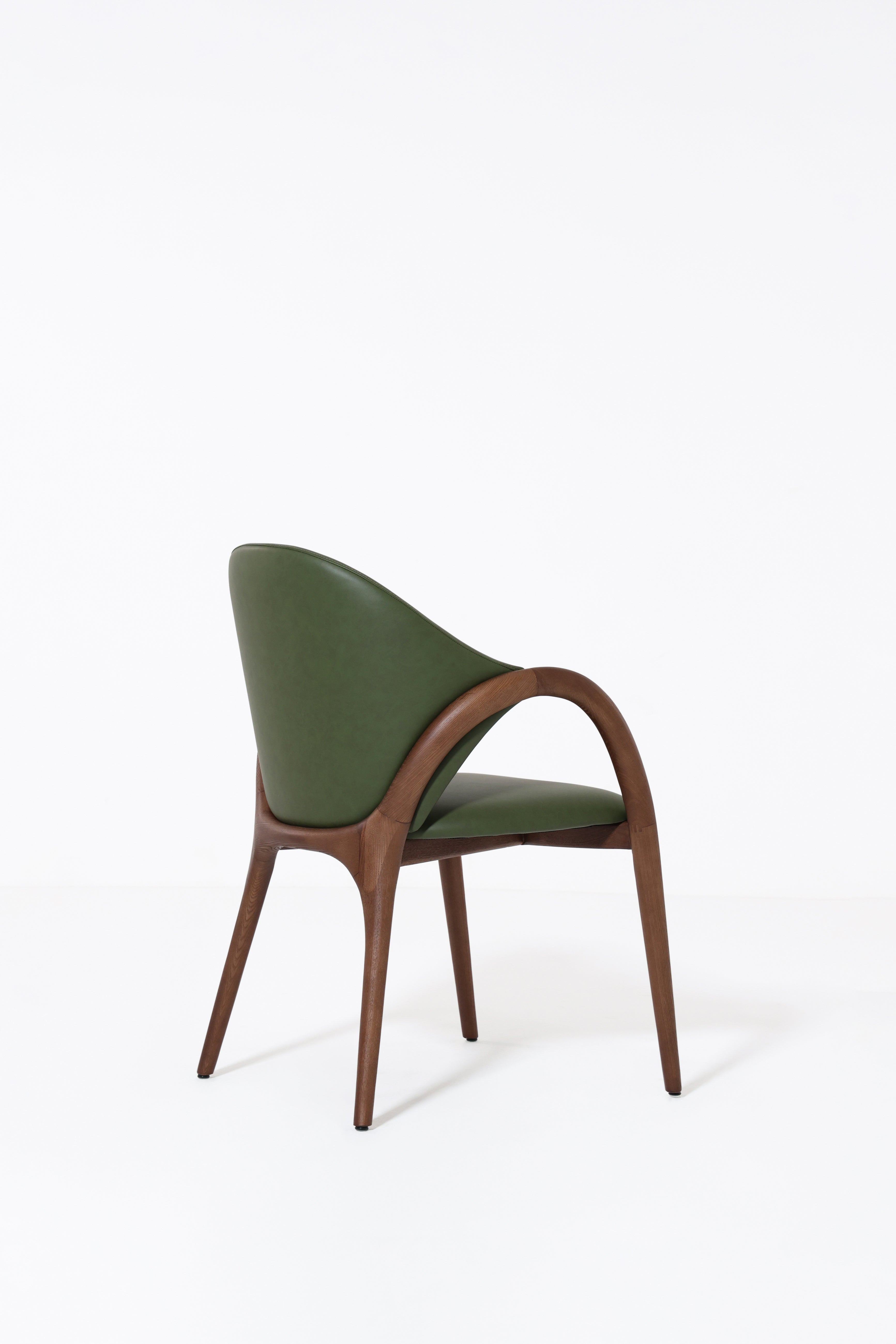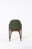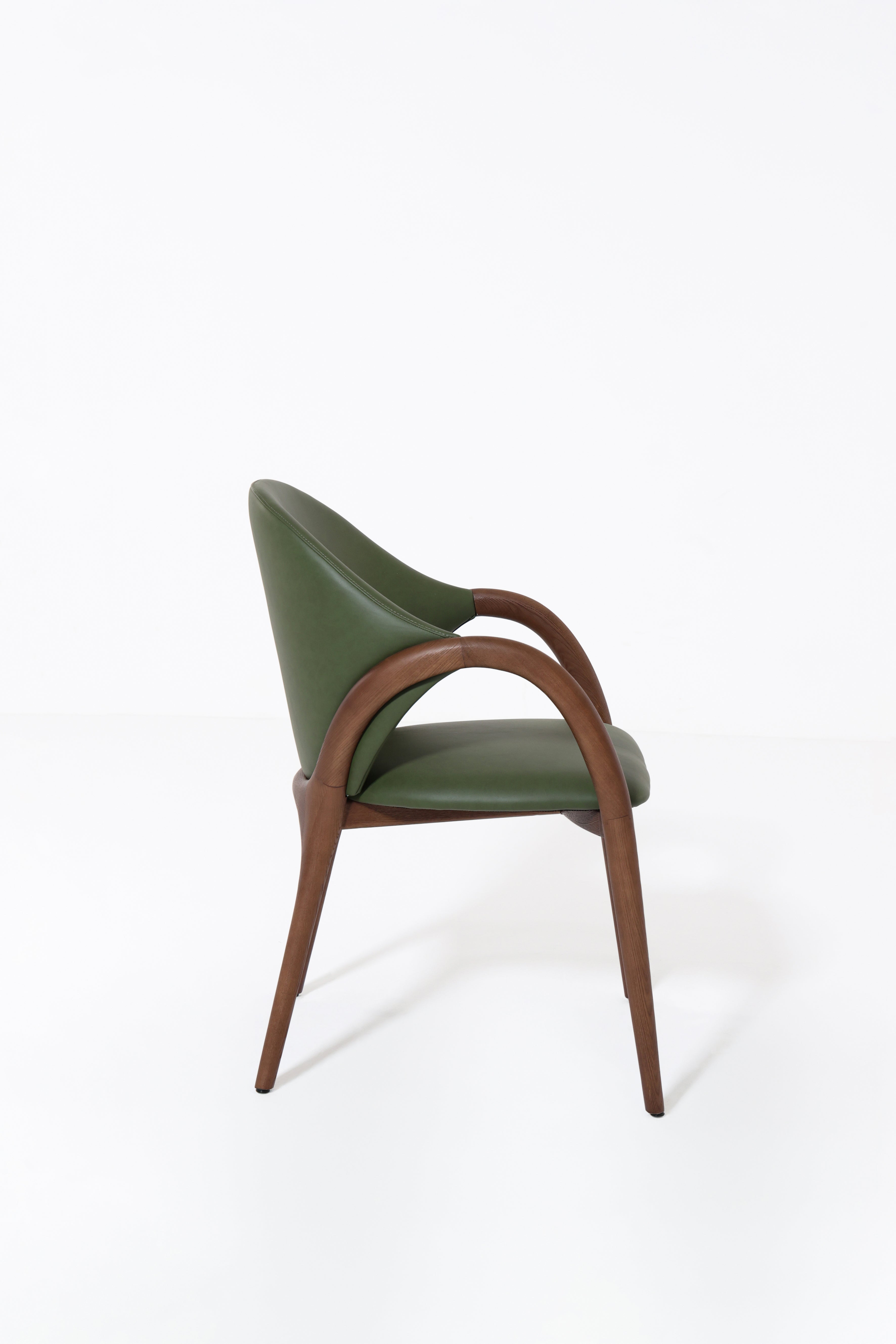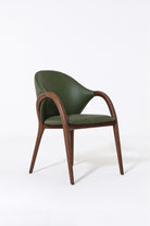 Transform your dining space with a chair that blends sculptural design and natural elegance. The smooth curved wooden arms and legs frame a rich green upholstered seat and back, creating a bold contrast that feels both modern and timeless. Its organic silhouette provides comfort and support, while the unique color adds a touch of sophistication and personality. Perfect for contemporary, mid-century, or eclectic interiors, this chair turns everyday dining into a refined experience.