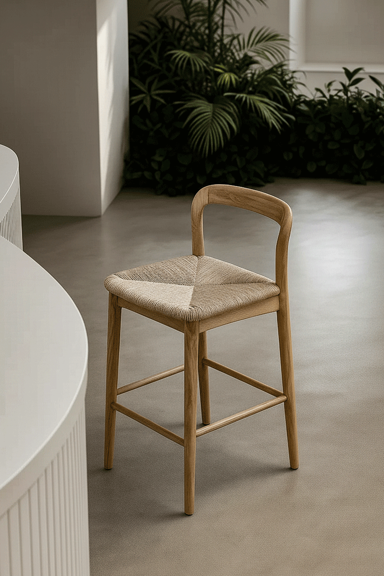 Crafted with a warm teak wood frame and topped with a rattan seat, this stool blends organic texture with soft, modern contours. Its gently curved backrest and clean-lined silhouette offer both comfort and minimalist style, making it a versatile addition to kitchens, dining areas, or casual bar seating. The woven seat adds artisanal detail and supportive comfort, while the sturdy wooden construction ensures lasting durability. Designed with a Scandinavian-inspired aesthetic, this piece enhances any space with a refined balance of natural warmth and contemporary simplicity.