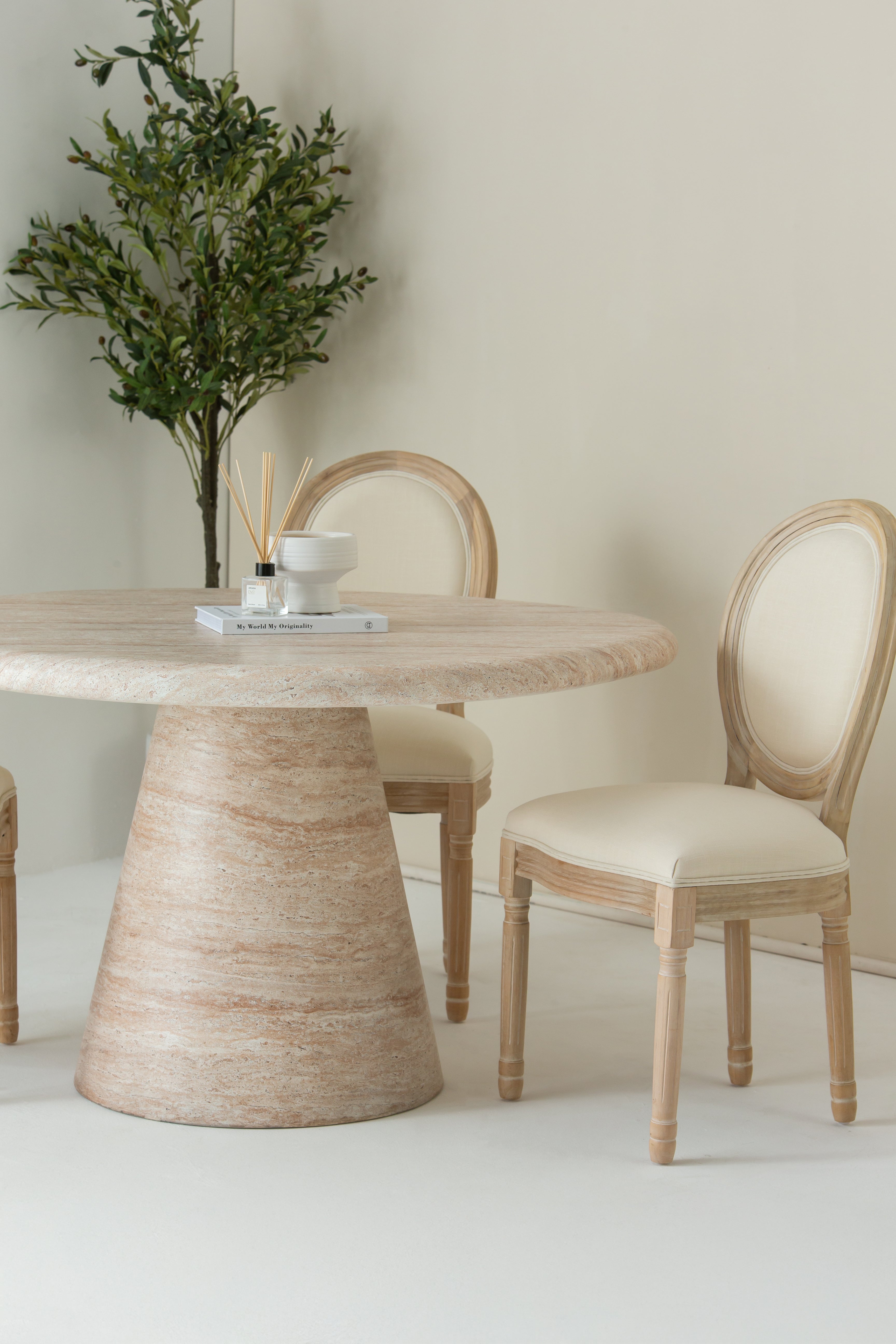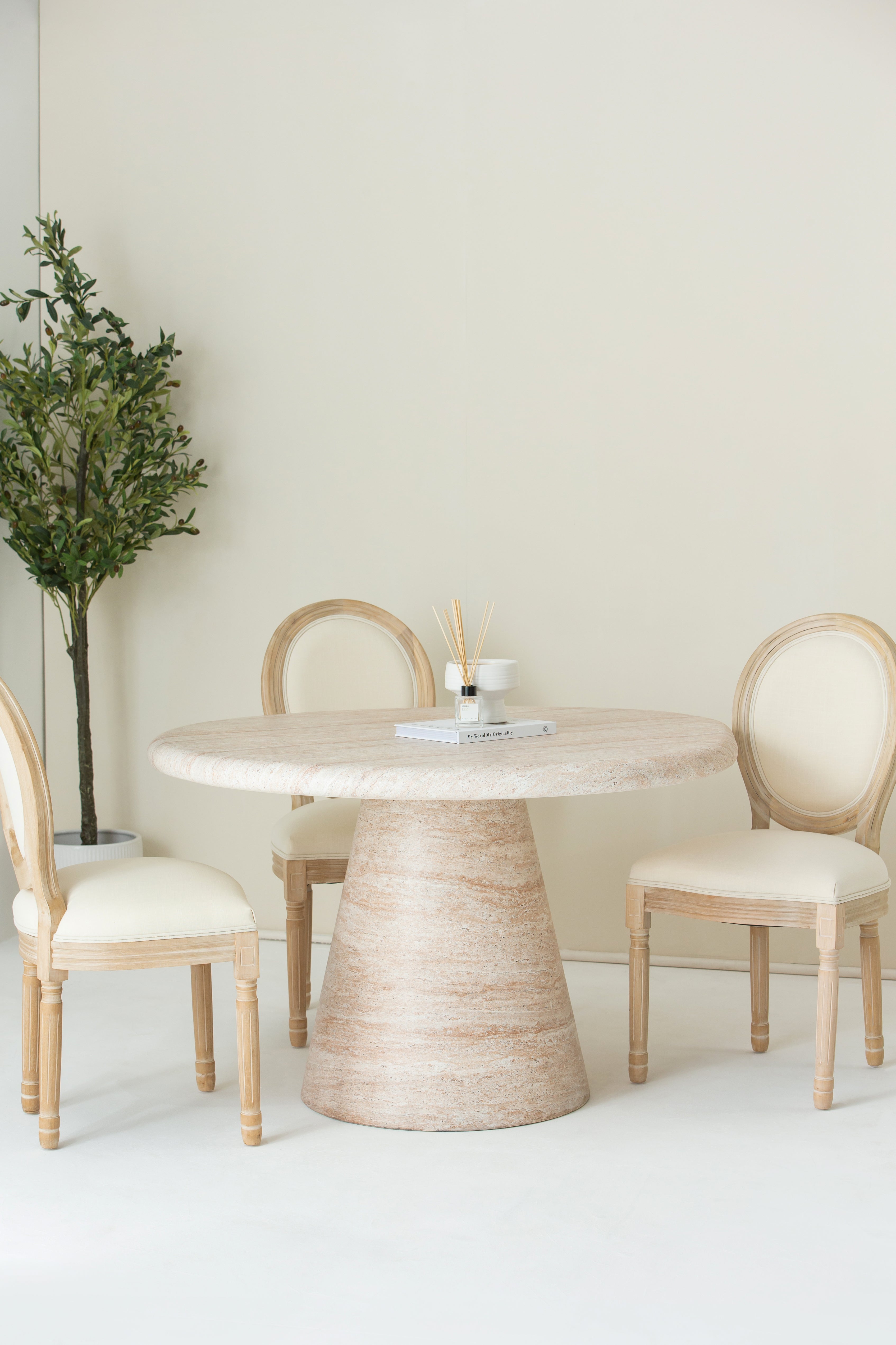 2. Contrast Accents: Enhance the elegance by introducing contrasting elements like dark-toned table settings or bold accessories, creating a striking visual impact against the off-white seating.