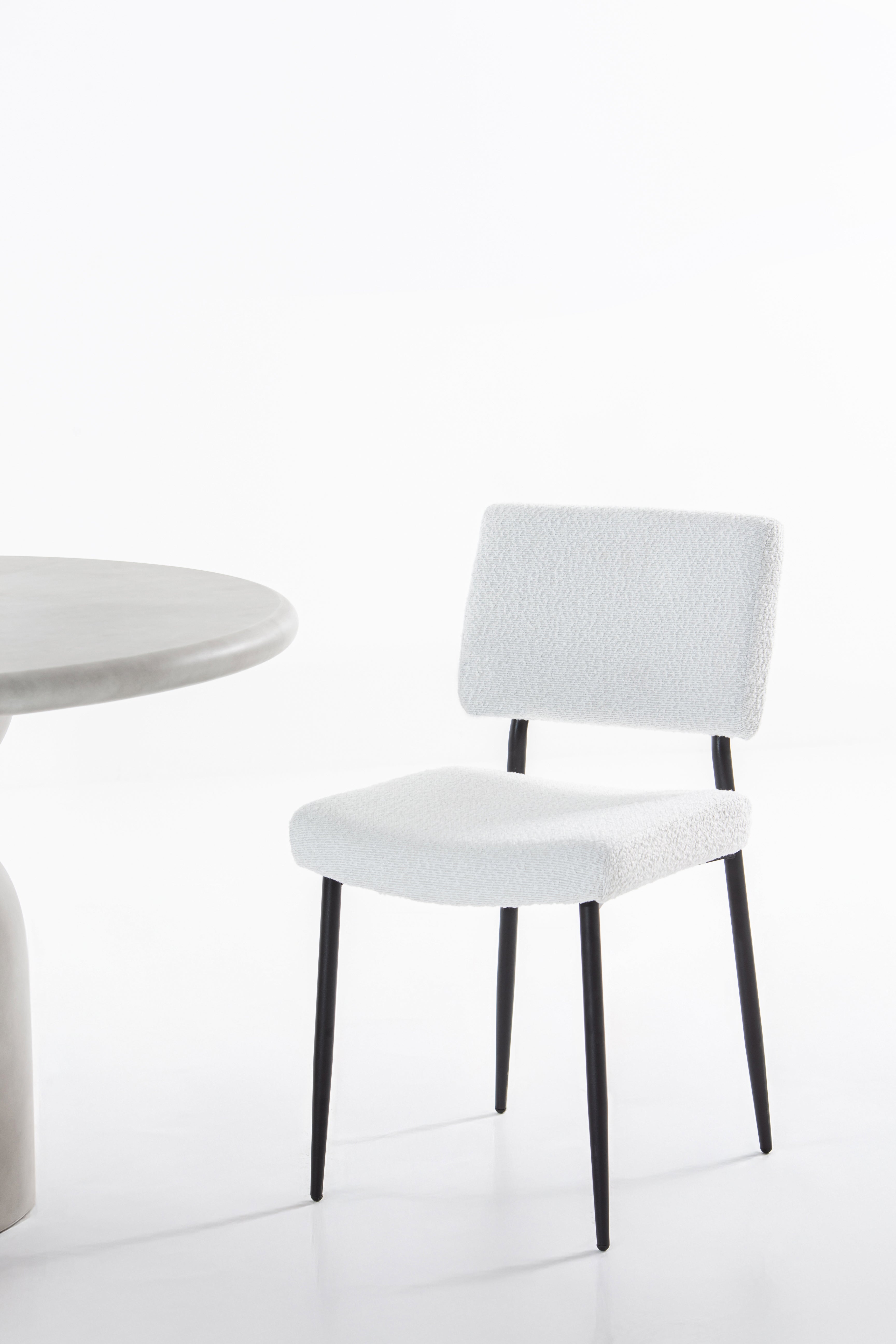 A refined balance of comfort and style, this dining chair enhances your space with its textured fabric seat and powder-coated metal legs. The soft, neutral upholstery adds warmth, while the sleek black frame provides contrast for a modern touch. A gently curved backrest and plush cushioning ensure lasting comfort, making every meal feel inviting. Whether styled in a contemporary dining setup or as an accent chair, its minimalist form effortlessly complements various interiors.