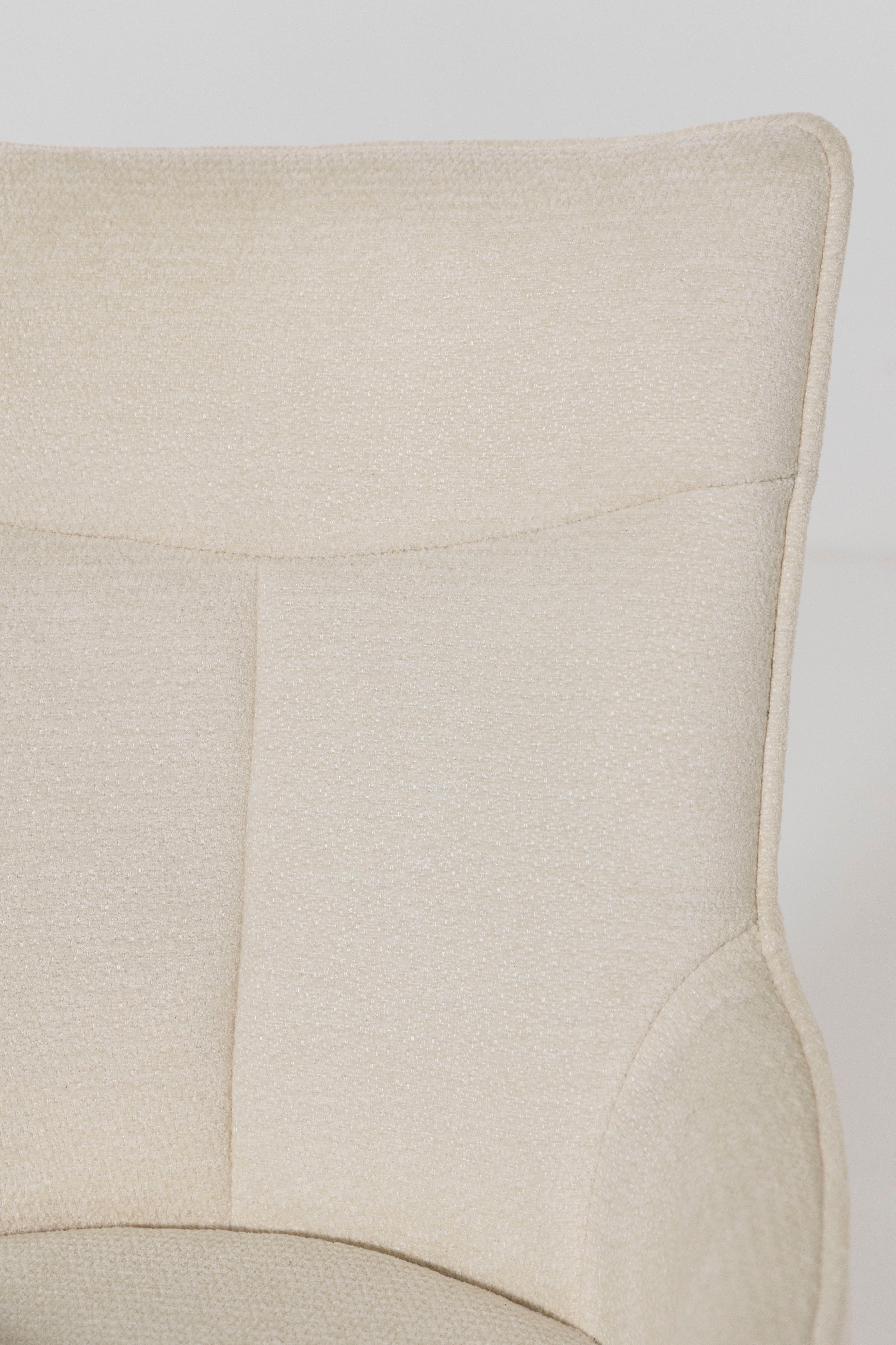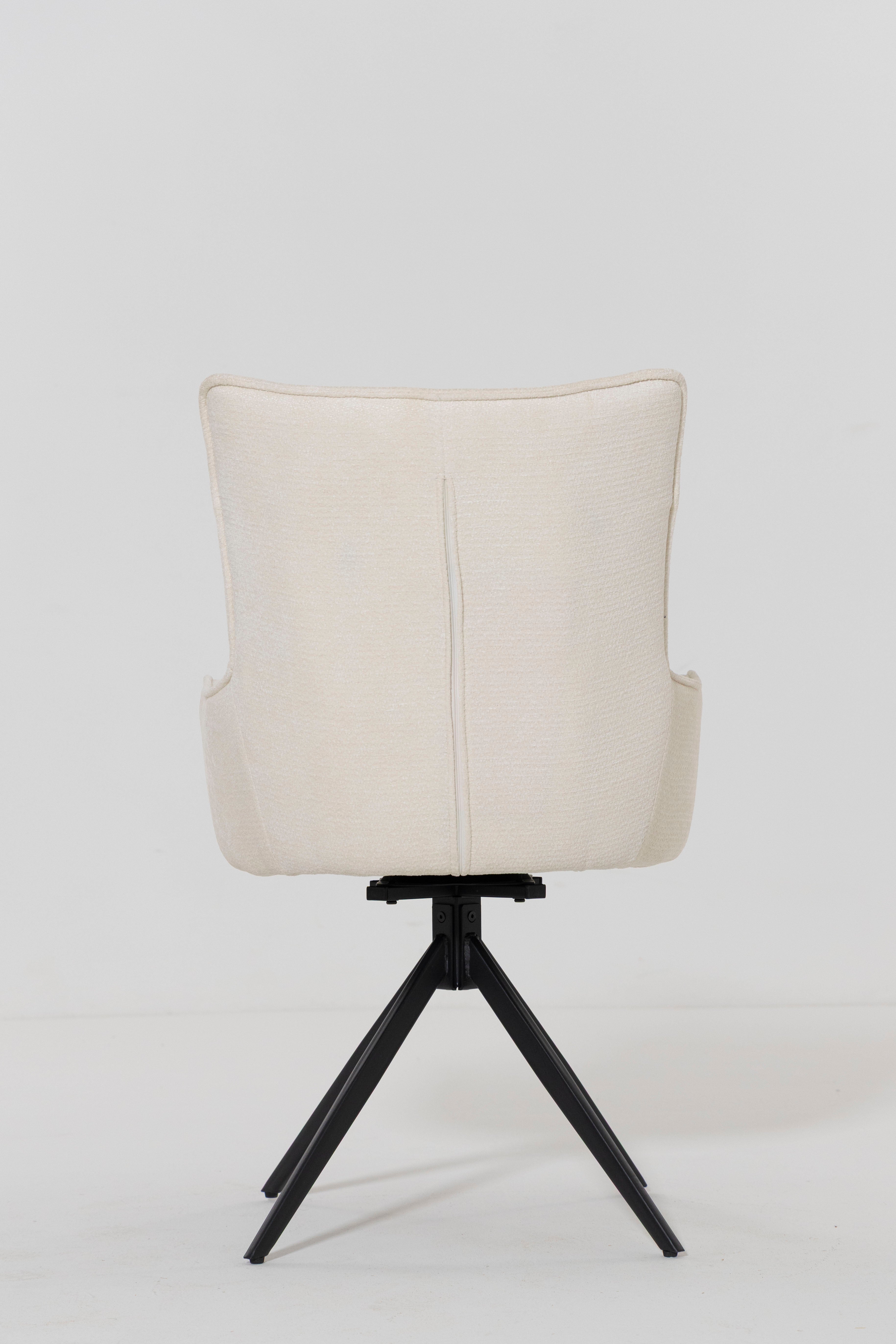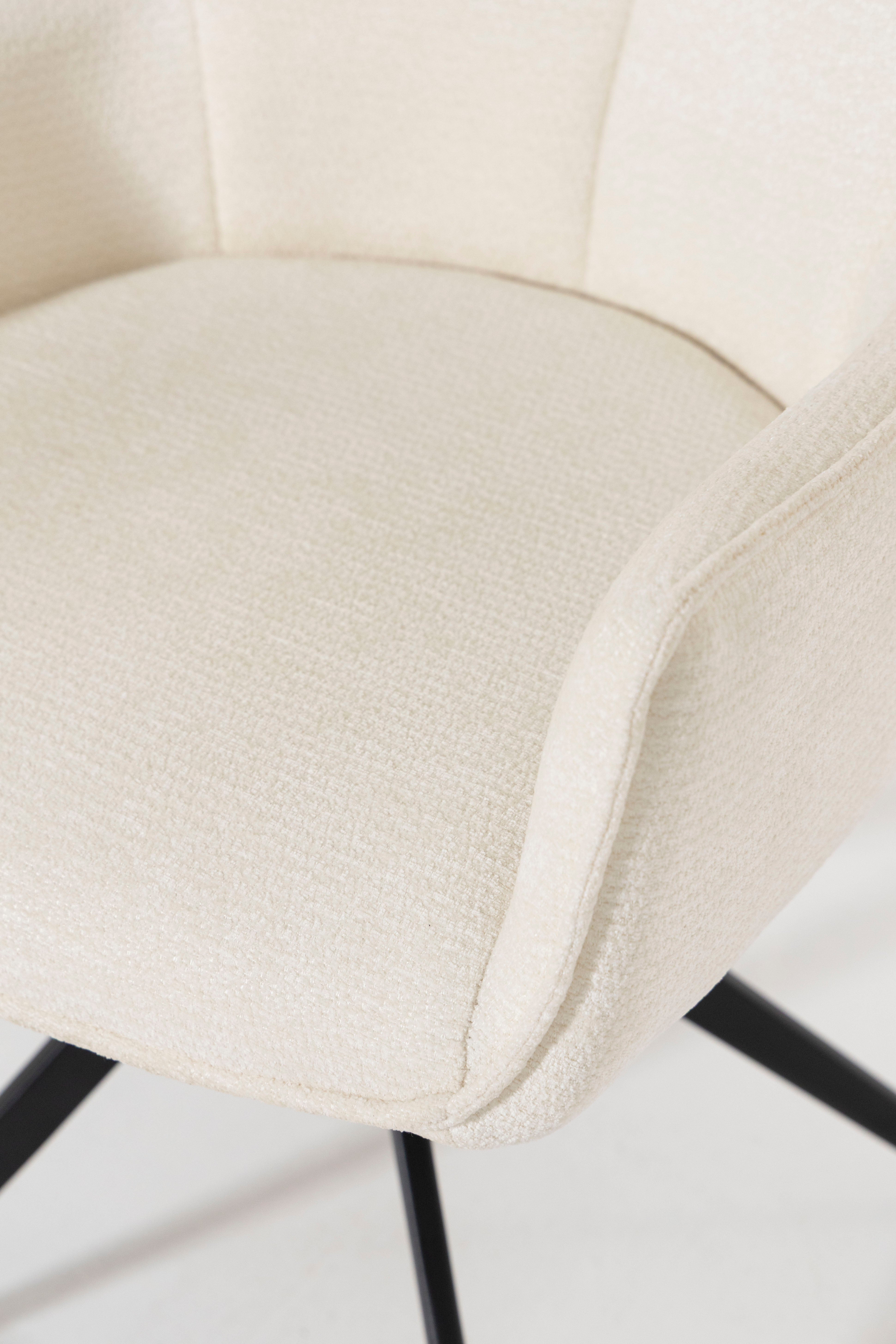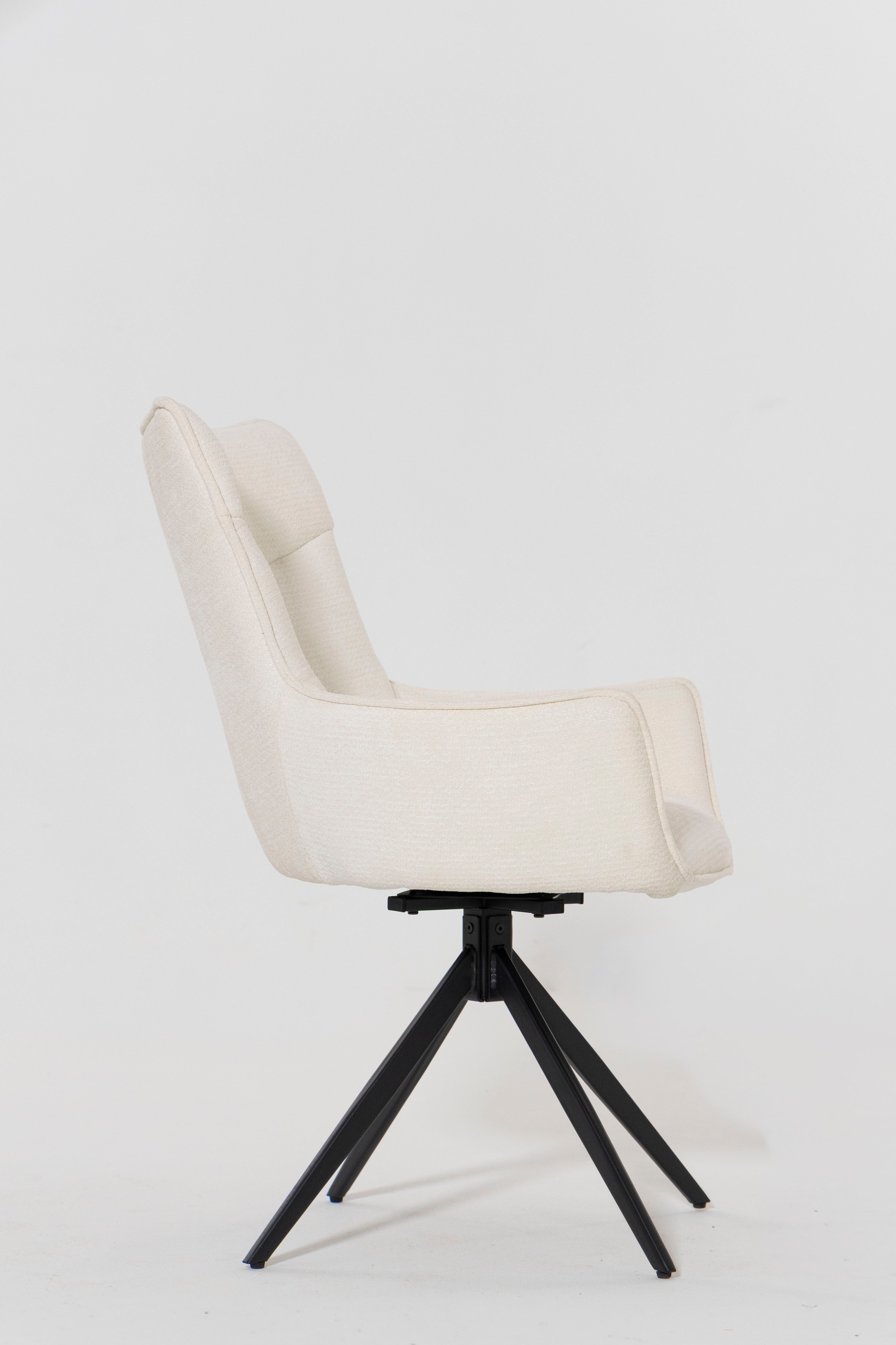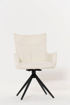 Create an airy, elevated dining moment with this sculpted swivel chair in off white bouclé, designed to bring softness and modern refinement to your space. The gently contoured back and supportive arms invite lingering comfort, while the clean, cloud like texture brightens the room and pairs beautifully with warm wood, stone, and minimalist styling. Finished with a sleek black swivel base for subtle contrast, it delivers an effortless European inspired look that feels polished for everyday dining and hosting.