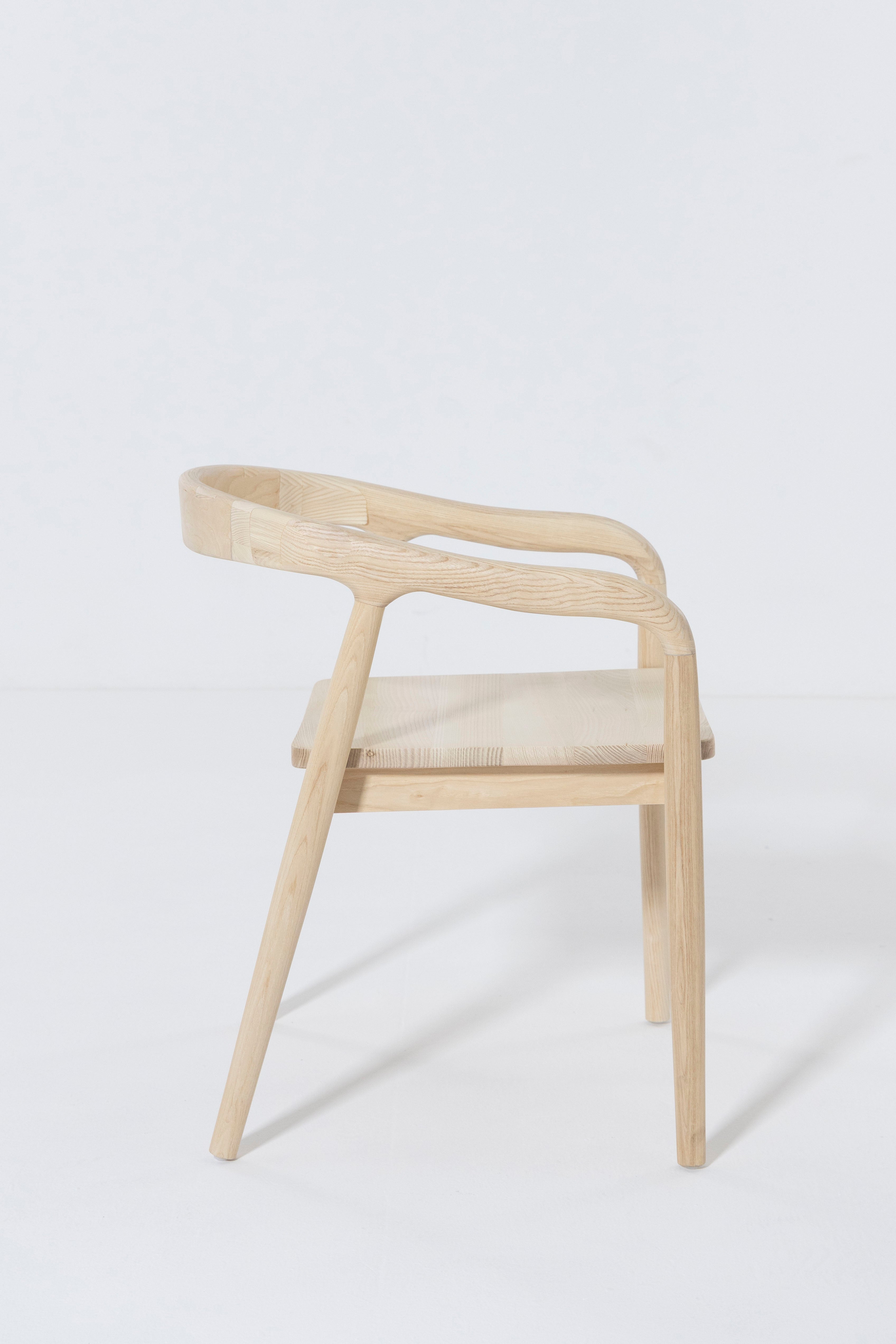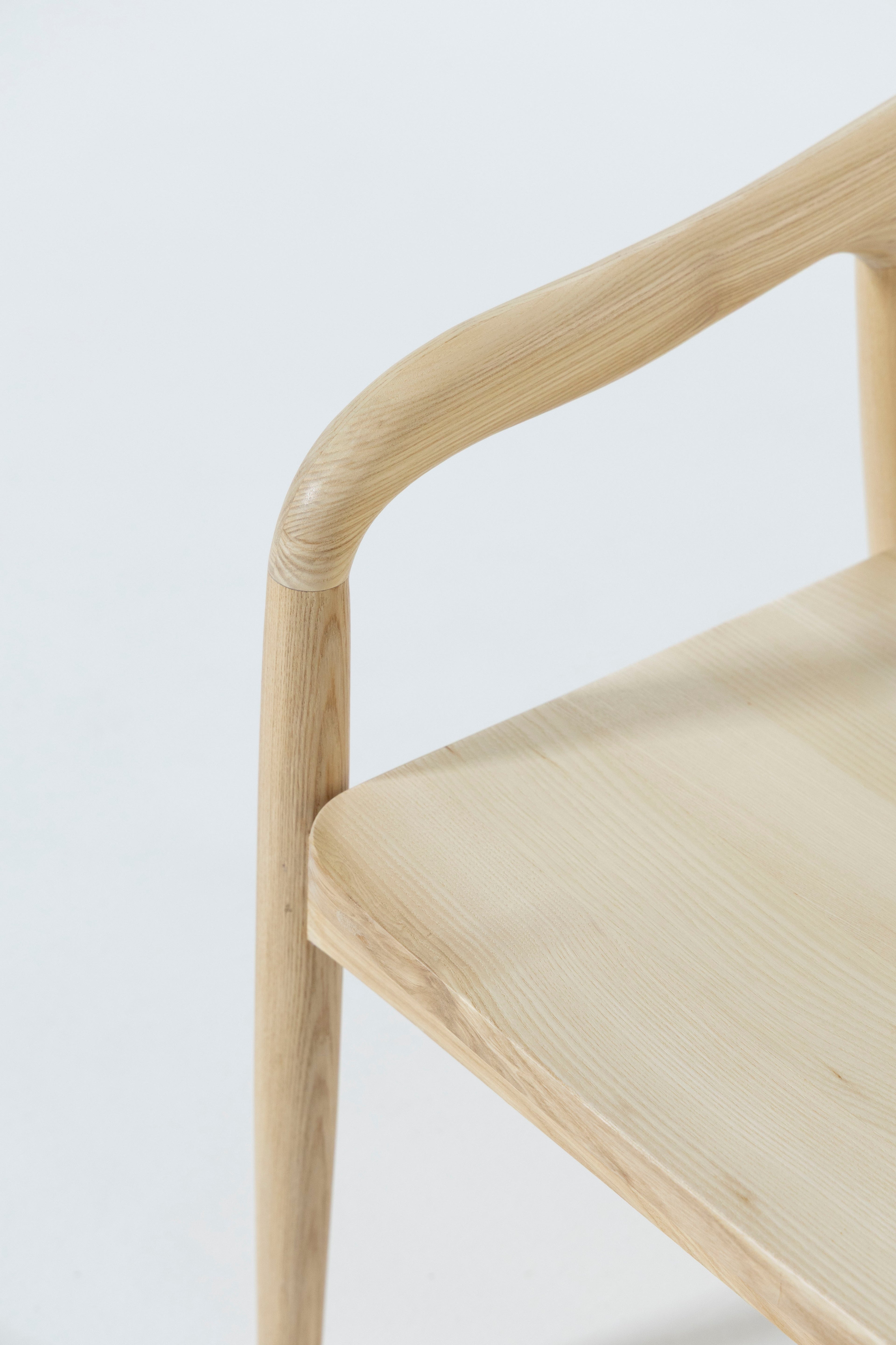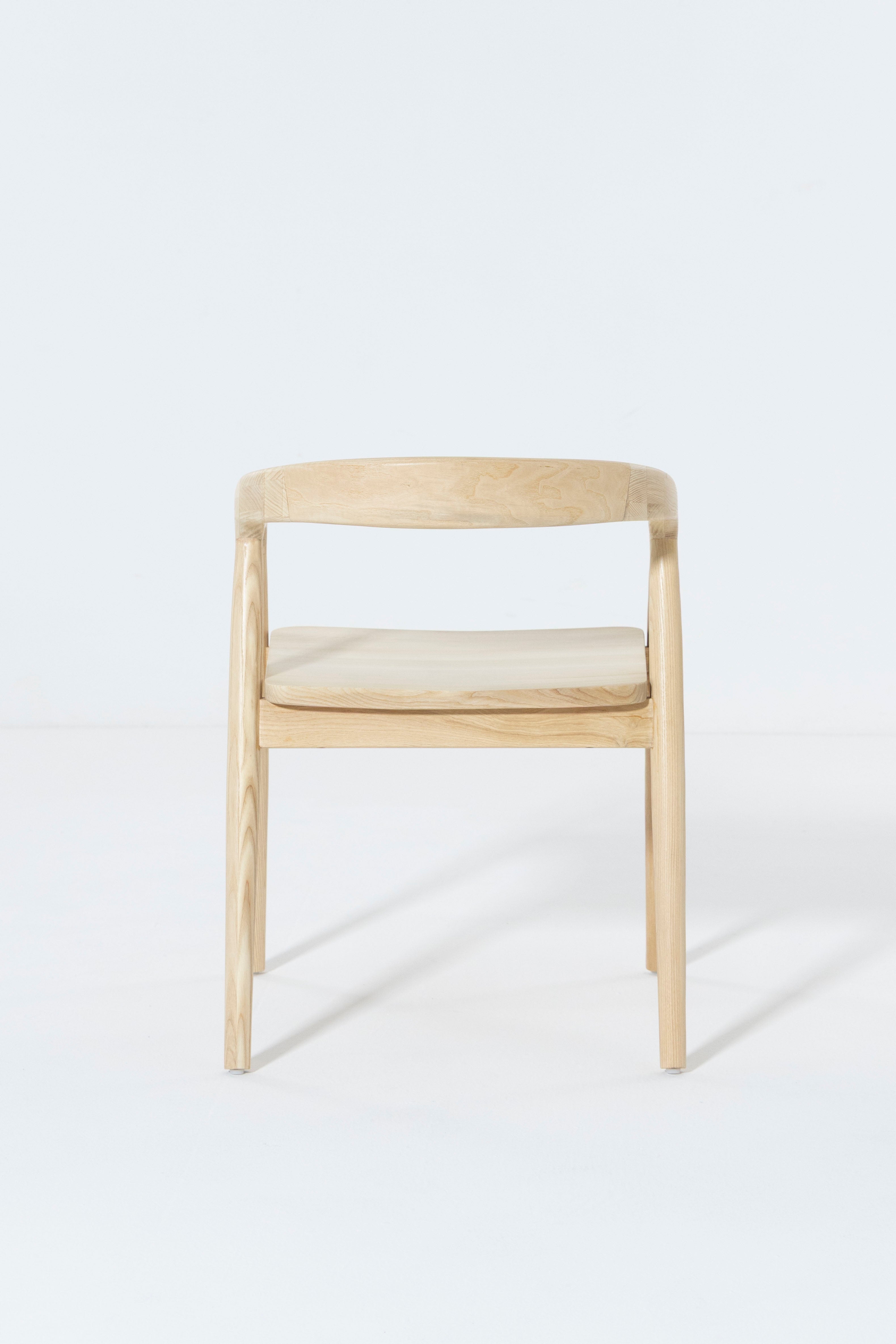 Crafted in a smooth natural wood finish, this dining chair features a beautifully curved backrest and arm frame that flows seamlessly into its slender legs, creating a clean sculptural silhouette inspired by minimalist Japanese design. The gently contoured wooden seat offers comfortable support, while the light organic tone highlights the natural grain and craftsmanship of the wood. With its airy profile and refined simplicity, it complements modern, Scandinavian, and Japandi interiors, bringing warmth, balance, and everyday functionality to any dining setting.