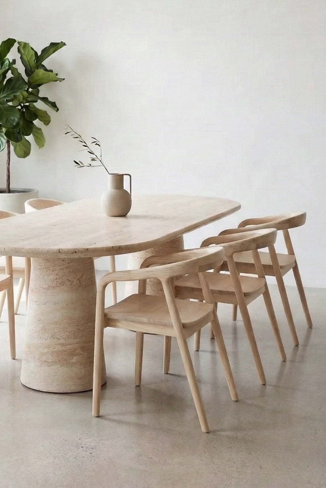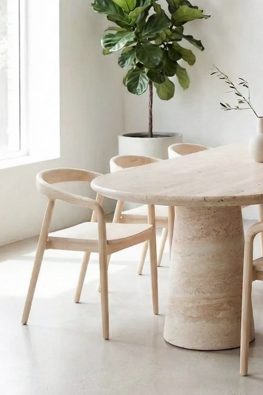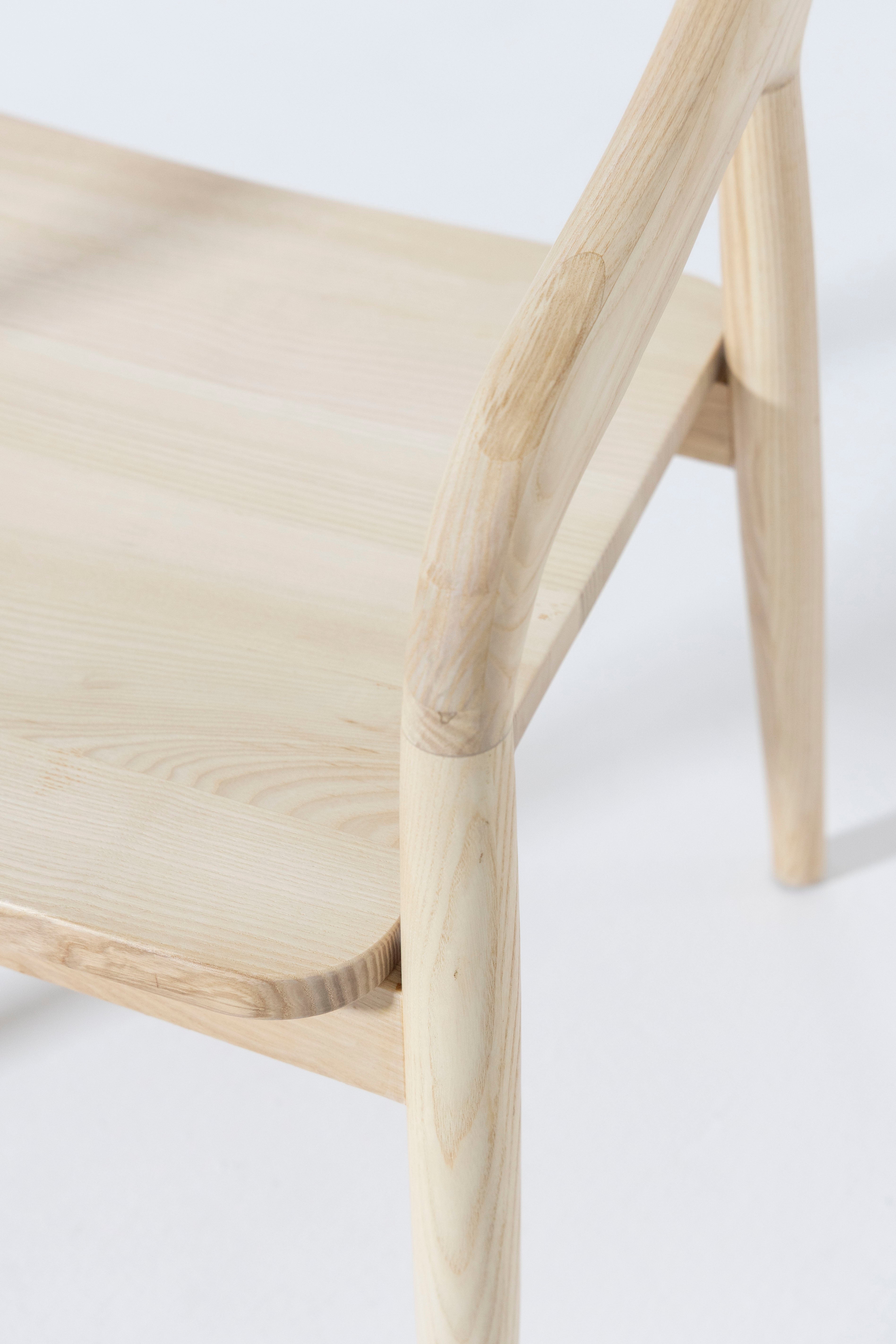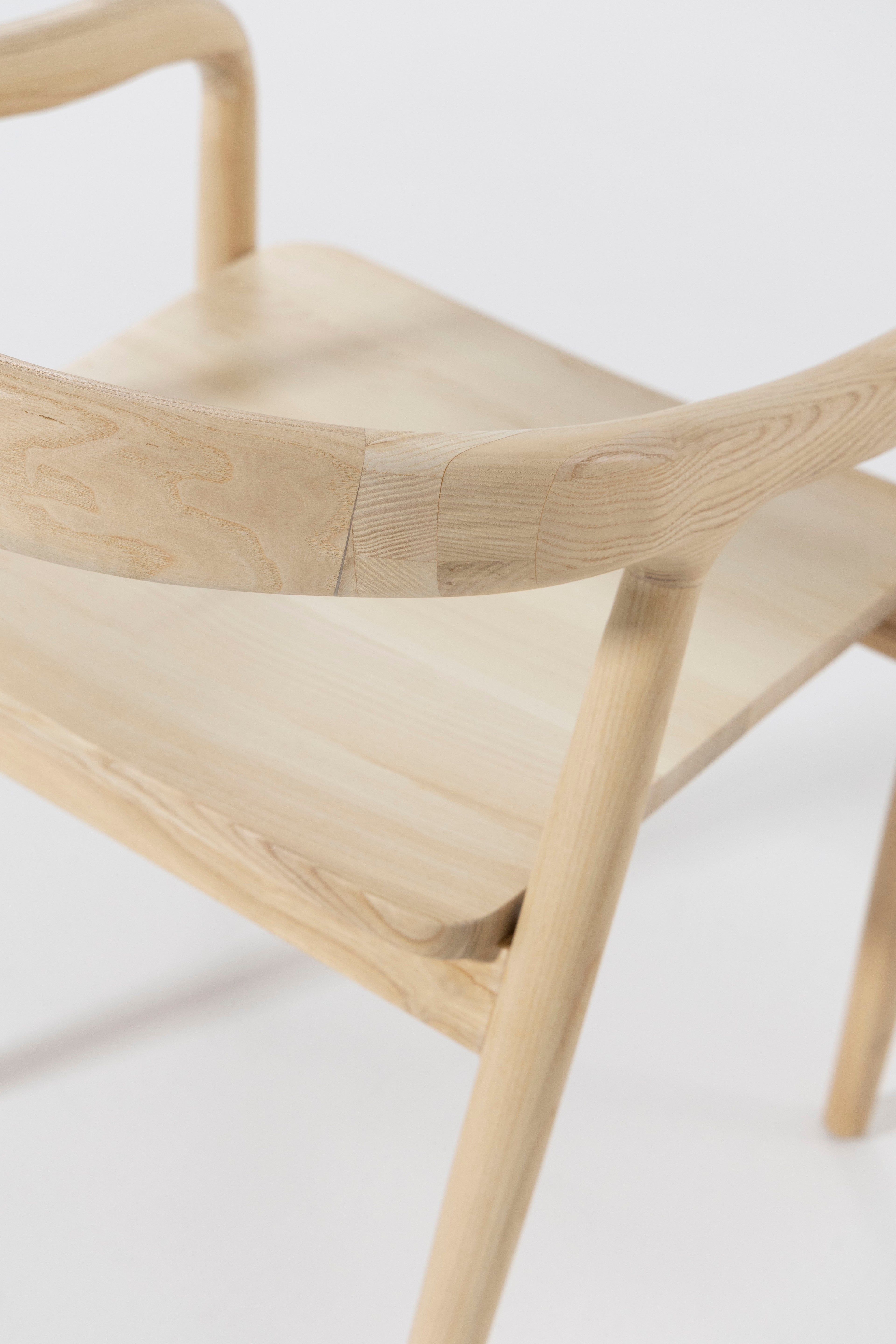 Crafted in a smooth natural wood finish, this dining chair features a beautifully curved backrest and arm frame that flows seamlessly into its slender legs, creating a clean sculptural silhouette inspired by minimalist Japanese design. The gently contoured wooden seat offers comfortable support, while the light organic tone highlights the natural grain and craftsmanship of the wood. With its airy profile and refined simplicity, it complements modern, Scandinavian, and Japandi interiors, bringing warmth, balance, and everyday functionality to any dining setting.