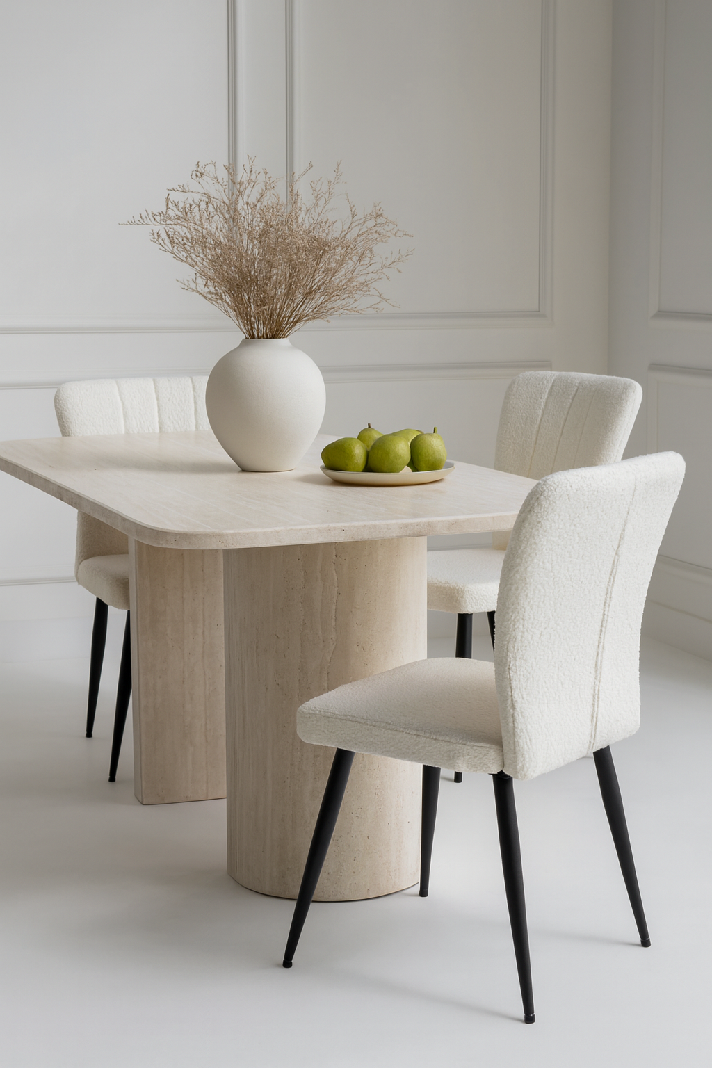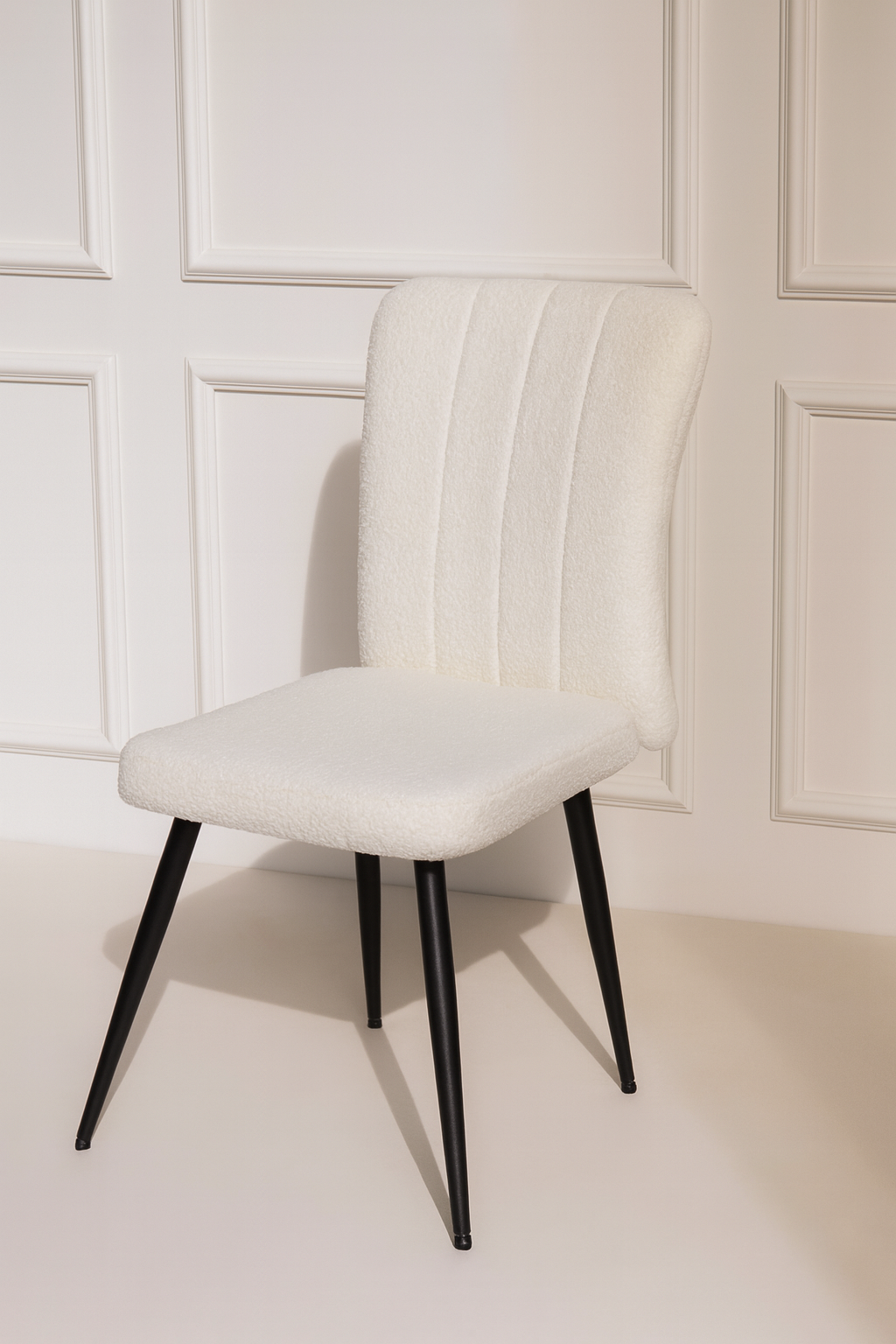Soft curves, a high-back silhouette, and luxurious boucle upholstery make this dining chair a refined addition to any space. The black powder coated tapered legs contrast elegantly with the plush white fabric, creating a modern yet timeless appeal. Perfect for contemporary interiors, it offers both style and comfort for long dinners and gatherings.