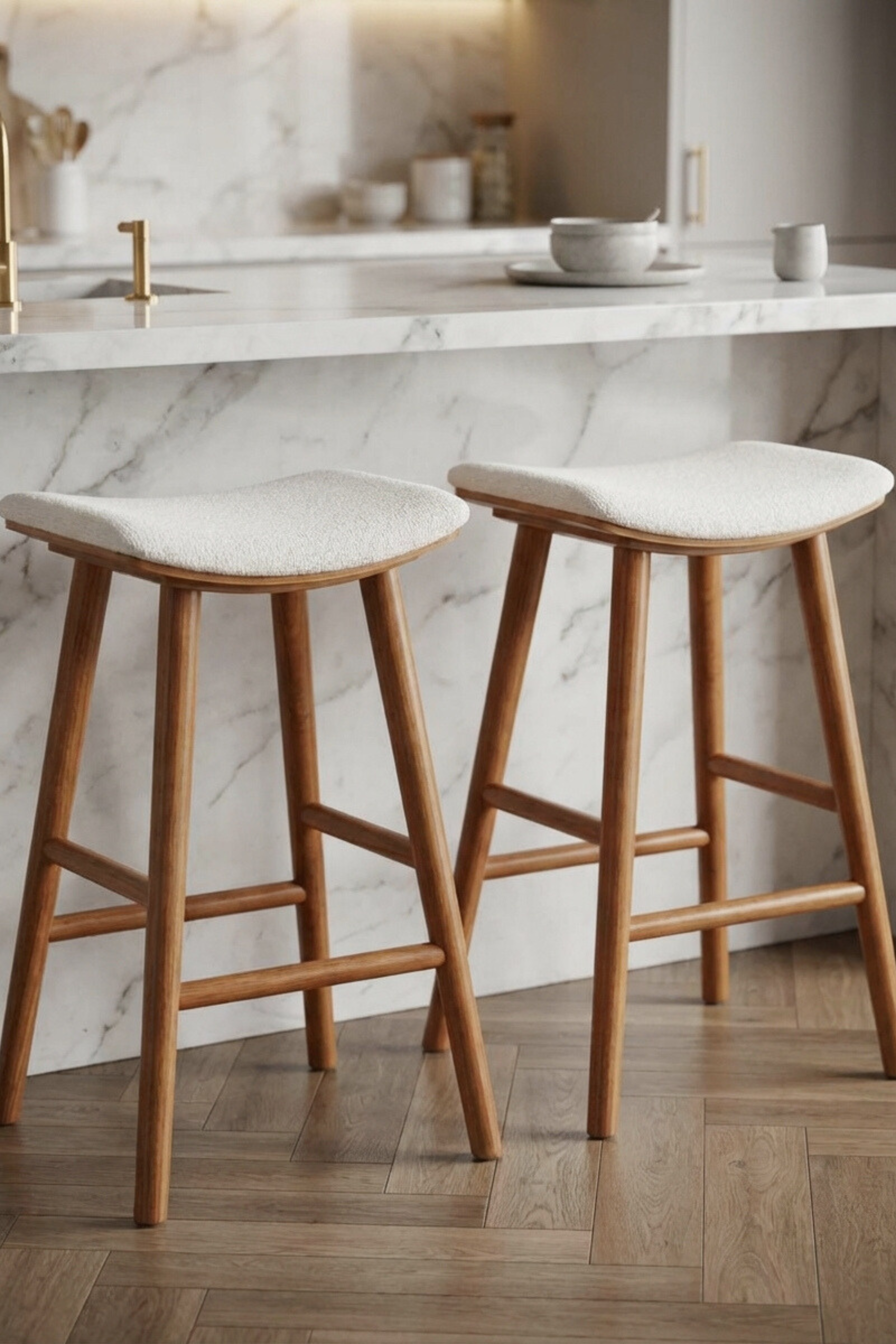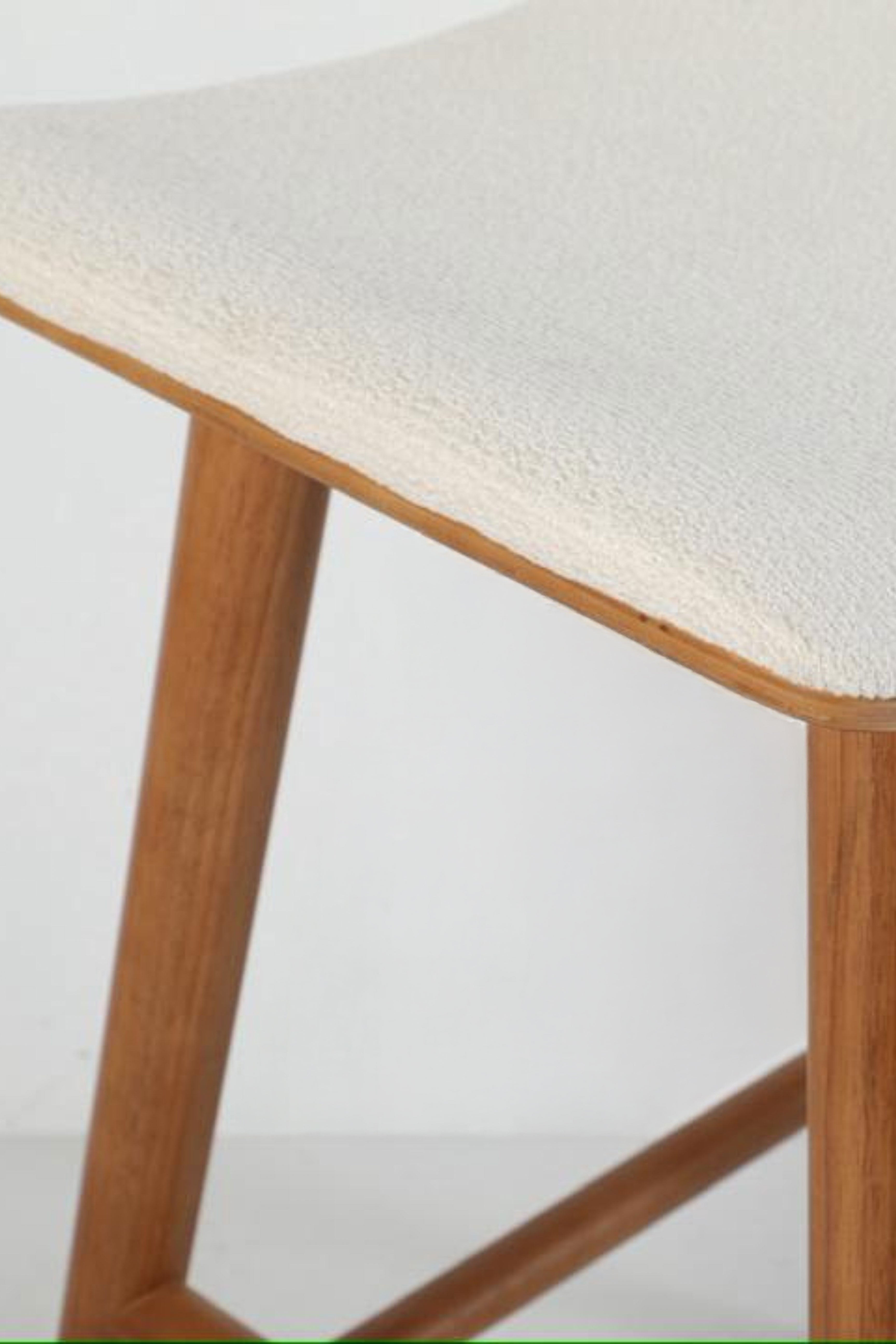 A clean, backless profile keeps sightlines open while the softly curved Sahara white fabric seat offers cushioned comfort for long breakfasts and late night chats. The natural rubber wood frame shows subtle grain and warm tone, with rounded legs and stretcher bars that steady every sit. Sized for kitchen islands and counters, it tucks in neatly when not in use and pairs easily with wood or stone tops.