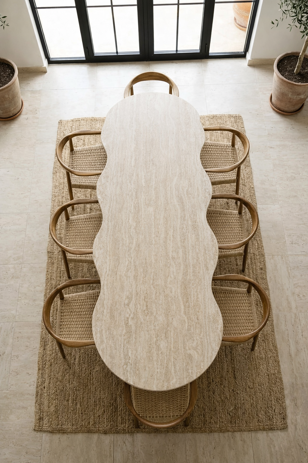 A refined statement of Mediterranean inspired elegance, this travertine dining table features an irregular sculptural top that brings organic movement and soft sophistication to your space. The natural stone surface showcases subtle tonal variations and timeless texture, creating a one of a kind centerpiece that feels curated and elevated. Supported by a bold cylindrical pedestal base, it balances artistic form with everyday stability, making it perfect for hosting, dining, and styling with warm woods, woven accents, or minimalist tableware. Designed to feel both modern and enduring, it transforms your dining area into a serene space defined by natural luxury.