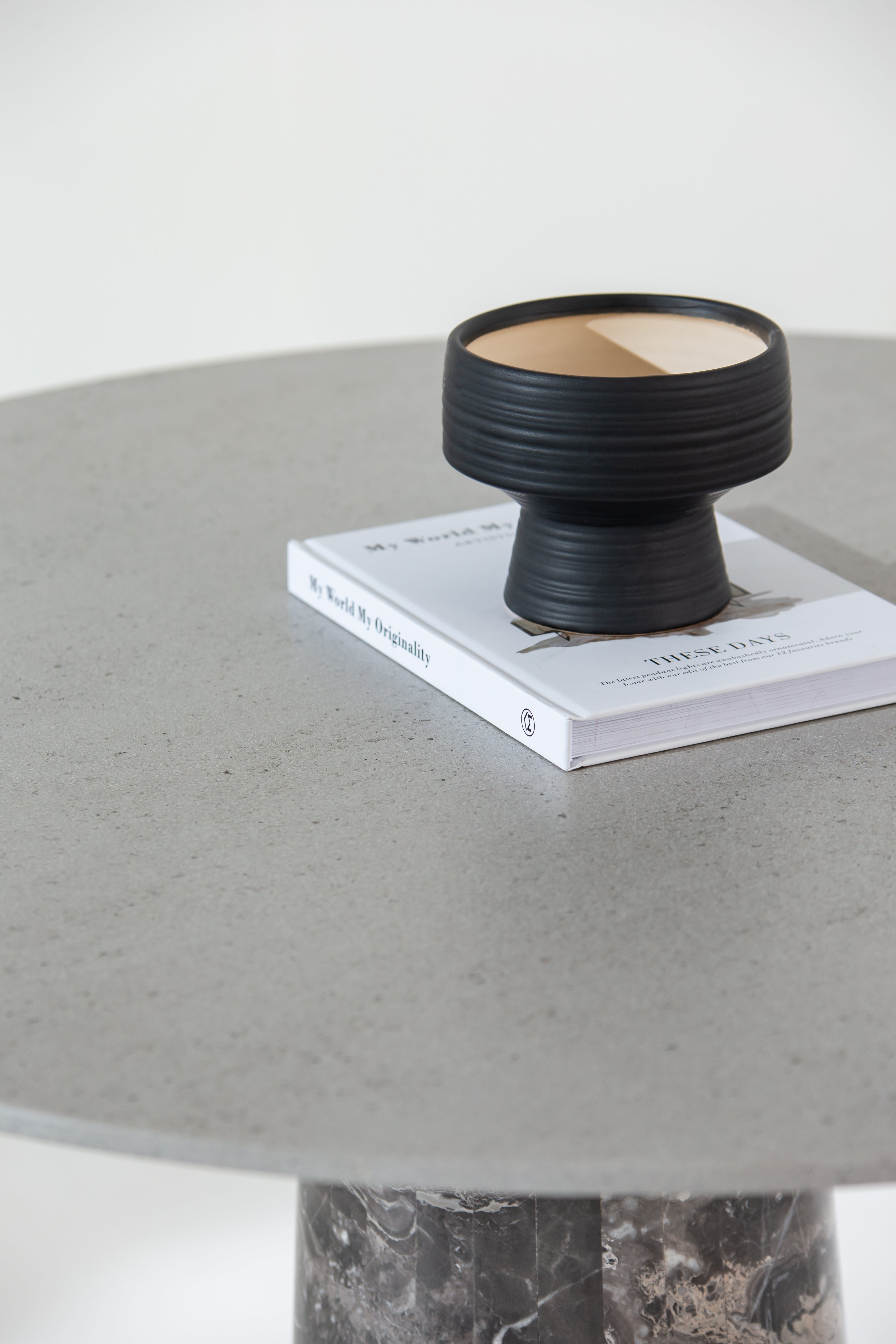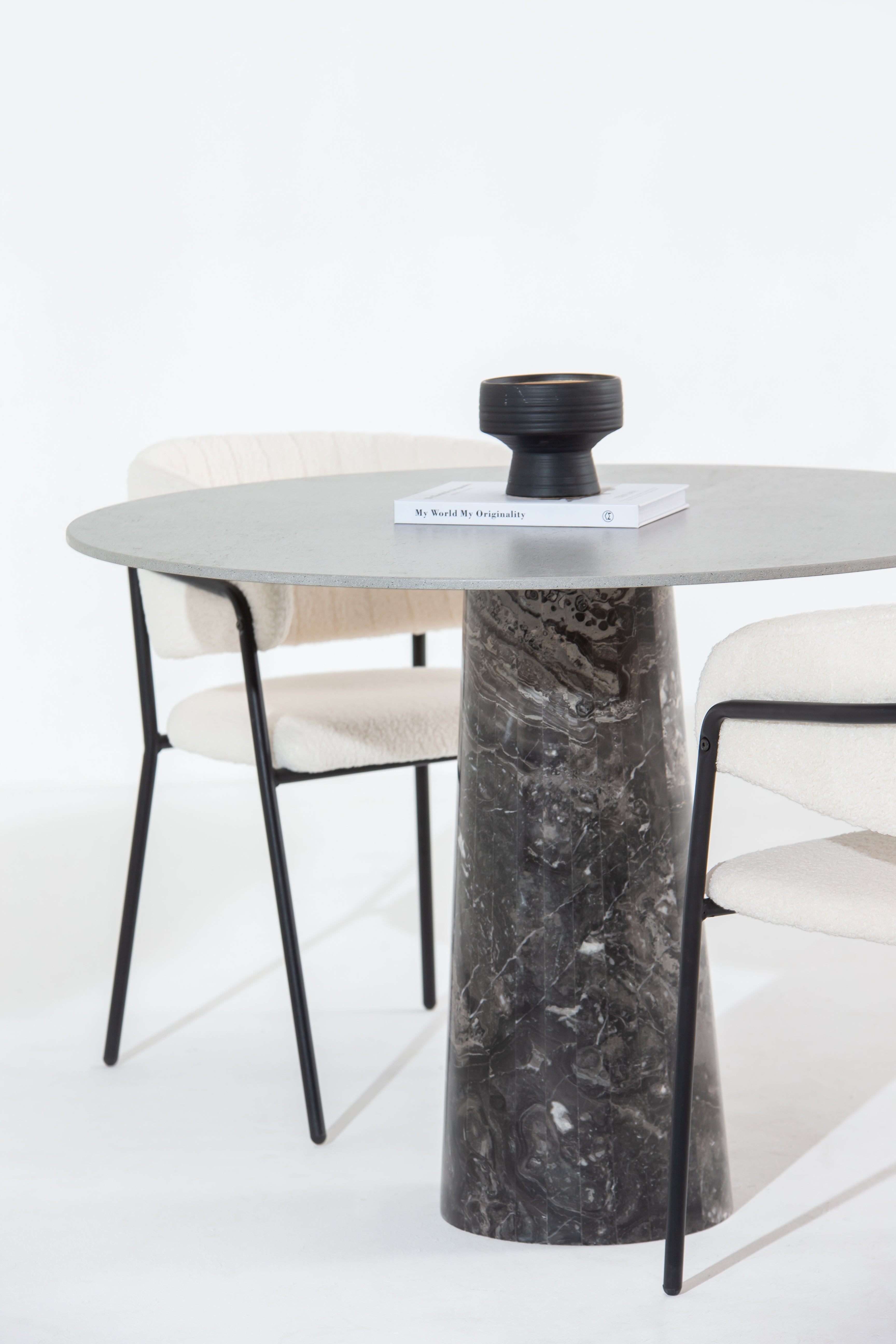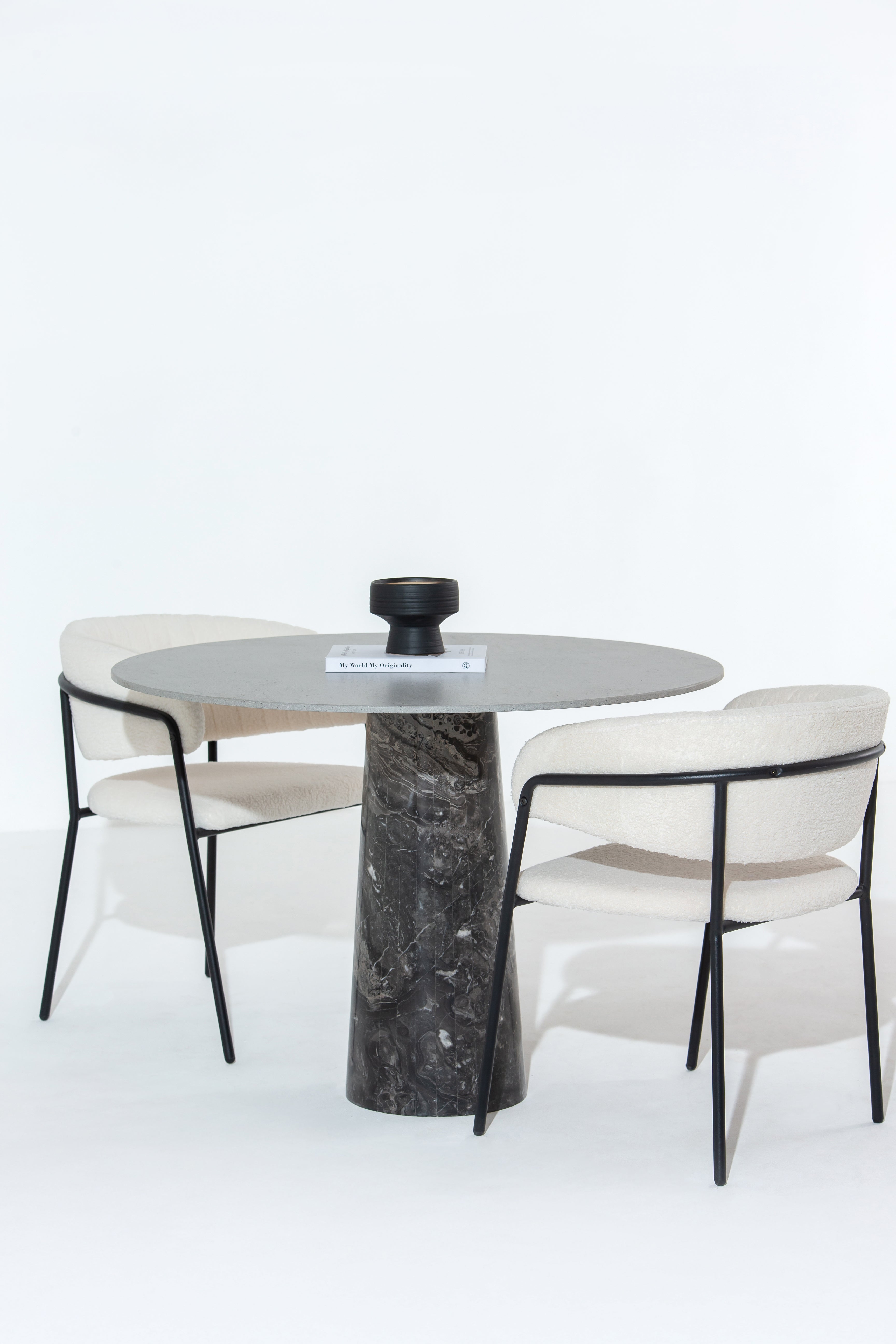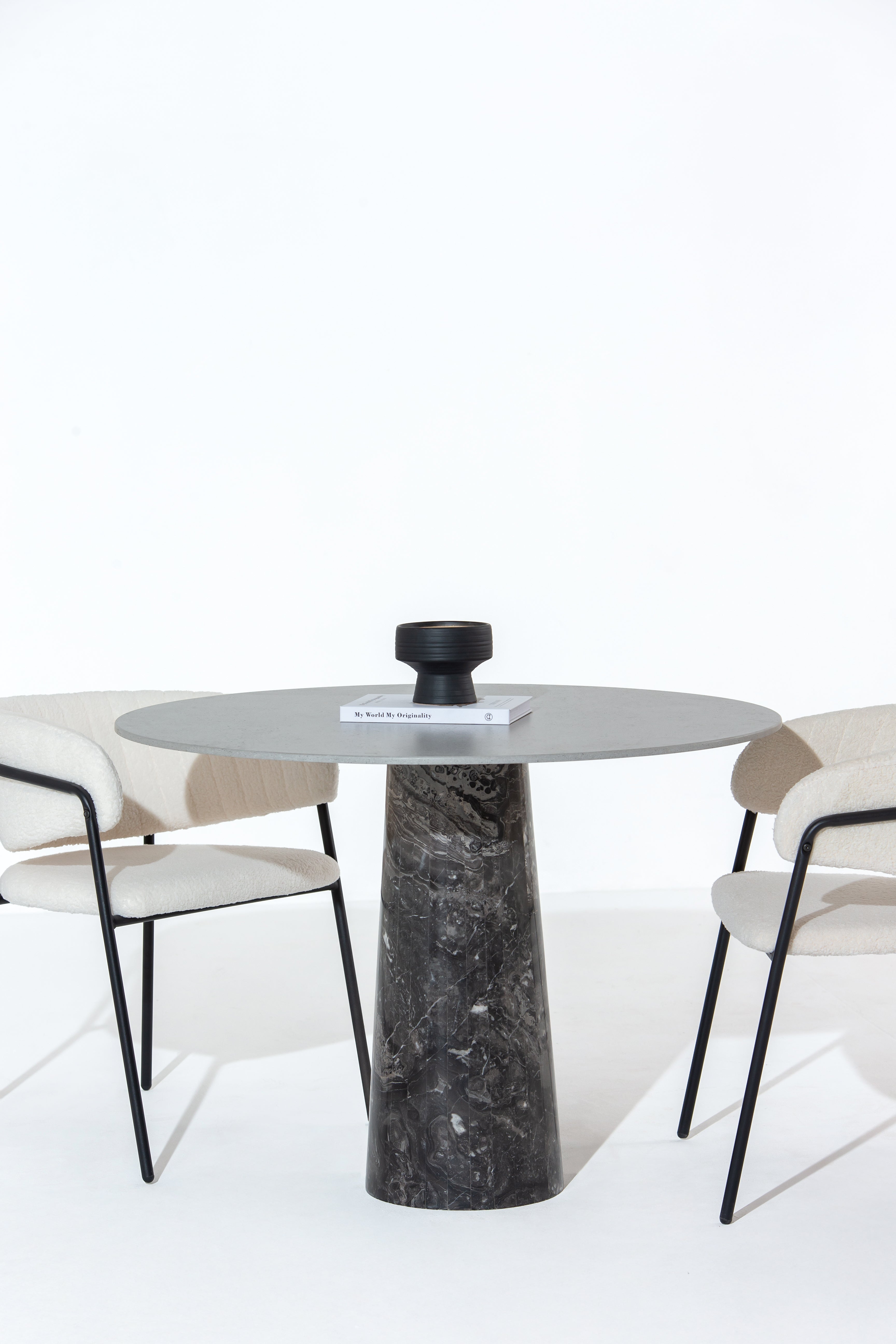 Contemporary elegance meets functional durability in this Dekton & Orobico Grey Dining Table. Designed with a minimalist profile and sculptural presence, it features a Dekton grey tabletop, known for its superior resistance to heat, stains, and scratches, ideal for everyday use without compromising on style. The table is anchored by a striking Orobico grey marble base, whose deep, swirling veining and natural tonal variation offer a luxurious  to the ultra-smooth surface above. Together, the combination of engineered and natural stone creates a visual dialogue between innovation and timeless materiality.