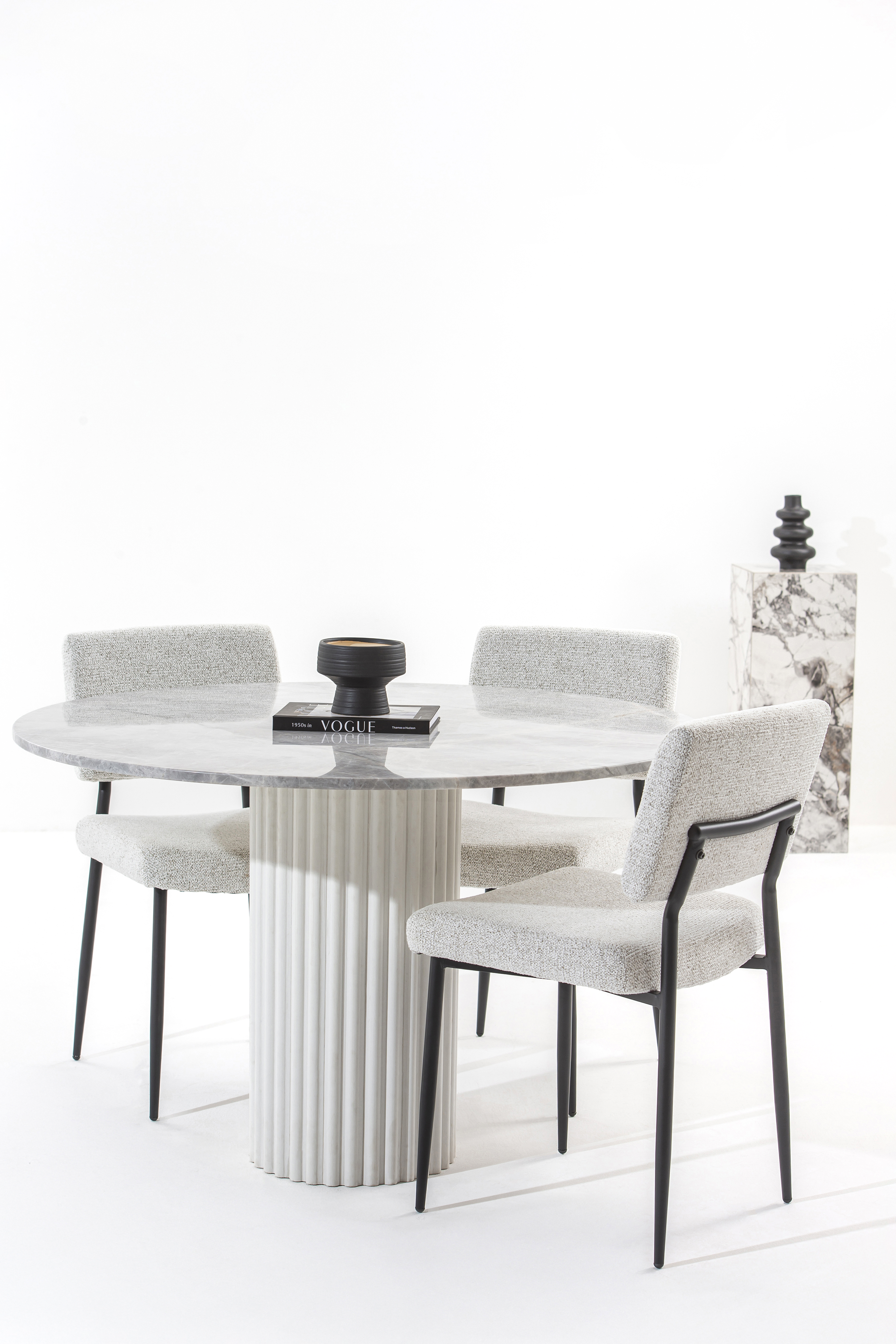 A refined balance of textures, this round dining table features a Fior De Pasco top resting on a striking white quartz fluted base. The natural veining enhances its organic charm, while the contrast between the warm Fior De Pasco and crisp quartz brings depth. Designed to complement both modern and classic interiors, it adds a touch of sophistication to any dining space.