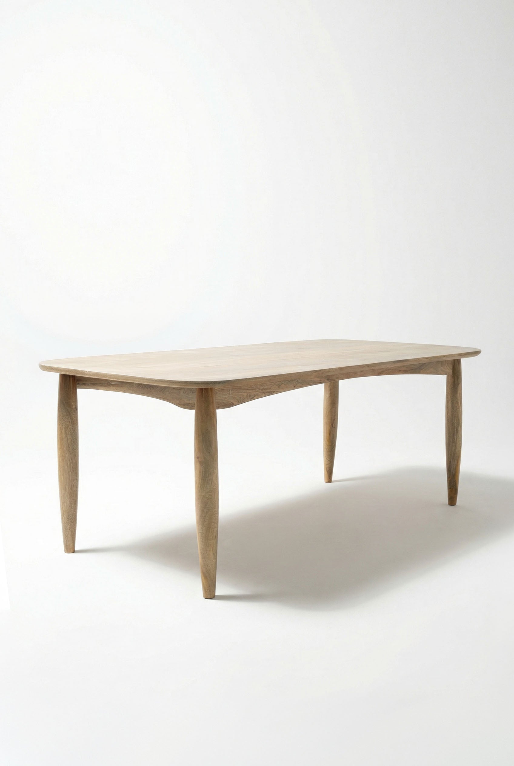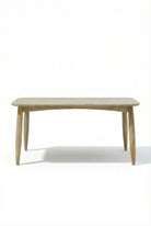 Crafted in a warm natural wood finish, this dining table features a smooth rectangular top with softly rounded edges and sculpted tapered legs that create a refined, organic silhouette. The visible wood grain adds depth and texture, bringing natural warmth and effortless elegance to your dining space. Its clean lines and balanced proportions allow you to gather, host, and style your interior with modern minimalism and timeless sophistication.