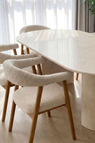 Enhance your dining room with this Crema Marfil stone dining table, featuring a polished marble-like surface, gentle natural veining, and sculptural half-moon legs ideal for modern, contemporary, and minimalist interiors. Designed for durability, elegance, and everyday function, this luxury stone dining table offers ample space for family meals, entertaining guests, and elevating your home with warm tones and timeless sophistication.