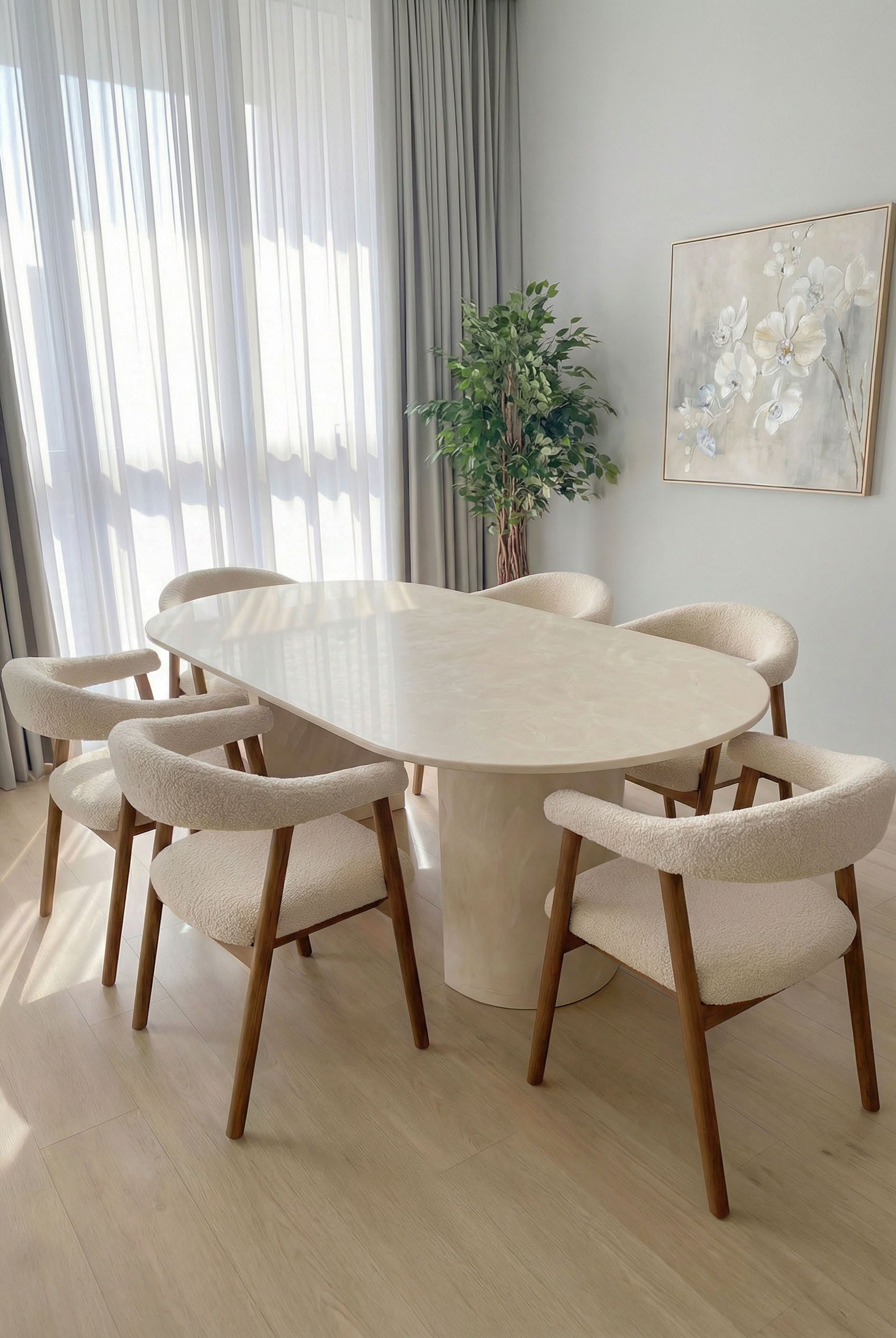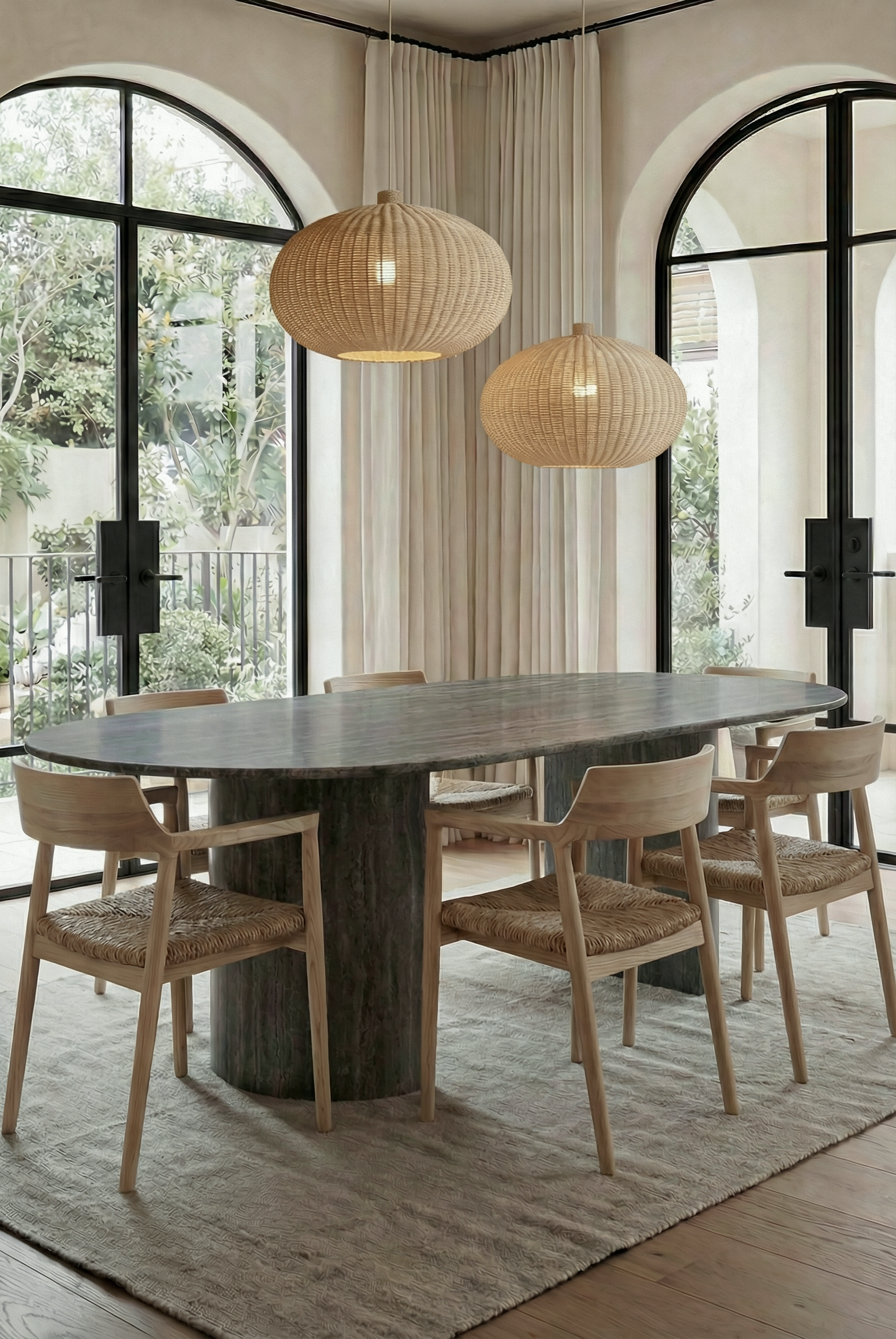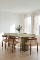 Designed to anchor the dining space with quiet confidence, this statement piece pairs sculptural half moon legs with a richly veined green stone surface that feels both refined and grounded. The smooth silhouette brings balance and softness to the bold material, creating a harmonious focal point for gatherings and everyday dining. Natural variations ensure every piece feels unique, while the solid construction offers lasting presence and elegance. Ideal for modern interiors that appreciate artisanal character and timeless design.