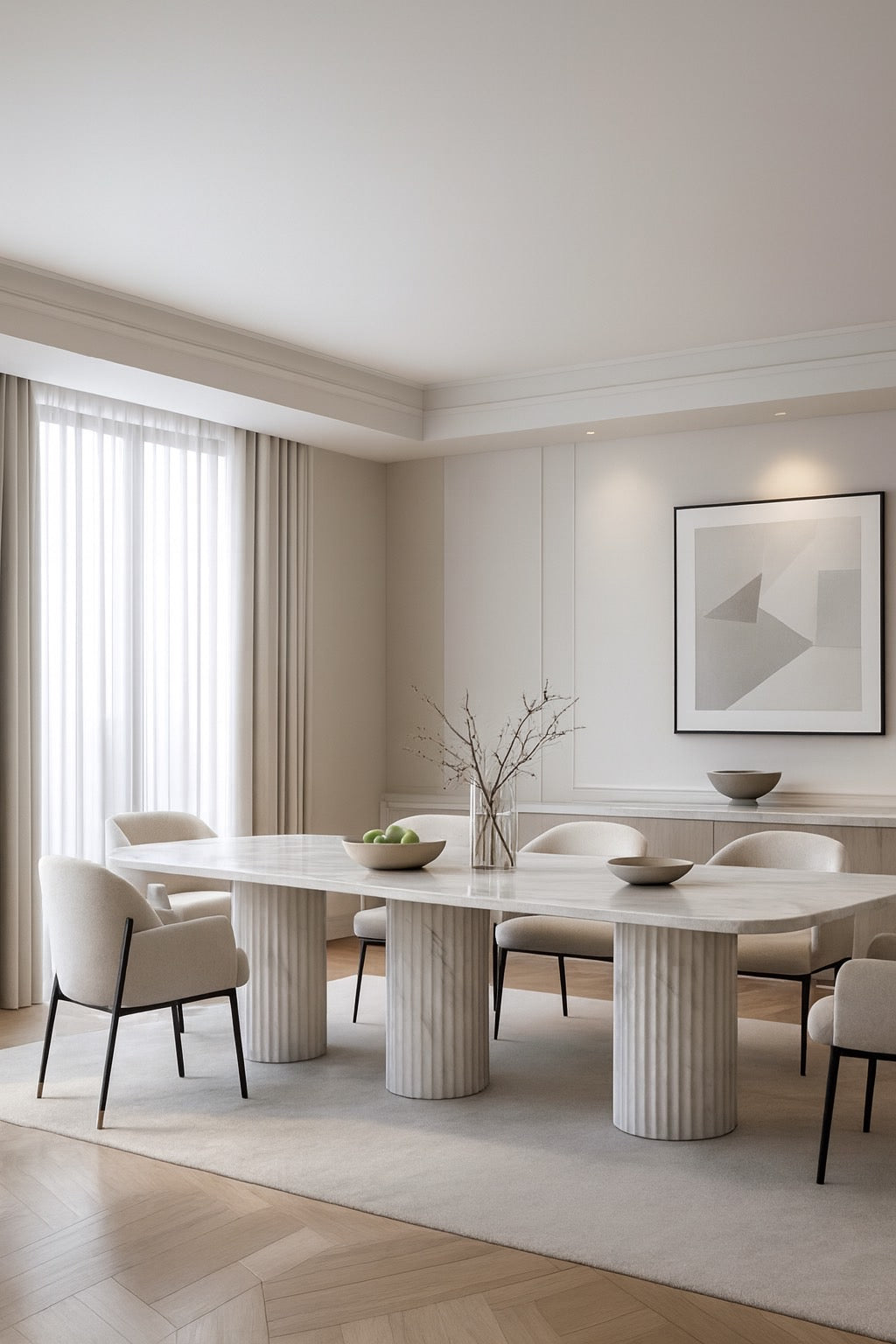 You elevate your dining space with a sculptural statement table crafted from Calacatta Beige stone that blends soft veining with warm natural elegance. The elongated silhouette rests on fluted column bases that add architectural depth, while the smooth polished top enhances light and texture in your room. Designed for modern and classic interiors alike, this refined centerpiece arrives in two perfectly matched slabs that join seamlessly to create a continuous surface with rich stone character. Whether hosting gatherings or enjoying quiet everyday moments, it brings harmony, durability and timeless sophistication to your home.