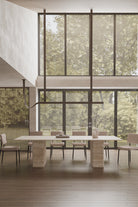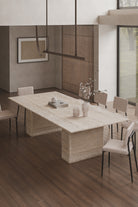 A masterpiece of modern elegance and natural charm. Crafted with a solid travertine top in warm beige tones, its organic veining tells the story of timeless stone artistry. The clean rectangular silhouette rests on two bold, block pedestal legs, creating a harmonious balance of strength and sophistication. Smooth to the touch yet visually textured, this luxury dining table becomes the heart of your gatherings, where style meets purpose. Perfect for contemporary, Mediterranean, or minimalist interiors, the Demeter invites you to dine, connect, and celebrate in refined taste.
