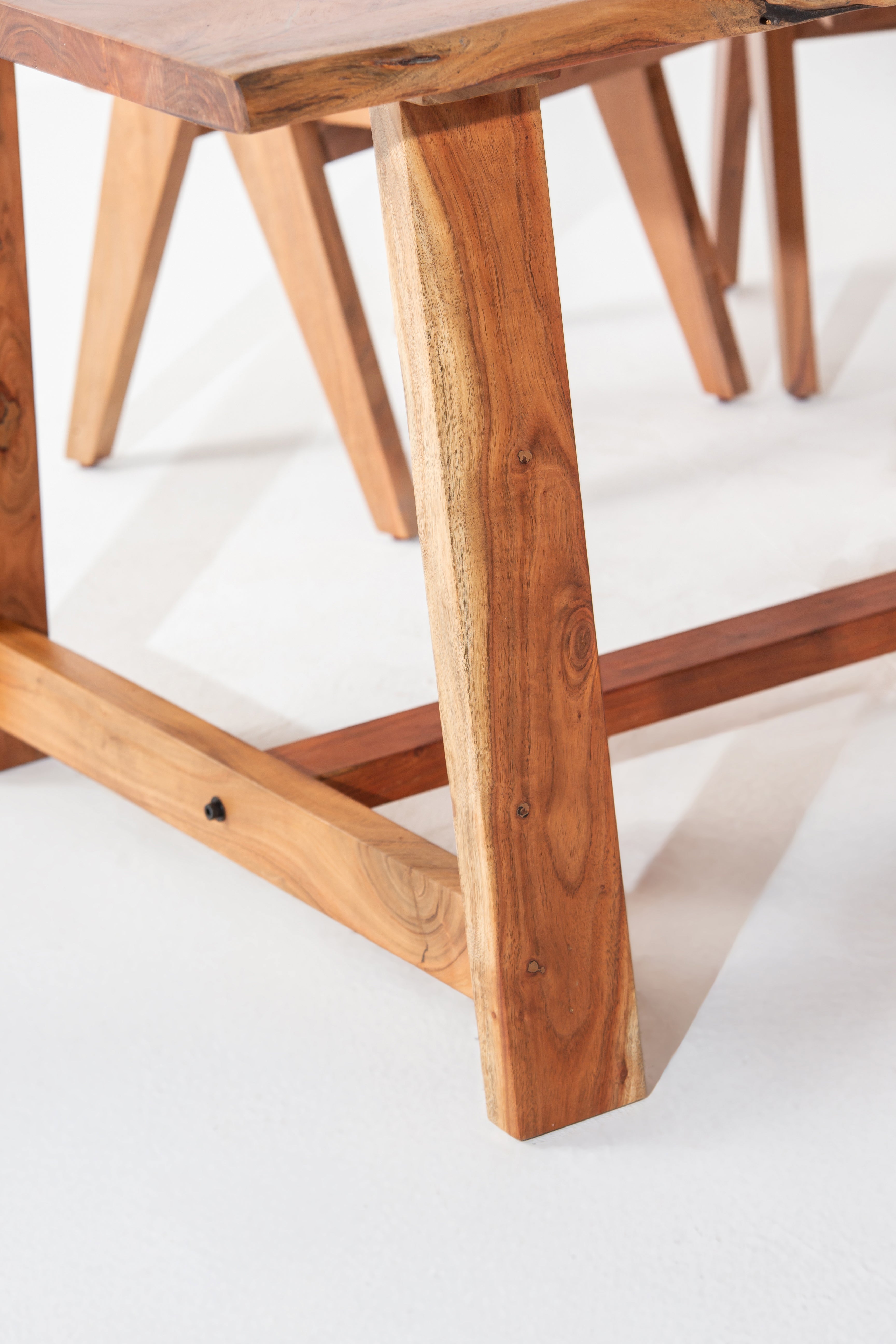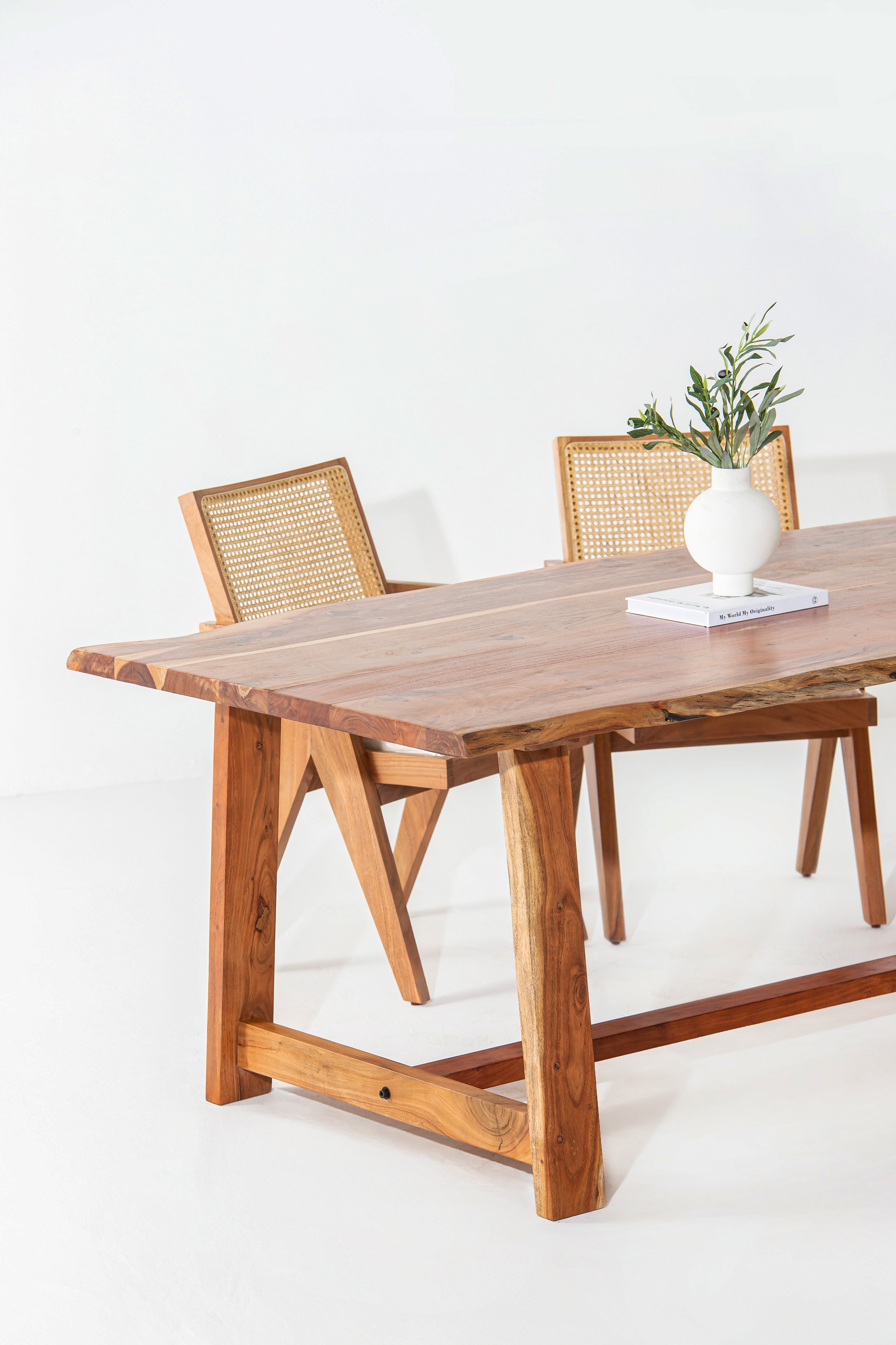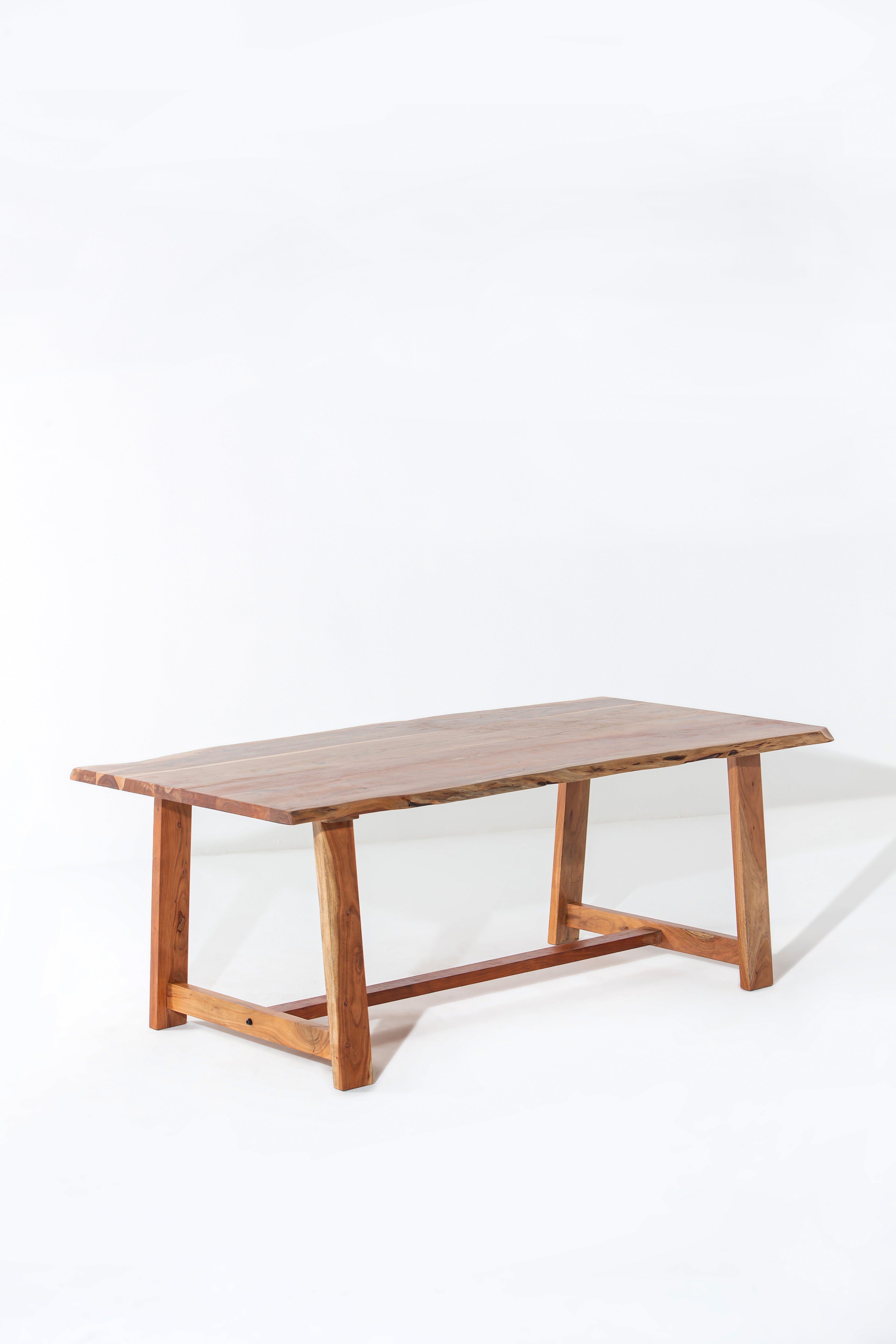 Crafted from richly grained acacia wood, this table showcases a natural live-edge profile that brings warmth and character to any dining or gathering space. Its organic lines and sturdy frame highlight the beauty of solid wood, while the warm tones and subtle variations in texture lend an earthy, timeless appeal. Designed for both style and durability, it serves as a centerpiece for modern, rustic, or minimalist interiors—perfect for everyday meals or hosting with ease.