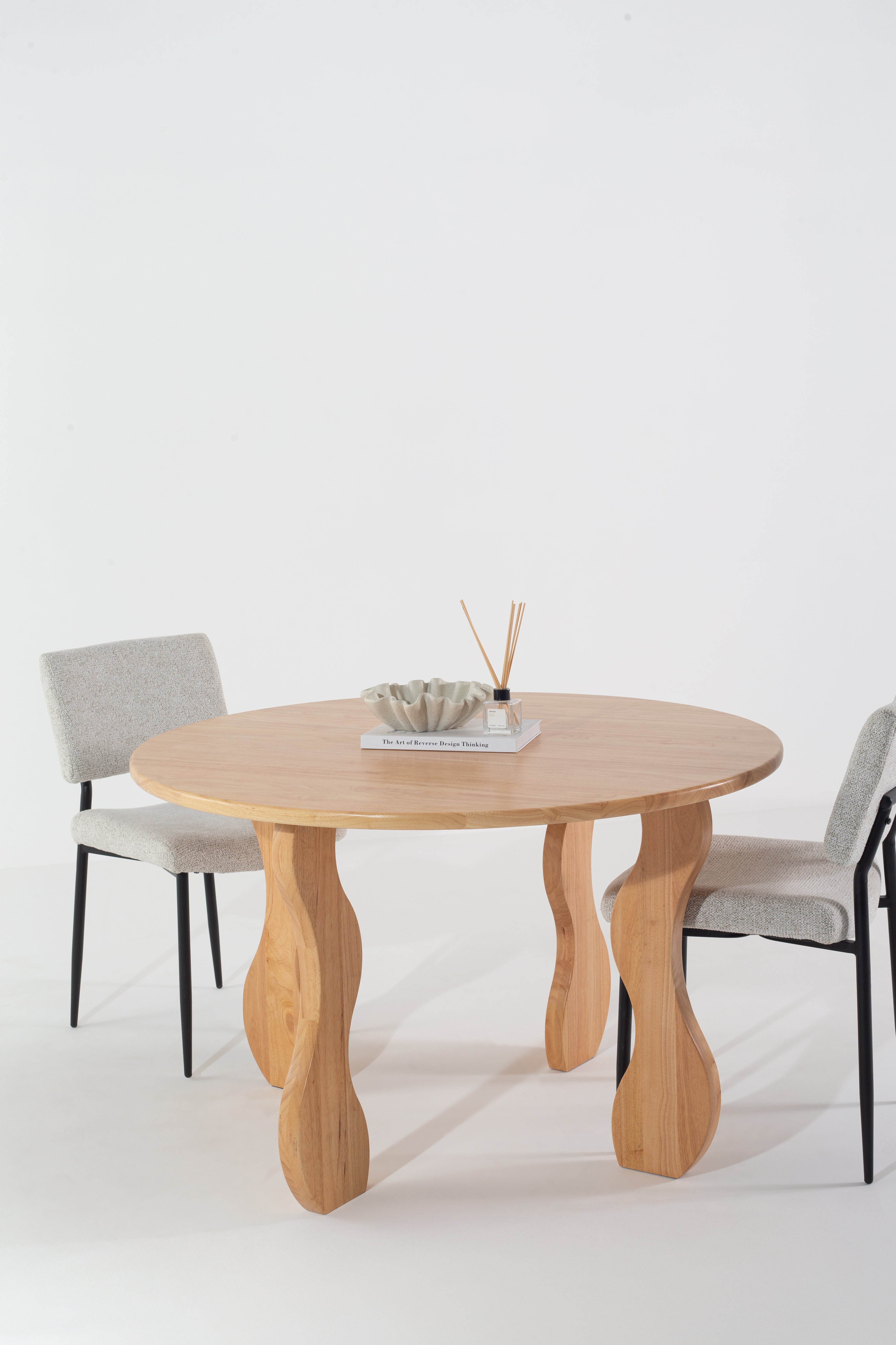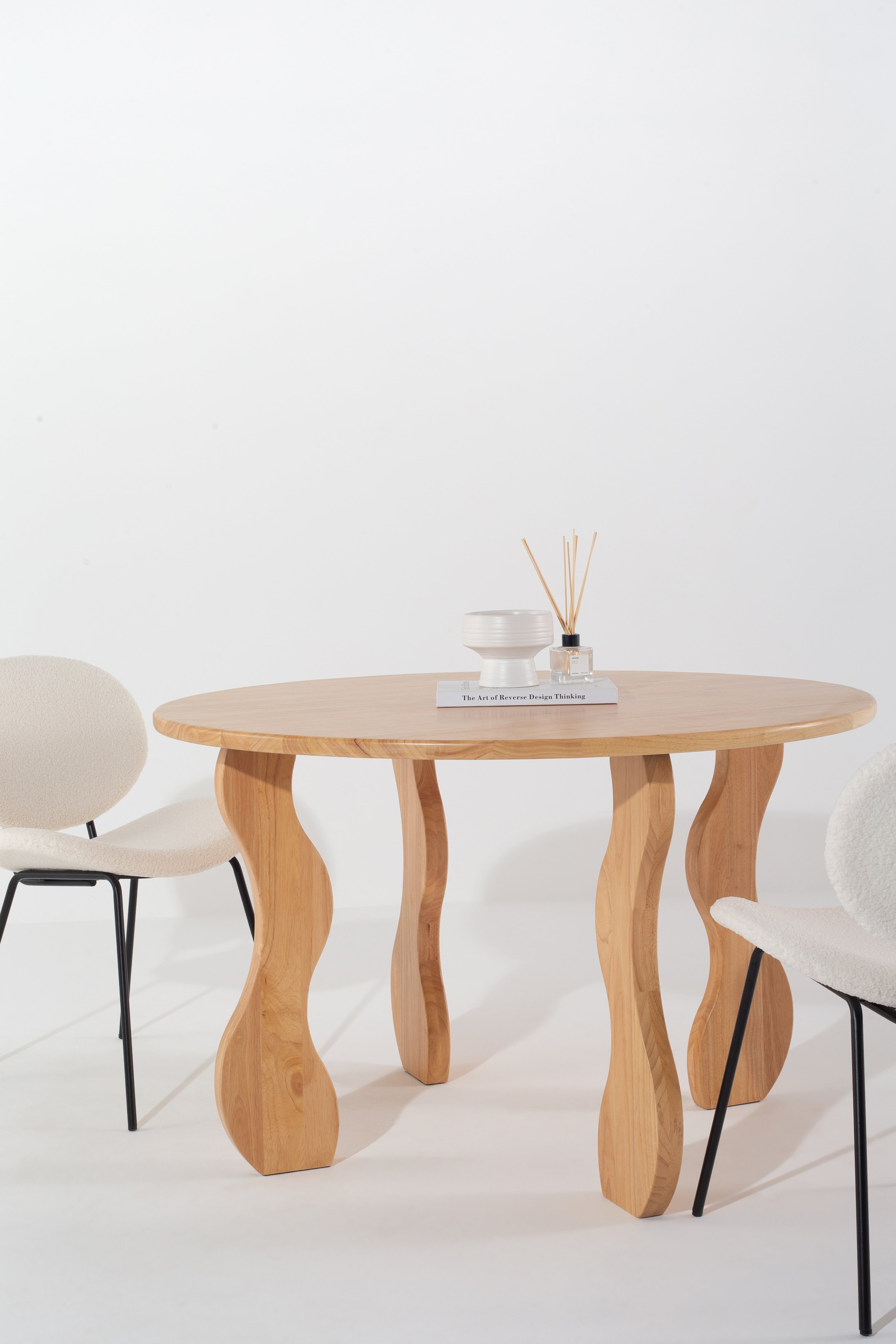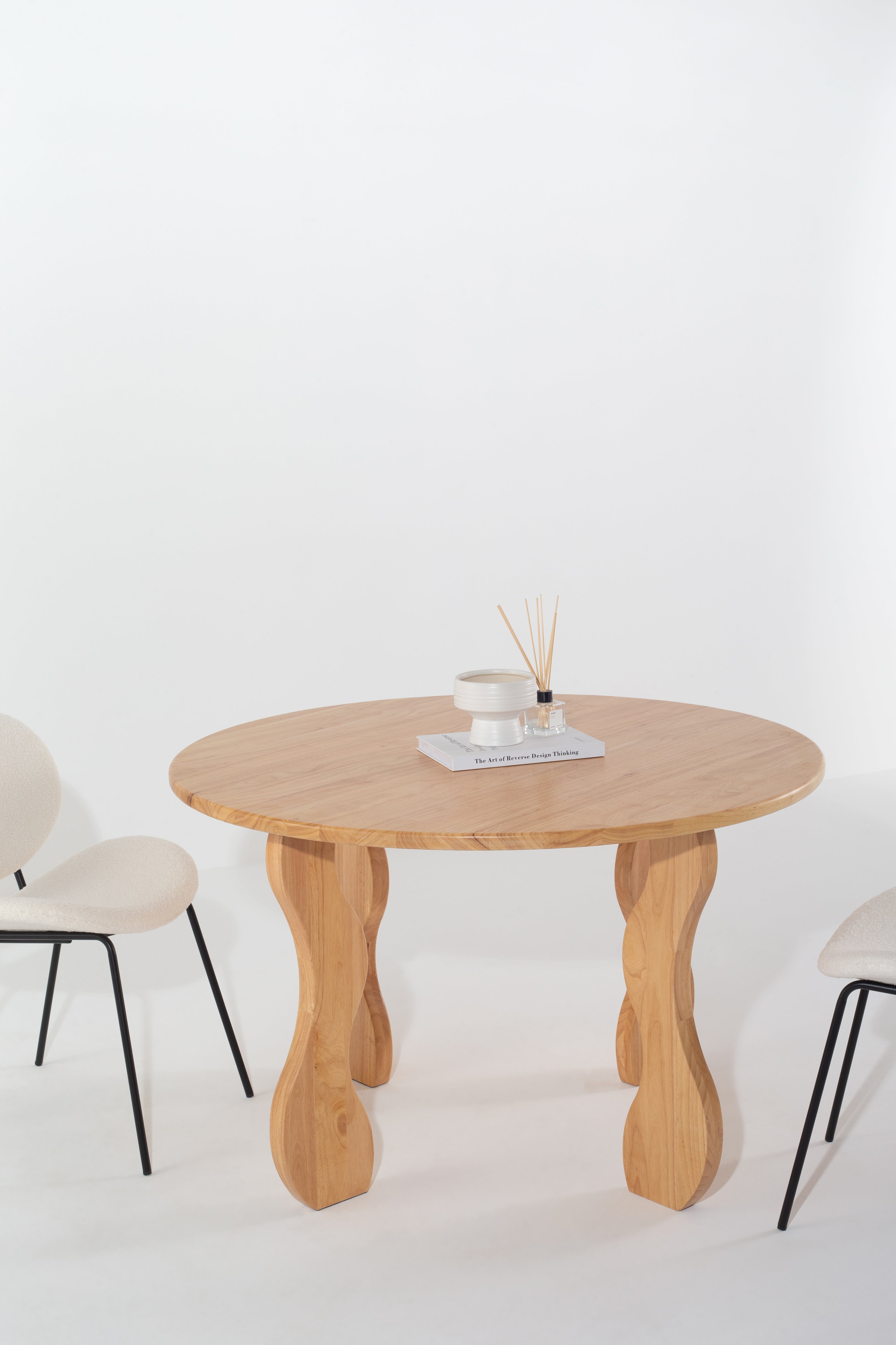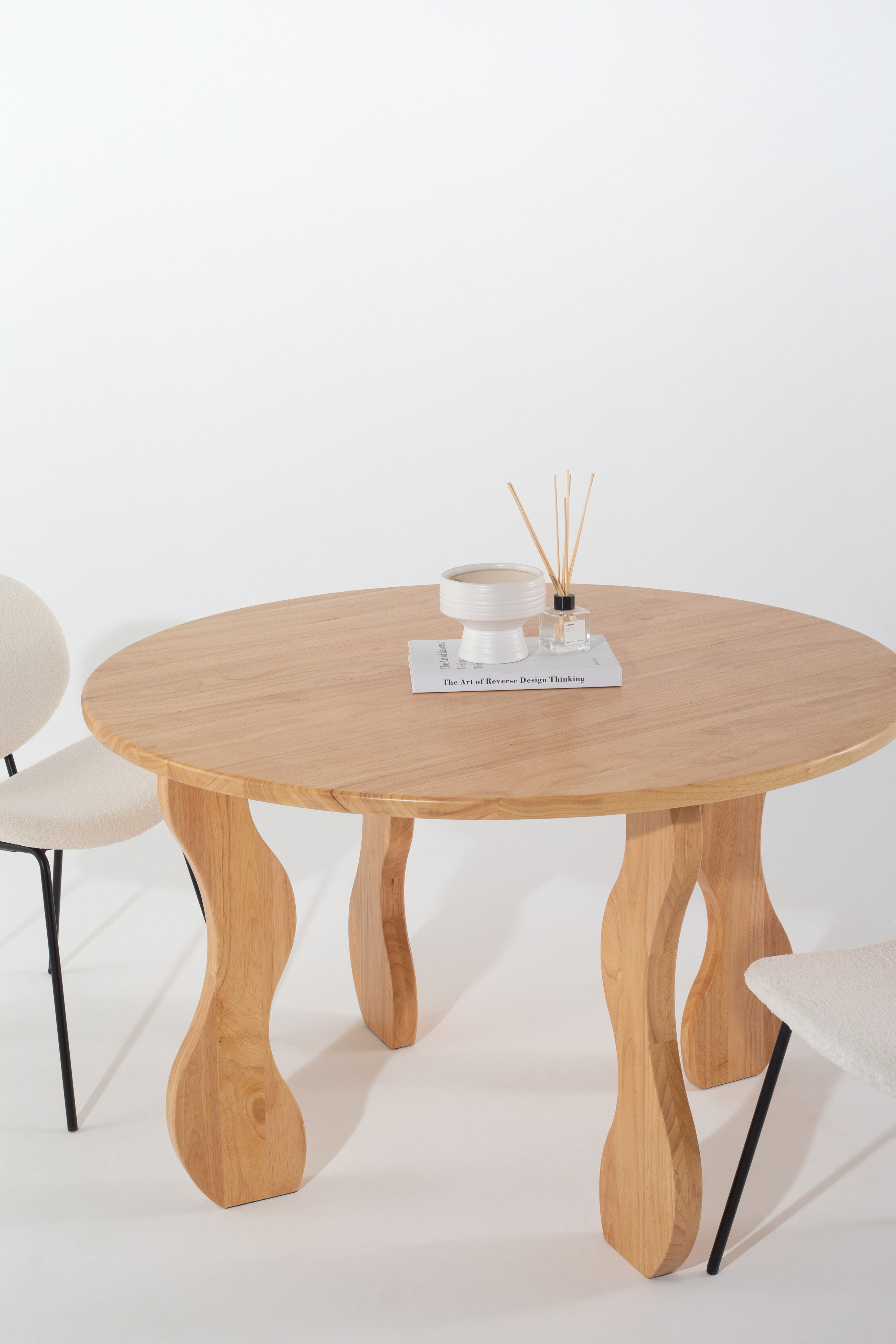 Make a statement in your dining space with this sculptural wooden dining table. Its round tabletop offers a smooth, natural finish, beautifully showcasing the organic wood grain. The standout feature? Bold, curved legs that add a touch of artistic flair while ensuring sturdy support. Whether hosting guests or enjoying a quiet meal, this table blends modern elegance with a timeless appeal. Perfect for contemporary, Scandinavian, or rustic interiors, it effortlessly becomes the focal point of any dining room.