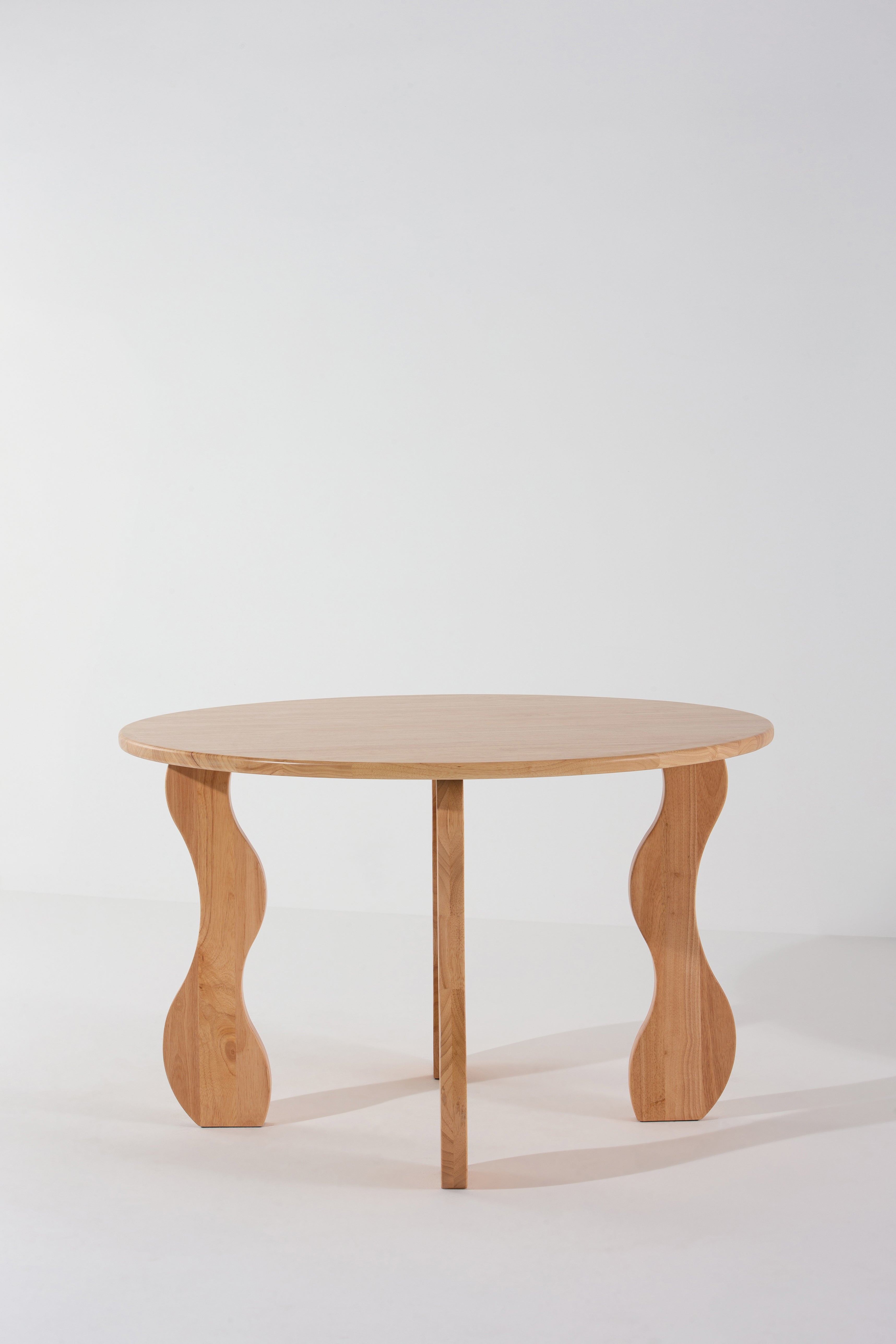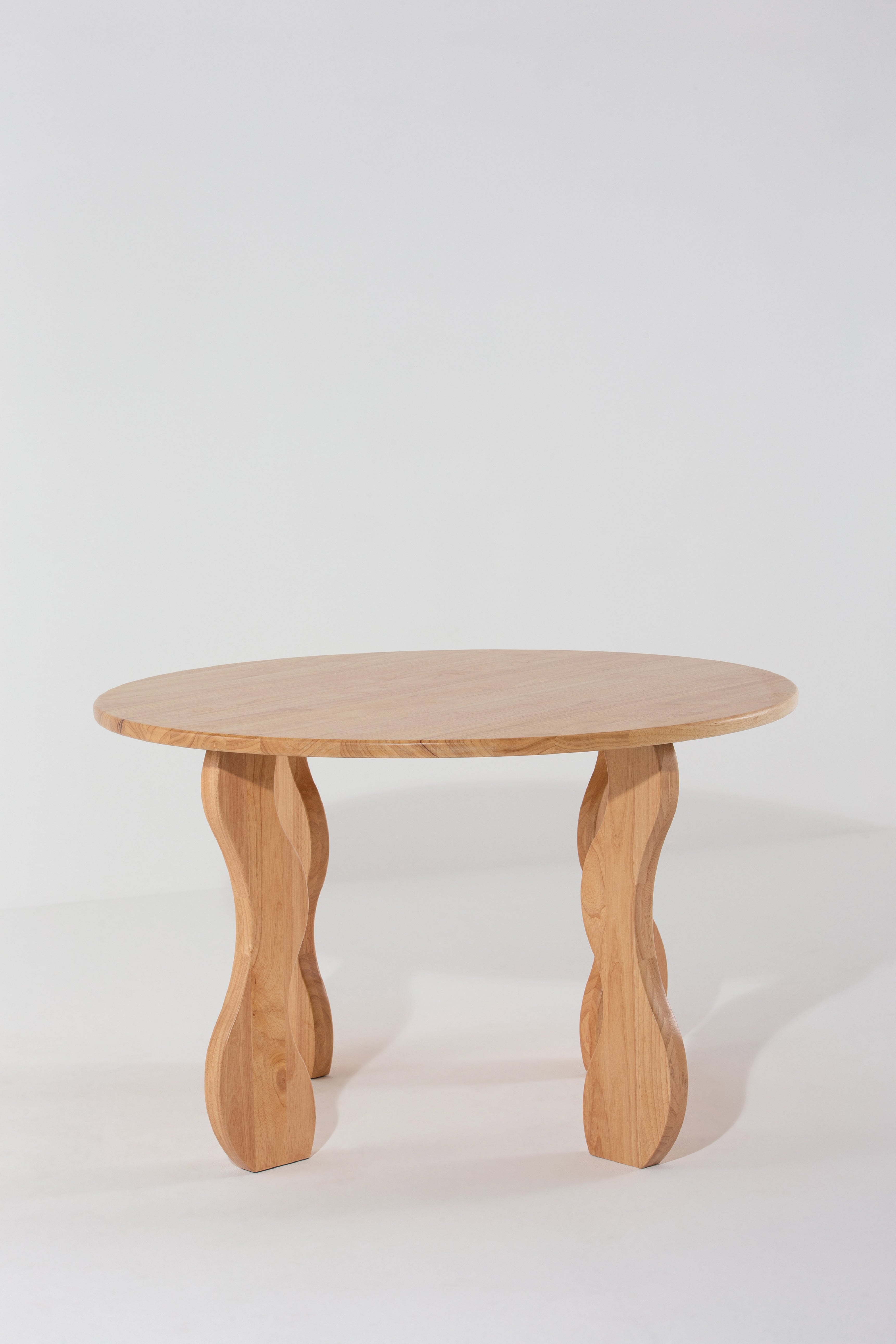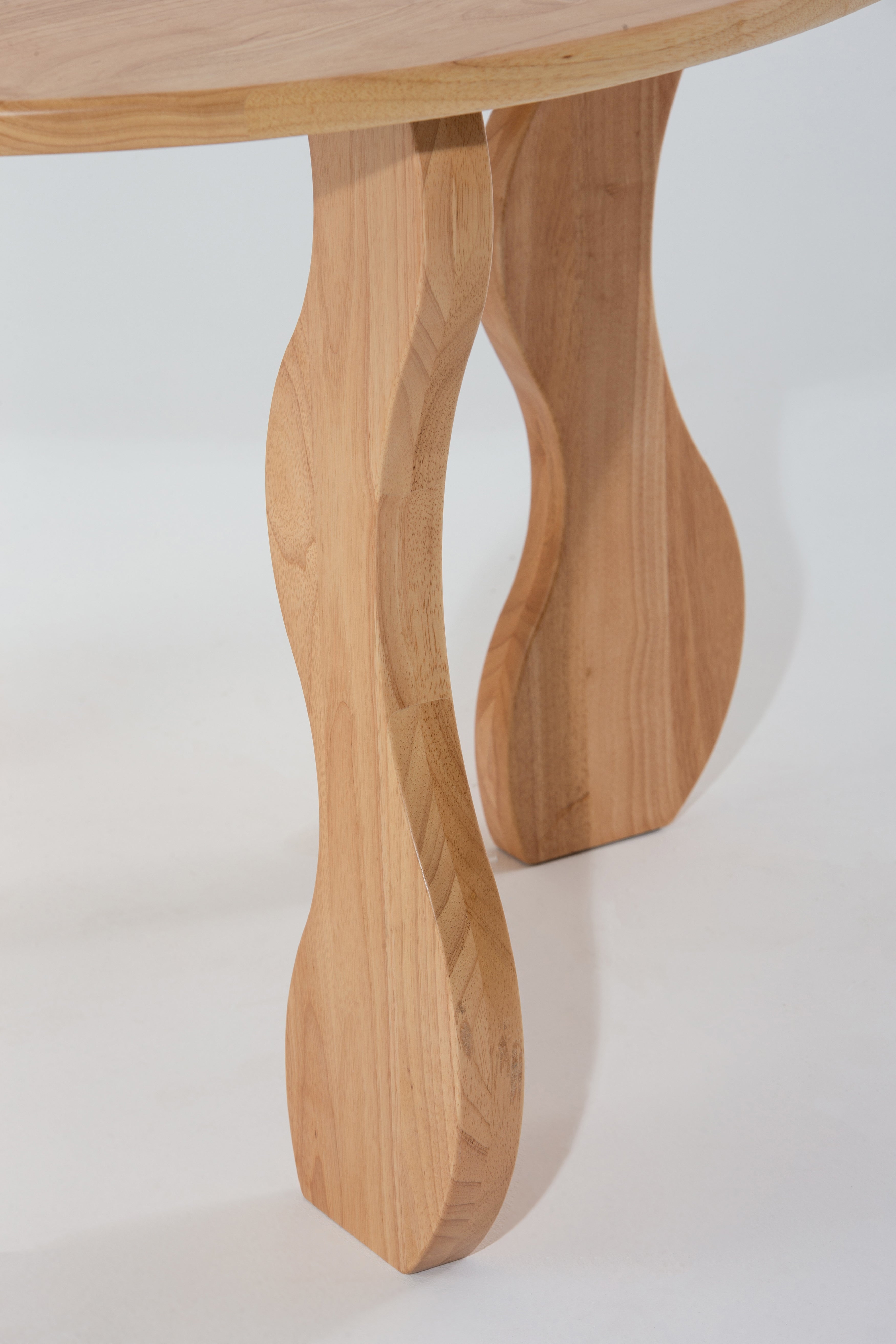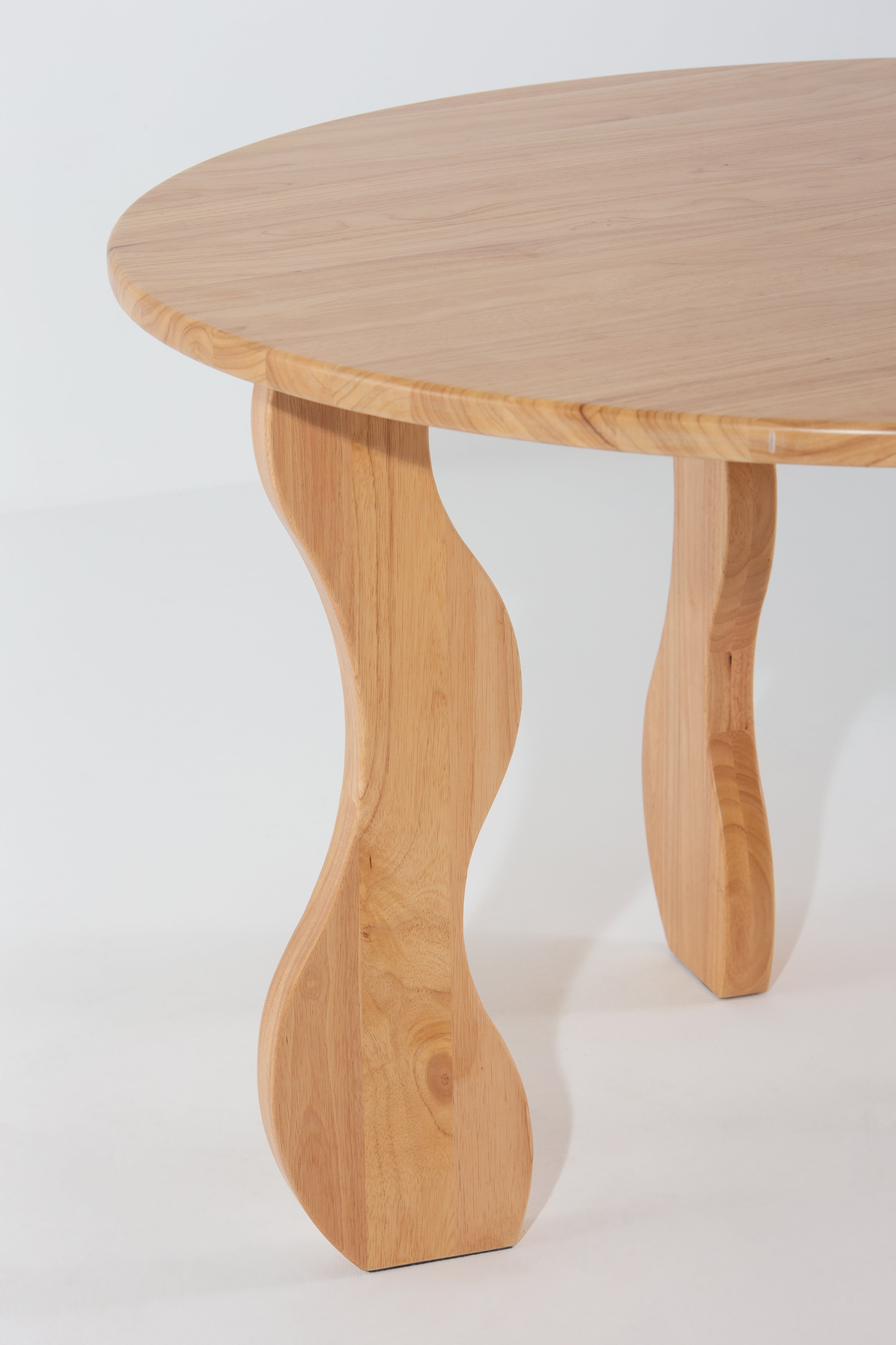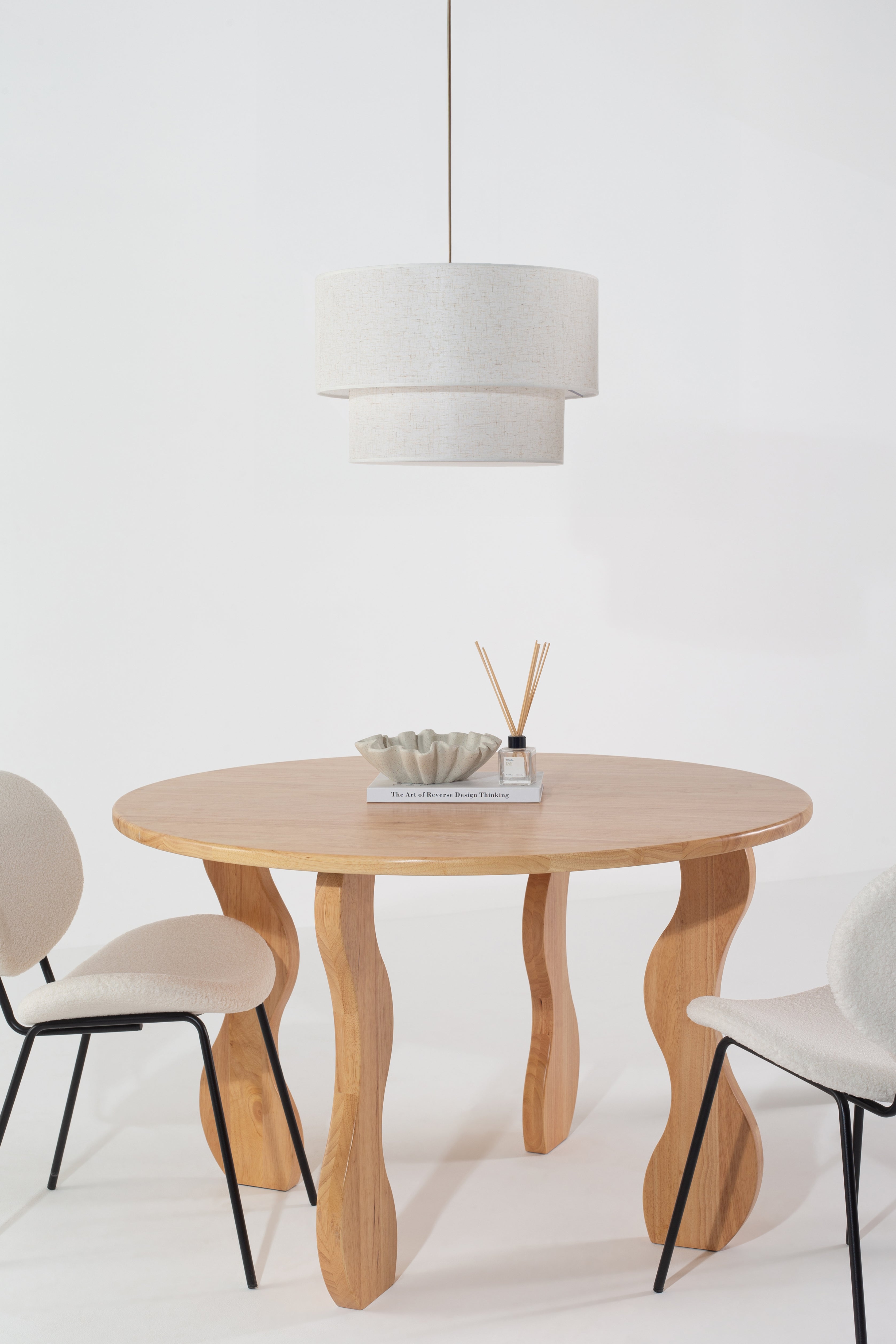 Make a statement in your dining space with this sculptural wooden dining table. Its round tabletop offers a smooth, natural finish, beautifully showcasing the organic wood grain. The standout feature? Bold, curved legs that add a touch of artistic flair while ensuring sturdy support. Whether hosting guests or enjoying a quiet meal, this table blends modern elegance with a timeless appeal. Perfect for contemporary, Scandinavian, or rustic interiors, it effortlessly becomes the focal point of any dining room.